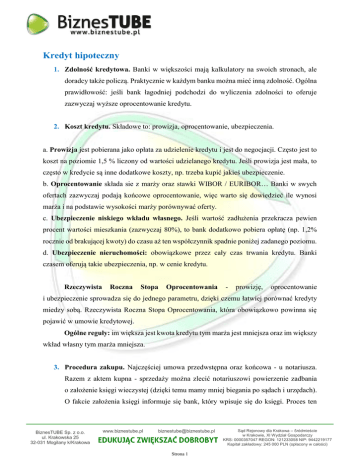 Kredyt hipoteczny 1. Zdolność kredytowa. Banki w większości mają kalkulatory na swoich stronach, ale doradcy także policzą. Praktycznie w każdym banku można mieć inną zdolność. Ogólna prawidłowość: jeśli bank łagodniej podchodzi do wyliczenia zdolności to oferuje zazwyczaj wyższe oprocentowanie kredytu. 2. Koszt kredytu. Składowe to: prowizja, oprocentowanie, ubezpieczenia. a. Prowizja jest pobierana jako opłata za udzielenie kredytu i jest do negocjacji. Często jest to koszt na poziomie 1,5 % liczony od wartości udzielanego kredytu. Jeśli prowizja jest mała, to często w kredycie są inne dodatkowe koszty, np. trzeba kupić jakieś ubezpieczenie. b. Oprocentowanie składa sie z marży oraz stawki WIBOR / EURIBOR… Banki w swych ofertach zazwyczaj podają końcowe oprocentowanie, więc warto się dowiedzieć ile wynosi marża i na podstawie wysokości marży porównywać oferty. c. Ubezpieczenie niskiego wkładu własnego. Jeśli wartość zadłużenia przekracza pewien procent wartości mieszkania (zazwyczaj 80%), to bank dodatkowo pobiera opłatę (np. 1,2% rocznie od brakującej kwoty) do czasu aż ten współczynnik spadnie poniżej zadanego poziomu. d. Ubezpieczenie nieruchomości: obowiązkowe przez cały czas trwania kredytu. Banki czasem oferują takie ubezpieczenia, np. w cenie kredytu. Rzeczywista Roczna Stopa Oprocentowania - prowizję, oprocentowanie i ubezpieczenie sprowadza się do jednego parametru, dzięki czemu łatwiej porównać kredyty miedzy sobą. Rzeczywista Roczna Stopa Oprocentowania, która obowiązkowo powinna się pojawić w umowie kredytowej. Ogólne reguły: im większa jest kwota kredytu tym marża jest mniejsza oraz im większy wkład własny tym marża mniejsza. 3. Procedura zakupu. Najczęściej umowa przedwstępna oraz końcowa - u notariusza. Razem z aktem kupna - sprzedaży można zlecić notariuszowi powierzenie zadbania o założenie księgi wieczystej (dzięki temu mamy mniej biegania po sądach i urzędach). O fakcie założenia księgi informuje się bank, który wpisuje się do księgi. Proces ten BiznesTUBE Sp. z o.o. ul. Krakowska 25 32-031 Mogilany k/Krakowa www.biznestube.pl [email protected] Strona 1 Sąd Rejonowy dla Krakowa – Śródmieście w Krakowie, XI Wydział Gospodarczy KRS: 0000357047 REGON: 121233058 NIP: 9442219177 Kapitał zakładowy: 245 000 PLN (opłacony w całości) trwa nawet 6 miesięcy i w tym czasie płacimy podwyższone oprocentowanie (od 1 do 2%). 4. Złotówki czy waluta? Waluta ma niższy libor (stopa procentowa) od złotówek, ale obecnie kredyt walutowy jest trudniej wziąć. Popularne są kredyty w euro i frankach szwajcarskich, ale istnieje pewne ryzyko związane z kredytem w walucie. Kurs waluty zmienia się w czasie, a to ma wpływ na wysokość raty. Największe ryzyko istnieje w momencie zaciągania kredytu: przeliczany jest na złotówki po aktualnym kursie. Dla biorących kredyt w walucie im wyższy jest kurs waluty tym lepiej. 5. Rodzaje kredytów walutowych: a. denominowane - bank przyznaje określoną kwotę waluty i jeśli w czasie pomiędzy przyznaniem a wypłatą kurs spadnie, to trzeba z własnej kieszeni dołożyć pozostałą część kwoty. Jeśli kurs wzrośnie, to nadwyżka może być zaliczona na poczet spłaty kredytu lub dostajemy trochę więcej na np. wykończenie mieszkania. Zazwyczaj jest możliwość spłaty bezpośrednio w walucie. b. indeksowany - dostajemy tyle złotówek ile miało być, ale w zależności od kursu kwota kredytu wyrażona w walucie może być różna. Zazwyczaj spłaca się w złotówkach. 6. Wcześniejsza spłata. Zwykle banki na kilka lat blokują możliwość wcześniejszej spłaty (np. poprzez dodatkowe opłaty, jeśli decydujemy się nadpłacać spłatę kredytu w ciągu pierwszych 5 lat). Rożnie jest to zapisane w umowie i czasem udaje się to ominąć, np. gdy nie można spłacić wcześniej całej kwoty, to można spłacić całość pomniejszoną o ostatnią ratę, a tę ostatnią zgodnie z harmonogramem. 7. Do obsługi kredytu najczęściej trzeba założyć konto w danym banku i warto się dowiedzieć czy będzie ono darmowe czy płatne, bo nawet kilka złotych miesięcznie przez lata daje sporą kwotę! • Raty annuitetowe (powszechnie zwane równymi lub stałymi): ich wysokość ustalana jest za pomocą skomplikowanego matematycznego wzoru, który ma za zadanie wyliczyć jednakową wysokość każdej raty przez cały okres kredytowania. W tym wariancie spłat na początku spłacane są głównie odsetki i bardzo niewielka część kapitału. Kapitał spłacany jest przede wszystkim w końcowej fazie kredytowania. BiznesTUBE Sp. z o.o. ul. Krakowska 25 32-031 Mogilany k/Krakowa www.biznestube.pl [email protected] Strona 2 Sąd Rejonowy dla Krakowa – Śródmieście w Krakowie, XI Wydział Gospodarczy KRS: 0000357047 REGON: 121233058 NIP: 9442219177 Kapitał zakładowy: 245 000 PLN (opłacony w całości) • Raty malejące – kwota kredytu dzielona jest prze ilość rat, a uzyskana kwota stanowi niezmienną przez cały okres kredytowania część kapitałową raty. Zmienna jest za to część odsetkowa raty. Będzie ona wyższa na początku, a w miarę, jak kapitał jest spłacany maleje. Tym samym przy niezmiennej wysokości raty kapitałowej i malejącej z miesiąca na miesiąc kwocie odsetek do zapłaty, maleje wysokość całej raty. a) b) Rys. 1. Porównanie rat malejących (a) oraz annuitetowych (b) Zabezpieczenia dodatkowe Ubezpieczenie na życie – doping, aby nie odchodzić w trakcie trwania umowy kredytowej, co się czasem dzieje… Zabezpieczenie na ten stan rzeczy… Ubezpieczenie od niezdolności do pracy i utraty pracy – ubezpieczenie to zabezpiecza bank przed takim rozwojem wydarzeń. Ubezpieczenie od ryzyka, jakie ponosi bank, do czasu ustanowienia prawomocnej hipoteki w księdze wieczystej nieruchomości. Sądy działają z dużym opóźnieniem, na wpis hipoteczny czeka się nawet po kilka miesięcy, n
