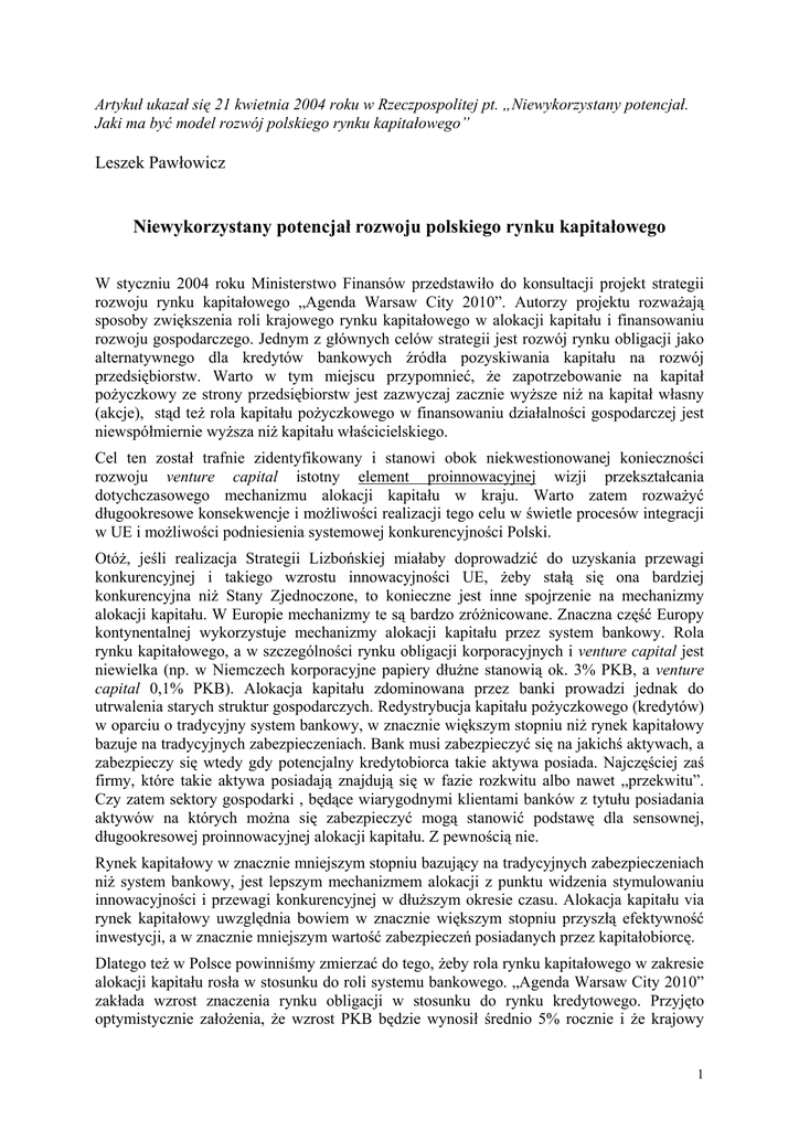 Artykuł ukazał się 21 kwietnia 2004 roku w Rzeczpospolitej pt. „Niewykorzystany potencjał. Jaki ma być model rozwój polskiego rynku kapitałowego” Leszek Pawłowicz Niewykorzystany potencjał rozwoju polskiego rynku kapitałowego W styczniu 2004 roku Ministerstwo Finansów przedstawiło do konsultacji projekt strategii rozwoju rynku kapitałowego „Agenda Warsaw City 2010”. Autorzy projektu rozważają sposoby zwiększenia roli krajowego rynku kapitałowego w alokacji kapitału i finansowaniu rozwoju gospodarczego. Jednym z głównych celów strategii jest rozwój rynku obligacji jako alternatywnego dla kredytów bankowych źródła pozyskiwania kapitału na rozwój przedsiębiorstw. Warto w tym miejscu przypomnieć, że zapotrzebowanie na kapitał pożyczkowy ze strony przedsiębiorstw jest zazwyczaj zacznie wyższe niż na kapitał własny (akcje), stąd też rola kapitału pożyczkowego w finansowaniu działalności gospodarczej jest niewspółmiernie wyższa niż kapitału właścicielskiego. Cel ten został trafnie zidentyfikowany i stanowi obok niekwestionowanej konieczności rozwoju venture capital istotny element proinnowacyjnej wizji przekształcania dotychczasowego mechanizmu alokacji kapitału w kraju. Warto zatem rozważyć długookresowe konsekwencje i możliwości realizacji tego celu w świetle procesów integracji w UE i możliwości podniesienia systemowej konkurencyjności Polski. Otóż, jeśli realizacja Strategii Lizbońskiej miałaby doprowadzić do uzyskania przewagi konkurencyjnej i takiego wzrostu innowacyjności UE, żeby stałą się ona bardziej konkurencyjna niż Stany Zjednoczone, to konieczne jest inne spojrzenie na mechanizmy alokacji kapitału. W Europie mechanizmy te są bardzo zróżnicowane. Znaczna część Europy kontynentalnej wykorzystuje mechanizmy alokacji kapitału przez system bankowy. Rola rynku kapitałowego, a w szczególności rynku obligacji korporacyjnych i venture capital jest niewielka (np. w Niemczech korporacyjne papiery dłużne stanowią ok. 3% PKB, a venture capital 0,1% PKB). Alokacja kapitału zdominowana przez banki prowadzi jednak do utrwalenia starych struktur gospodarczych. Redystrybucja kapitału pożyczkowego (kredytów) w oparciu o tradycyjny system bankowy, w znacznie większym stopniu niż rynek kapitałowy bazuje na tradycyjnych zabezpieczeniach. Bank musi zabezpieczyć się na jakichś aktywach, a zabezpieczy się wtedy gdy potencjalny kredytobiorca takie aktywa posiada. Najczęściej zaś firmy, które takie aktywa posiadają znajdują się w fazie rozkwitu albo nawet „przekwitu”. Czy zatem sektory gospodarki , będące wiarygodnymi klientami banków z tytułu posiadania aktywów na których można się zabezpieczyć mogą stanowić podstawę dla sensownej, długookresowej proinnowacyjnej alokacji kapitału. Z pewnością nie. Rynek kapitałowy w znacznie mniejszym stopniu bazujący na tradycyjnych zabezpieczeniach niż system bankowy, jest lepszym mechanizmem alokacji z punktu widzenia stymulowaniu innowacyjności i przewagi konkurencyjnej w dłuższym okresie czasu. Alokacja kapitału via rynek kapitałowy uwzględnia bowiem w znacznie większym stopniu przyszłą efektywność inwestycji, a w znacznie mniejszym wartość zabezpieczeń posiadanych przez kapitałobiorcę. Dlatego też w Polsce powinniśmy zmierzać do tego, żeby rola rynku kapitałowego w zakresie alokacji kapitału rosła w stosunku do roli systemu bankowego. „Agenda Warsaw City 2010” zakłada wzrost znaczenia rynku obligacji w stosunku do rynku kredytowego. Przyjęto optymistycznie założenia, że wzrost PKB będzie wynosił średnio 5% rocznie i że krajowy 1 rynek korporacyjnych papierów dłużnych będzie rozwijał się znacznie szybciej niż wzrost PKB. Tablica 1. Projekcja wzrostu rynku papierów dłużnych w okresie 2003 – 1010 w strategii rozwoju rynku kapitałowego „Agenda Warsaw City 2010” lata PKB w mld zł Wartość rynku papierów dłużnych w mld zł Udział emisji papierów dłużnych przedsiębiorstw w PKB w% 2003 2004 2005 2006 2007 2008 2009 2010 800 840 882 931 984 1033 1084 1139 16 21 27 37 49 62 76 91 2 2,5 3 4 5 6 7 8 Źródło: Strategia rozwoju rynku kapitałowego „Agenda Warsaw City 2010”, Ministerstwo Finansów, styczeń 2004 Jednocześnie stwierdza się, że zagrożeniem tego procesu może być otwarcie na zagraniczne rynki finansowe i poszukiwanie przez przedsiębiorstwa finansowania poza granicami kraju. Zagrożenie to oceniane jest jako niewielkie ponieważ „potrzeby kredytowe zgłaszane przez polskie przedsiębiorstwa w postaci emitowanych papierów dłużnych nie są na tyle duże, żeby wzbudzić zainteresowanie na międzynarodowych rynkach finansowych i w ciągu najbliższych kilku lat będą kierowane wyłącznie na rynek krajowy” („Agenda Warsaw City 2010” s. 30). Tak jednak nie jest. Najlepiej ilustruje to struktura zadłużenia polskich przedsiębiorstw w ostatnich latach uwzględniająca podział na zadłużenie zagraniczne i krajowe. Generalnie od czterech lat obserwujemy stagnację w zakresie aktywności kredytowej banków krajowych w obszarze tzw. złotowych kredytów korporacyjnych i umiarkowaną aktywność w obszarze kredytów walutowych. Ilustruje to tablica 2. Tablica 2. Należności monetarnych instytucji finansowych od przedsiębiorstw w latach 2000 – 2003 (w mld zł) lata należności od przedsiębiorstw Należności złotowe w mld zł Należności walutowe w mld zł Razem 2000 2001 2002 2003 89 91 91 89 32 34 36 41 121 125 127 130 Źródło: NBP Stagnacji na krajowym rynku kredytów korporacyjnych towarzyszy natomiast znaczna dynamika zadłużenia zagranicznego przedsiębiorstw krajowych. Ilustruje to tablica 3. 2 Tablica 3. Zadłużenie zagraniczne sektora pozarządowego i pozabankowego w latach 2000 – 2003 (w mld zł) lata rodzaj zadłużenia zagranicznego 2000 2001 2002 2003 stan na koniec III kw. Kredyty inwestorów bezpośrednich 37 41 46 50 Dłużn