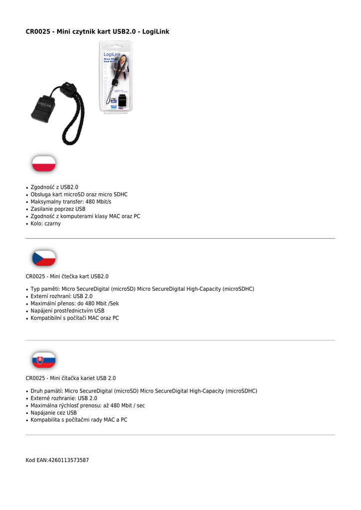 CR0025 - Mini czytnik kart USB2.0 - LogiLink ● ● ● ● ● ● Zgodność z USB2.0 Obsługa kart microSD oraz micro SDHC Maksymalny transfer: 480 Mbit/s Zasilanie poprzez USB Zgodność z komputerami klasy MAC oraz PC Kolo: czarny CR0025 - Mini čtečka kart USB2.0 ● ● ● ● ● Typ paměti: Micro SecureDigital (microSD) Micro SecureDigital High-Capacity (microSDHC) Externí rozhraní: USB 2.0 Maximální přenos: do 480 Mbit /Sek Napájení prostřednictvím USB Kompatibilní s počítači MAC oraz PC CR0025 - Mini čítačka kariet USB 2.0 ● ● ● ● ● Druh pamätí: Micro SecureDigital (microSD) Micro SecureDigital High-Capacity (microSDHC) Externé rozhranie: USB 2.0 Maximálna rýchlosť prenosu: až 480 Mbit / sec Napájanie cez USB Kompabilita s počítačmi rady MAC a PC Kod EAN:4260113573587
