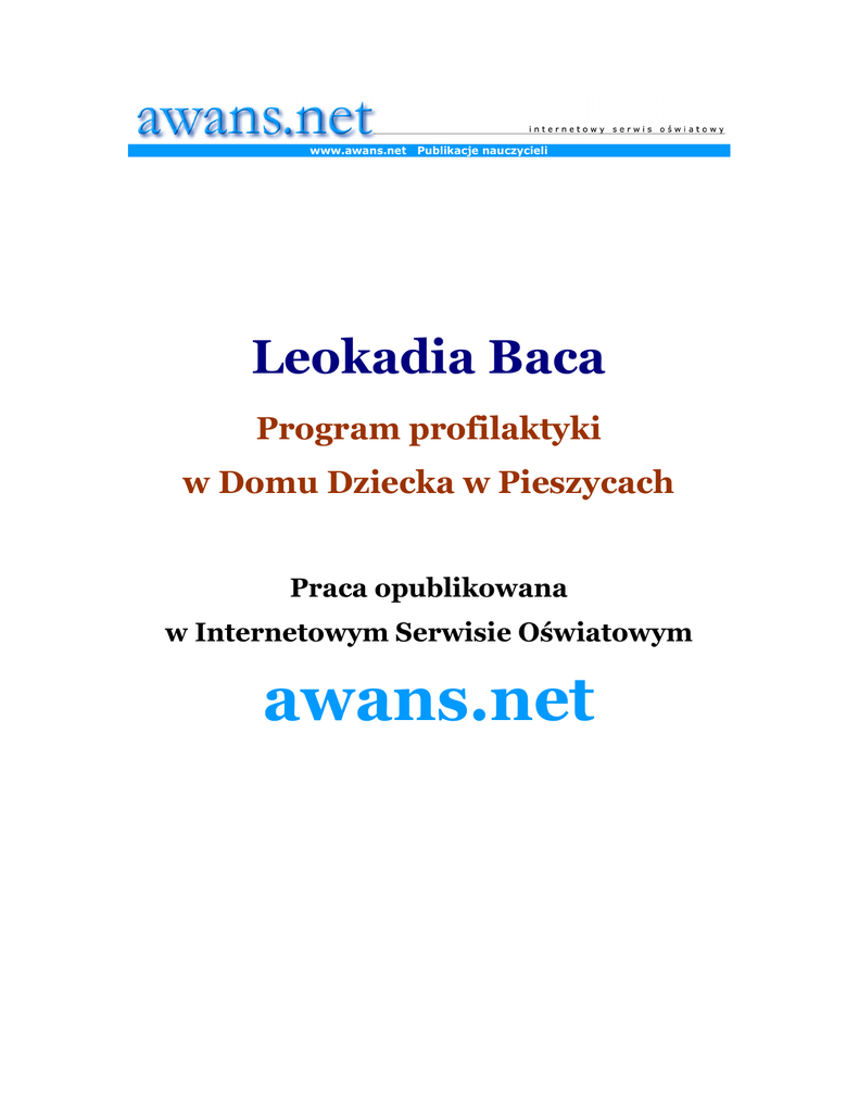 WST P W ostatnich latach nasilaj b d ce wynikiem zachwiania braku rozkładu równowagi przestrzegania w si wi zi, tradycyjnych funkcjonowaniu niektórych W konsekwencji kształtuje si negatywne procesy społeczne, norm autorytetów, niektórych moralnych i instytucji, społecznych. niekorzystne zjawisko nieprzystosowania społecznego dzieci i młodzie y. Problem ten z ró nym nasileniem wyst puje równie w ród wychowanków naszego domu. W zwi zku z tym konieczne stało si opracowanie programu, którego celem jest zapobieganie wszelkim przejawom patologii, które niestety wyst puj w naszej społeczno ci. Przeciwdziałanie niedostosowaniu społecznemu jest spraw przedstawionego poni ej programu profilaktycznego, priorytetow , jednak maj c na wzgl dzie wieloletnie do wiadczenia w pracy opieku czo - wychowawczej w niniejszym programie uj li my równie profilaktyki prozdrowotnej, zagadnienia dotycz ce tematyki uzale nie , niepowodze szkolnych oraz bezpiecze stwa dzieci i młodzie y. Z pewno ci ów program docelowo b dzie ulegał ró nym modyfikacjom, cech młodych ludzi jest nastawienie na rozwój bowiem charakterystyczn i zmiany, d enie do coraz pełniejszego zaspakajania potrzeb. Ich liczba natomiast ro nie wraz z przemianami społeczno - kulturowymi i technologiczno - cywilizacyjnymi. Tak wi c mog pojawi si nowe formy niedostosowania społecznego b d inne nieprawidłowo ci w ró nych sferach ycia jednostki, których nawet wzorcowy nie zweryfikuje. Wyra amy nadziej , program profilaktyczny e ten zredagowany przez nas, pozwoli na skuteczne przeciwdziałanie negatywnym zjawiskom, wyst puj cym w codziennym yciu naszego domu, poniewa uj te w nim problemy s dobrze rozpoznane i zdiagnozowane. Warunkiem powodzenia opracowanego programu profilaktycznego placówki b dzie jego spójno z programem wychowawczym, regulaminem wychowanków i planem pracy domu dziecka, a przede wszystkim cisła współpraca i jednolito oddziaływa opieku czo-wychowawczych zespołu pedagogów, pracuj cych z dzie mi i młodzie . CELE PROGRAMU: • Tworzenie bezpiecznej, ciepłej atmosfery w naszym domu • Ograniczenie zachowa agresywnych i przemocy • Wyeliminowanie aktów wandalizmu (niszczenia mienia placówki) • Wzmacnianie poczucia własnej warto ci • Nauka i wiczenie zachowa asertywnych • Wzbudzanie w wychowankach poczucia odpowiedzialno ci za własne zdrowie • Rozpoznawanie oznak stresu oraz sposobów radzenia sobie z nim • Rozwijanie umiej tno ci radzenia sobie z napi ciem pojawiaj cym si w trudnych sytuacjach • Przybli enie znaczenia pozytywnego my lenia • Wskazywanie na szkodliwo u ywek oraz ukazywanie zagro e , jakie nios ze sob uzale nienia • Propagowanie zdrowego stylu ycia • Wskazywanie po danych wzorców zachowa • Budowanie wi zi z domem dziecka • Zapoznanie ze sposobami bezpiecznego poruszania si w ruchu ulicznym oraz podczas ró nego rodzaju zabaw, gier i innych form aktywno ci fizycznej • Wskazywanie warto ciowych form sp dzania czasu wolnego • Samokształcenie wychowawców pod k tem profilaktyki uzale nie FORMY PRACY: praca indywidualna oraz zaj cia w grupach. METODY I TECHNIKI PRACY: 1. Rozmowy indywidualne. 2. Pogadanki. 3. Zaj cia praktyczne. 4. Inscenizacje, gry dydaktyczne. 5. Pokazy. 6. Wyj cia. 7. Spotkania z przedstawicielami ró nego rodzaju instytucji. SPODZIEWANE EFEKTY: - zmniejszenie zjawiska przemocy w placówce, - ograniczenie takich przejawów niedostosowania społecznego jak: palenie tytoniu, spo ywanie alkoholu, rodków odurzaj cych, wagarów, ucieczek z placówki, kradzie y, aktów wandalizmu, - wzrost wiedzy wychowanków na temat przemocy, uzale nie oraz przeciwdziałanie im, - umiej tne radzenie sobie w sytuacjach zetkni cia z przemoc i uzale nieniami, - wychowankowie naucz si pozytywnych zachowa oraz wła ciwego postrzegania i rozumienia ludzi, - wychowankowie b d umieli dokonywa warto ciowych i sensownych wyborów, - wychowankowie naucz si mówi o tym, o czym my l , b d wyra a swoje uczucia oraz szanowa i identyfikowa si z uczuciami innych. Zadanie I: Zapobieganie przejawom niedostosowania społecznego i zjawiskom patologicznym Tre : Spo ywanie alkoholu i za ywanie narkotyków jako czynnik przest pczy. Działania profilaktyczne: - zorganizowanie Komendy spotkania Powiatowej z Policji inspektorem i s dzi ds. S du pod hasłem „Alkohol i narkotyki, a przest pczo nieletnich Rejonowego nieletnich”, - projekcja filmów, ukazuj cych negatywne skutki picia alkoholu i za ywania rodków odurzaj cych w kontek cie wchodzenia w konflikty z prawem, - przeprowadzanie rozmów wychowawczych, dyskusji na dany temat, z wykorzystaniem dost pnej literatury i artykułów prasowych. Tre : Subkultury młodzie owe o pejoratywnym charakterze. Działania profilaktyczne: - zaj cia w grupach, zdiagnozowanie wiedzy i pogl dów wychowanków na temat subkultur młodzie owych (ankieta) - spotkanie z grup młodzie y, przedstawienie negatywnych skutków, jakie poci ga za sob uczestnictwo w subkulturach młodzie owych, których ideologia ra co narusza normy i zasady współ ycia społecznego (na podstawie zebranych materiałów w prasie, internecie oraz oraz z wykorzystaniem dost pnych filmów, nagra itp.) Tre : Wagary i ucieczki z placówki. Działania profilaktyczne: - rozpoznanie przyczyn opuszczania zaj lekcyjnych - sonda diagnostyczny, - ustalenie konkretnych form przekazu informacji mi dzy szkoł a domem dziecka oraz systematyczna kontrola obecno ci w szkole, - współpraca ze szkołami pod k tem eliminowania niewła ciwych stosunków interpersonalnych mi dzy uczniami (zastraszanie, wymuszenia, poni anie, na miewanie si ), które równie mog by przyczyn wagarowania, - zapewnienie powodzenia szkolnego jako jeden z czynników zapobiegania wagarom, - okre lenie przyczyn ucieczek z domu dziecka (rozmowy indywidualne, ankieta), - otoczenie szczególn opiek wychowanków w pocz tkowej fazie ich pobytu w domu dziecka, - stworzenie rodzinnej, serdecznej, ciepłej atmosfery we wzajemnych kon