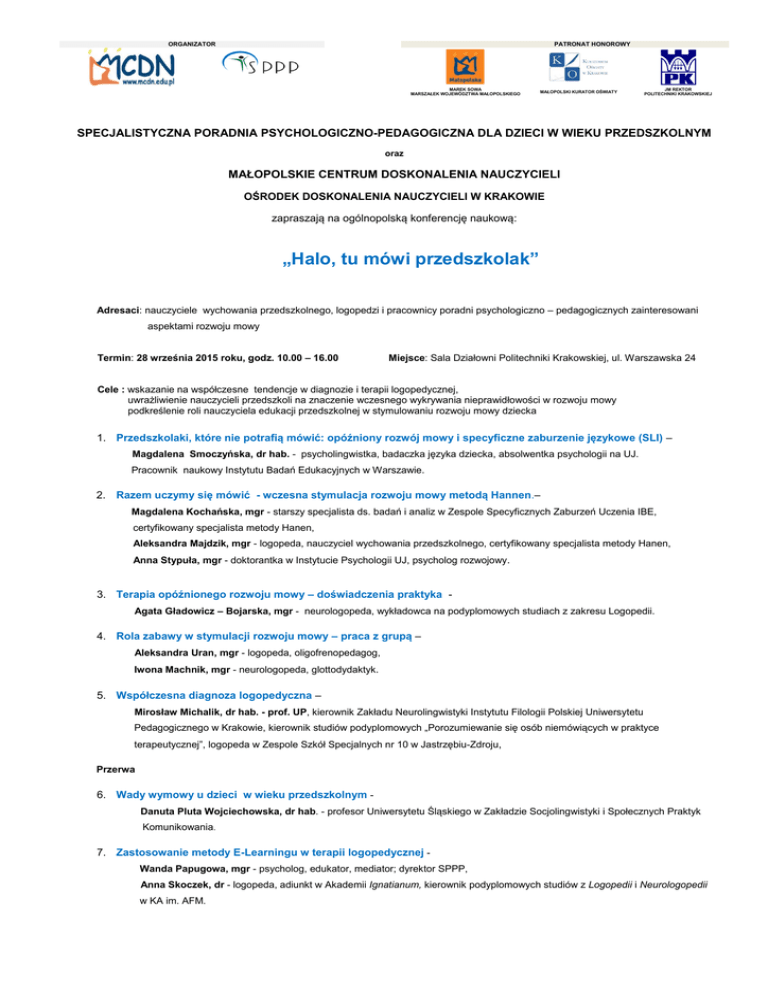 ORGANIZATOR PATRONAT HONOROWY MAREK SOWA MARSZAŁEK WOJEWÓDZTWA MAŁOPOLSKIEGO MAŁOPOLSKI KURATOR OŚWIATY JM REKTOR POLITECHNIKI KRAKOWSKIEJ SPECJALISTYCZNA PORADNIA PSYCHOLOGICZNO-PEDAGOGICZNA DLA DZIECI W WIEKU PRZEDSZKOLNYM oraz MAŁOPOLSKIE CENTRUM DOSKONALENIA NAUCZYCIELI OŚRODEK DOSKONALENIA NAUCZYCIELI W KRAKOWIE zapraszają na ogólnopolską konferencję naukową: „Halo, tu mówi przedszkolak” Adresaci: nauczyciele wychowania przedszkolnego, logopedzi i pracownicy poradni psychologiczno – pedagogicznych zainteresowani aspektami rozwoju mowy Termin: 28 września 2015 roku, godz. 10.00 – 16.00 Miejsce: Sala Działowni Politechniki Krakowskiej, ul. Warszawska 24 Cele : wskazanie na współczesne tendencje w diagnozie i terapii logopedycznej, uwrażliwienie nauczycieli przedszkoli na znaczenie wczesnego wykrywania nieprawidłowości w rozwoju mowy podkreślenie roli nauczyciela edukacji przedszkolnej w stymulowaniu rozwoju mowy dziecka 1. Przedszkolaki, które nie potrafią mówić: opóźniony rozwój mowy i specyficzne zaburzenie językowe (SLI) – Magdalena Smoczyńska, dr hab. - psycholingwistka, badaczka języka dziecka, absolwentka psychologii na UJ. Pracownik naukowy Instytutu Badań Edukacyjnych w Warszawie. 2. Razem uczymy się mówić - wczesna stymulacja rozwoju mowy metodą Hannen.– Magdalena Kochańska, mgr - starszy specjalista ds. badań i analiz w Zespole Specyficznych Zaburzeń Uczenia IBE, certyfikowany specjalista metody Hanen, Aleksandra Majdzik, mgr - logopeda, nauczyciel wychowania przedszkolnego, certyfikowany specjalista metody Hanen, Anna Stypuła, mgr - doktorantka w Instytucie Psychologii UJ, psycholog rozwojowy. 3. Terapia opóźnionego rozwoju mowy – doświadczenia praktyka Agata Gładowicz – Bojarska, mgr - neurologopeda, wykładowca na podyplomowych studiach z zakresu Logopedii. 4. Rola zabawy w stymulacji rozwoju mowy – praca z grupą – Aleksandra Uran, mgr - logopeda, oligofrenopedagog, Iwona Machnik, mgr - neurologopeda, glottodydaktyk. 5. Współczesna diagnoza logopedyczna – Mirosław Michalik, dr hab. - prof. UP, kierownik Zakładu Neurolingwistyki Instytutu Filologii Polskiej Uniwersytetu Pedagogicznego w Krakowie, kierownik studiów podyplomowych „Porozumiewanie się osób niemówiących w praktyce terapeutycznej”, logopeda w Zespole Szkół Specjalnych nr 10 w Jastrzębiu-Zdroju, Przerwa 6. Wady wymowy u dzieci w wieku przedszkolnym Danuta Pluta Wojciechowska, dr hab. - profesor Uniwersytetu Śląskiego w Zakładzie Socjolingwistyki i Społecznych Praktyk Komunikowania. 7. Zastosowanie metody E-Learningu w terapii logopedycznej Wanda Papugowa, mgr - psycholog, edukator, mediator; dyrektor SPPP, Anna Skoczek, dr - logopeda, adiunkt w Akademii Ignatianum, kierownik podyplomowych studiów z Logopedii i Neurologopedii w KA im. AFM. 8. Nauczyciel wobec dziecka z niedokształceniem mowy o typie afazji Dorota Garnek, mgr - pedagog specjalny, nauczyciel wychowania przedszkolnego, absolwentka Akademii Muzycznej, specjalista zatrudniony w Przedszkolu dla Dzieci Afatycznych. 9. Zaburzenia mowy o podłożu lękowym – mutyzm, jąkanie wczesnodziecięce Anna Skoczek, dr - logopeda, adiunkt w Akademii Ignatianum, kierownik podyplomowych studiów z Logopedii i Neurologopedii w KA im. AFM, PARTNERZY PATRONI MEDIALNI