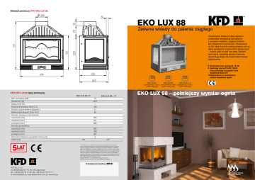 Wkłady kominkowe KFD EKO LUX 88 EKO LUX 88 ˚eliwne wk∏ady do palenia ciàg∏ego Uniwersalne. Dzi´ki prostej stylistyce znakomicie komponujà si´ zarówno z surowym metalem, ciepłymi kaflami, jak i eleganckim kamieniem. Zbudowane na ich bazie kominki zdobià wn´trza, ale sà tak˝e wydajnymi urzàdzeniami grzewczymi – mo˝na paliç w nich non-stop. Solidne wykonanie i wysokiej jakoÊci materiały gwarantujà długie lata bezproblemowego u˝ytkowania. Nominalna moc grzewcza 12 kW Spełniajà norm´ PN-EN 13229 oraz posiadajà europejski znak bezpieczeƒstwa CE Wyposa˝one w nowoczesny system dopalania spalin EKO LUX 88 L EKO LUX 88 P EKO LUX 88 L+P (przeszklenia z 2 stron: (przeszklenia z 2 stron: (przeszklenia z 3 stron: przód i lewy bok) przód i prawy bok)) przód i dwa boki) KFD EKO LUX 88 dane techniczne G W GWARANCJA L I¢å AT JI P EKO LUX 88 L/P Moc nominalna [kW] 12 SprawnoÊç [%] 69,3 Klasa emisji CO 1 Ârednia temperatura dymu [°C] 428 Ârednie zu˝ycie drewna [kg/godz.] 5,1 Maksymalna d∏ugoÊç polan [cm] 60 Wymiary fasady po zabudowaniu szerokoÊç [mm] 694 wysokoÊç [mm] 551 przekàtna [mm] 886 Wymiary przeszklenia szerokoÊç [mm] 585 wysokoÊç [mm] 360 przekàtna [mm] 687 Minimalna efektywna wysokoÊç komina [m] 4 Ci´˝ar [kg] 154 ARANC KFD Sp. z o.o. ul. Olszankowa 51, PL 05-120 Legionowo tel. +48 (0) 22 774 11 22, fax +48 (0) 22 774 17 11 e-mail [email protected], www.ekokominki.com.pl, www.kfd.eu EKO LUX 88 L+P 152 Firma KFD Sp. z o.o. zastrzega sobie prawo do wprowadzania, bez uprzedzenia, zmian parametrów technicznych, wyposa˝enia i specyfikacji oferowanych urzàdzeƒ. Podane w niniejszej publikacji promocyjnej informacje sà poglàdowe i nie stanowià zapewnienia zgodnoÊci z umowà w rozumieniu art. 4 ust. 3 i 4 Ustawy z dnia 27 lipca 2002 r. o szczególnych warunkach sprzeda˝y konsumenckiej oraz o zmianie Kodeksu Cywilnego, a tak˝e nie stanowià towaru w rozumieniu art. 4 ust. 2 wy˝ej wymienionej Ustawy. Indywidualne uzgodnienia właÊciwoÊci, warunków gwarancji i specyfikacji urzàdzenia nast´pujà w umowie sprzeda˝y i karcie gwarancyjnej. Niniejsza publikacja nie stanowi oferty w rozumieniu art. 66 Kodeksu Cywilnego. Firma KFD Sp. z o.o. nie ponosi odpowiedzialnoÊci za bł´dy w druku. Copyright KFD Sp. z o.o. 2009. Wszelkie prawa zastrze˝one. Ulotk´ wydrukowano w Polsce. Wer. EKOLUX88OLO2521092009. EKO LUX 88 – pełniejszy wymiar ognia zalety wk∏adów KFD EKO LUX 88 Wkłady KFD EKO LUX 88 to wysokiej jakoÊci ˝eliwne urzàdzenia grzewcze. Solidne elementy ˝eliwne gwarantujà bezpiecznà prac´ przez długie lata. System wyjàtkowo sprawnego dopalania spalin. Powietrze pierwotne wykorzystywane jest podczas rozpalania. Wtórne powietrze, które trafia do komory spalania ju˝ w postaci ogrzanej ułatwia dopalanie, a jednoczeÊnie utrzymuje szyb´ w czystoÊci. Dodatkowo, dzi´ki powietrzu „turbo”, doprowadzonemu w samo centrum paleniska, wkłady KFD EKO LUX 88 osiàgajà wysokà sprawnoÊç, a dzi´ki niskiej emisji spalin chronià Êrodowisko. Nowoczesny system dopalania spalin pozwala maksymalnie wykorzystaç energi´ z drewna oraz dbaç o Êrodowisko. wk∏ad z szybà z lewej strony wk∏ad z szybà z prawej strony wk∏ad z dwoma bocznymi szybami KFD EKO LUX 88 L KFD EKO LUX 88 P KFD EKO LUX 88 L+P KFD EKO LUX 88 L / P – wi´cej ognia KFD EKO LUX 88 L+P – jeszcze wi´cej ognia Idealny, gdy chcesz podziwiaç ogieƒ z dwóch stron: od frontu i z boku. Najlepsze rozwiàzanie, gdy kominek zaprojektowano np. na pograniczu salonu i jadalni. Wybierz optymalne dla siebie rozwiàzanie: z szybà bocznà z prawej lub lewej strony. Poza solidnà konstrukcjà, dobrymi parametrami grzewczymi i wysokà jakoÊcià ˝eliwa, z którego odlano elementy wkładów EKO LUX 88L i 88P, ich du˝ym atutem jest bezpieczna szyba wykonana z przezroczystej ceramiki. Jest odporna na temperatury do 750°C. Dodatkowo dzi´ki kurtynie powietrznej i zjawisku pirolizy pozostaje długo czysta. Dzi´ki dwóm bocznym szybom spektakl płomieni mo˝na oglàdaç w pełnym wymiarze. To naprawd´ robi wra˝enie, szczególnie gdy kominek umieÊcimy w centralnej cz´Êci salonu. Nowoczesny system dopalania spalin sprawia, ˝e kominek daje wi´cej ciepła i emituje do atmosfery mniej zanieczyszczeƒ. Szyber (w standardzie) pozwala precyzyjnie regulowaç siΠ´ ciàgu w kominie. Szeroki deflektor spalin wymusza dΠugi obieg spalin we wkΠadzie. Dzi´ki temu wzrasta wydajnoÊç grzewcza, a spalanie staje si´ bardziej ekologiczne. Solidna konstrukcja i najwy˝szej jakoÊci ˝eliwo gwarantuje bezpieczeƒstwo i niezawodnoÊç przez dΠugie lata u˝ytkowania. PΠynna regulacja wlotu powietrza pozwala sterowaç intensywnoÊcià i szybkoÊcià spalania. Wysuwany popielnik pozwala szybko i wygodnie pozbyç si´ popioΠu. Drzwiczki blokowane zamkiem z wygodnà ràczkà. Demontowalne cz´Êci paleniska pozwalajà na prace konserwacyjne bez koniecznoÊci demonta˝u wkładu.