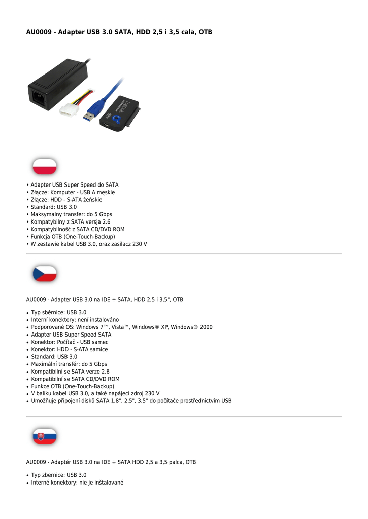 AU0009 - Adapter USB 3.0 SATA, HDD 2,5 i 3,5 cala, OTB • Adapter USB Super Speed do SATA • Złącze: Komputer - USB A męskie • Złącze: HDD - S-ATA żeńskie • Standard: USB 3.0 • Maksymalny transfer: do 5 Gbps • Kompatybilny z SATA versja 2.6 • Kompatybilność z SATA CD/DVD ROM • Funkcja OTB (One-Touch-Backup) • W zestawie kabel USB 3.0, oraz zasilacz 230 V AU0009 - Adapter USB 3.0 na IDE + SATA, HDD 2,5 i 3,5", OTB ● ● ● ● ● ● ● ● ● ● ● ● ● Typ sběrnice: USB 3.0 Interní konektory: není instalováno Podporované OS: Windows 7™, Vista™, Windows® XP, Windows® 2000 Adapter USB Super Speed SATA Konektor: Počítač - USB samec Konektor: HDD - S-ATA samice Standard: USB 3.0 Maximální transfér: do 5 Gbps Kompatibilní se SATA verze 2.6 Kompatibilní se SATA CD/DVD ROM Funkce OTB (One-Touch-Backup) V balíku kabel USB 3.0, a také napájecí zdroj 230 V Umožňuje připojení disků SATA 1,8", 2,5", 3,5" do počítače prostřednictvím USB AU0009 - Adaptér USB 3.0 na IDE + SATA HDD 2,5 a 3,5 palca, OTB ● ● Typ zbernice: USB 3.0 Interné konektory: nie je inštalované ● ● ● ● ● ● ● ● ● ● ● Podporované OS: Windows 7™, Vista™, Windows® XP, Windows® 2000 adaptér USB Super Speed pre SATA Konektor: počítač - USB A samec Konektor: HDD - S-ATA samica Štandardné: USB 3.0 Maximálna rýchlosť prenosu: až 5 Gbps Kompatibilný so SATA verzia 2,6 Kompatibilita so SATA CD / DVD ROM Funkcia OTB (One-Touch-Backup) V sade USB 3.0 kábel a napájanie AC 230 V Umožňuje pripojenie diskov SATA 1,8 ", 2,5", 3,5" k počítaču cez USB Kod EAN:4260113573235