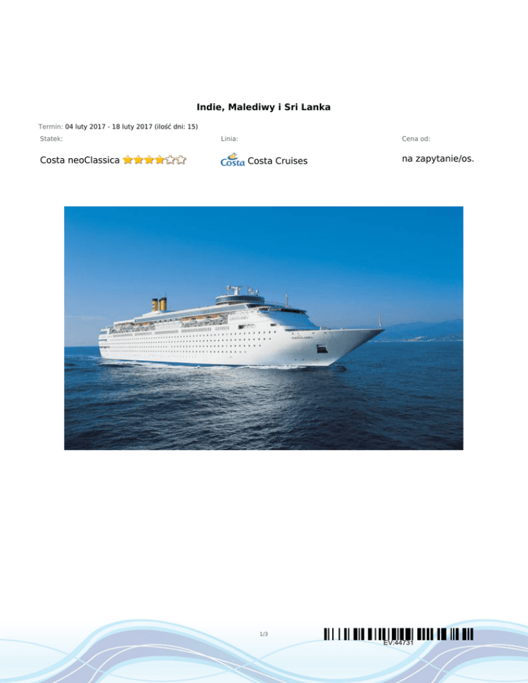 Indie, Malediwy i Sri Lanka Termin: 04 luty 2017 - 18 luty 2017 (ilość dni: 15) Statek: Costa neoClassica Linia: Cena od: Costa Cruises na zapytanie/os. 1/3 EV:44731 TRASA REJSU Data Port Wpłynięcie Wypłynięcie sobota 04.02.2017 Bombaj --:-- 21:00 dzień 2 niedziela 05.02.2017 Dzień na morzu --:-- --:-- dzień 3 poniedziałek 06.02.2017 Mangalore 07:00 20:00 wtorek 07.02.2017 Koczin 09:30 --:-- środa 08.02.2017 Koczin --:-- 20:00 dzień 6 czwartek 09.02.2017 Dzień na morzu --:-- --:-- dzień 7 piątek 10.02.2017 Male 07:00 --:-- --:-- --:-- --:-- 23:59 dzień 1 dzień 4 dzień 5 dzień 8 dzień 9 sobota 11.02.2017 niedziela 12.02.2017 Indie Indie Indie Indie Malediwy Male Malediwy Male Malediwy dzień 10 poniedziałek 13.02.2017 Dzień na morzu --:-- --:-- dzień 11 wtorek 14.02.2017 Kolombo 07:00 18:00 dzień 12 środa 15.02.2017 Dzień na morzu --:-- --:-- dzień 13 czwartek 16.02.2017 Marmagao 09:00 --:-- piątek 17.02.2017 Marmagao --:-- 17:00 dzień 14 Sri Lanka Indie Indie 2/3 EV:44731 Legenda dzień 15 Data Port Wpłynięcie Wypłynięcie sobota 18.02.2017 Bombaj 08:00 --:-- Legenda Indie CENNIK Cena katalogowa Kabina wewnętrzna na zapytanie Kabina zewnętrzna z oknem na zapytanie Suite (apartament) na zapytanie Kabina jednoosobowa na zapytanie 3 i 4 osoba dorosła w kabinie na zapytanie dziecko do 18 lat jako 3 i 4 osoba w kabinie Opłaty portowe Cena promocyjna tylko opłaty portowe €190.00 Uwaga! Ceny za osobę w kabinie dwuosobowej. Cena zawiera: zakwaterowanie w kabinie wybranej kategorii; wyżywienie - 3 główne posiłki, przekąski między posiłkami; napoje serwowane do śniadania i w bufetach samoobsługowych; serwis bagażowy podczas wejścia i zejścia ze statku; serwis kabinowy; korzystanie ze wszystkich urządzeń sportowo - rekreacyjnych znajdujących się na pokładzie statku (basen, jacuzzi, sala fitness, itp.); udział we wszystkich imprezach organizowanych na statku (przedstawienia w teatrze, koncerty, programy animacyjne itp.). Cena nie zawiera: kosztów dojazdu do portu; opłat portowych; ewentualnych noclegów w hotelu przed/po rejsie i transferów; wycieczek fakultatywnych w trakcie rejsu; korzystania z barów, mini baru w kabinie oraz napojów zamawianych w restauracji; korzystania z punktów usługowych (fryzjer, pralnia, fotograf, salon piękności i odnowy biologicznej, internet) i wydatków osobistych; napiwków dla obsługi na statku (kwota uzależniona od długości rejsu); ubezpieczenia KL, NNW i bagaż, kosztów wiz (tam gdzie wymagane). Uwagi: Od 01.12.2015 na wszystkich rejsach Costa Cruises (z min. 5 noclegów) można zarezerwować następujące pakiety all inclusive: dla dzieci 4-17 lat Giovani od 15.99€/os./dzień, dla dorosłych: Brindiamo od 24.99€/os./dzień, Piu Gusto od 27.99€/os./dzień, Intenditore od 45.99€/os./dzień (pakiet musi być wykupiony przez każdą osobę zakwaterowaną w kabinie - można zakupić w biurze przed rejsem). Na Państwa życzenie zarezerwujemy przelot, transfery do/z portu, parking, dodatkowe noclegi oraz zadbamy o odpowiednie ubezpieczenie podróżne. 3/3 EV:44731