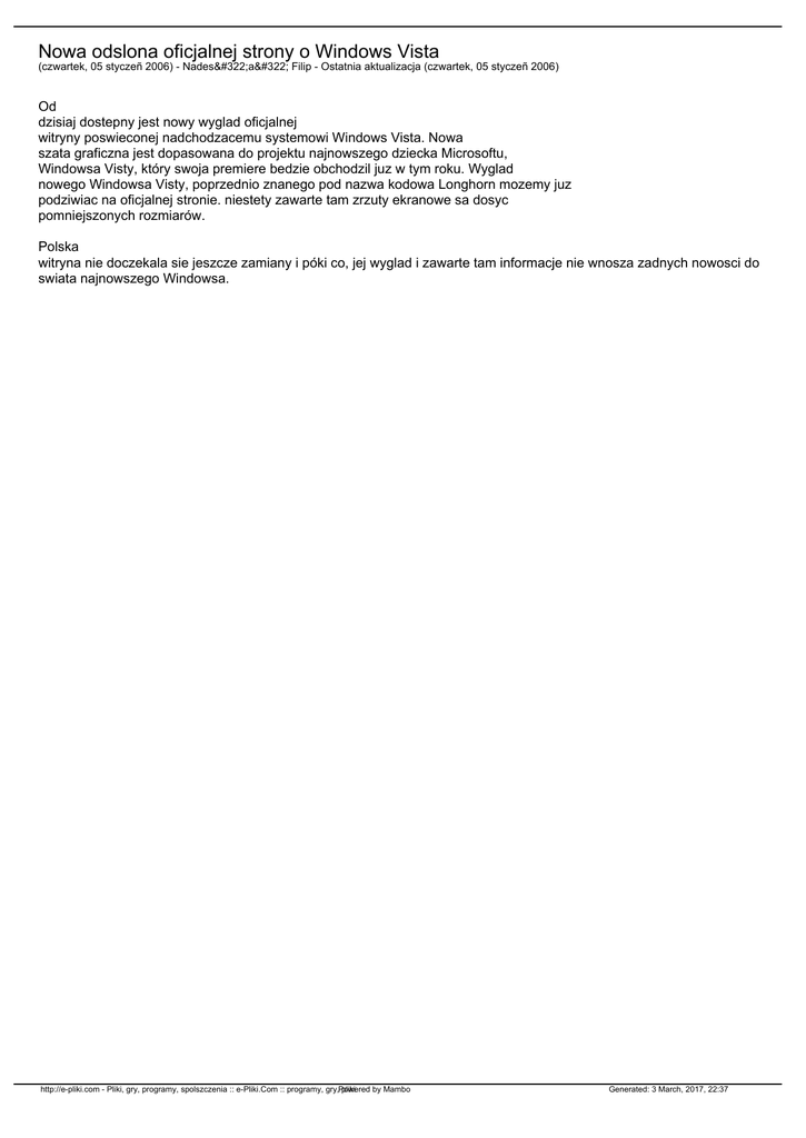 Nowa odslona oficjalnej strony o Windows Vista (czwartek, 05 styczeñ 2006) - Nadesłał Filip - Ostatnia aktualizacja (czwartek, 05 styczeñ 2006) Od dzisiaj dostepny jest nowy wyglad oficjalnej witryny poswieconej nadchodzacemu systemowi Windows Vista. Nowa szata graficzna jest dopasowana do projektu najnowszego dziecka Microsoftu, Windowsa Visty, który swoja premiere bedzie obchodzil juz w tym roku. Wyglad nowego Windowsa Visty, poprzednio znanego pod nazwa kodowa Longhorn mozemy juz podziwiac na oficjalnej stronie. niestety zawarte tam zrzuty ekranowe sa dosyc pomniejszonych rozmiarów. Polska witryna nie doczekala sie jeszcze zamiany i póki co, jej wyglad i zawarte tam informacje nie wnosza zadnych nowosci do swiata najnowszego Windowsa. http://e-pliki.com - Pliki, gry, programy, spolszczenia :: e-Pliki.Com :: programy, gry,Powered pliki by Mambo Generated: 3 March, 2017, 22:37
