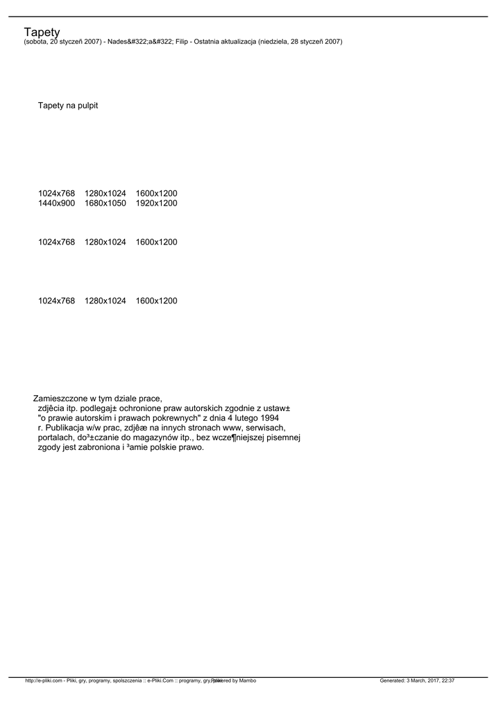 Tapety (sobota, 20 styczeñ 2007) - Nadesłał Filip - Ostatnia aktualizacja (niedziela, 28 styczeñ 2007) Tapety na pulpit 1024x768 1440x900 1280x1024 1680x1050 1600x1200 1920x1200 1024x768 1280x1024 1600x1200 1024x768 1280x1024 1600x1200 Zamieszczone w tym dziale prace, zdjêcia itp. podlegaj± ochronione praw autorskich zgodnie z ustaw± "o prawie autorskim i prawach pokrewnych" z dnia 4 lutego 1994 r. Publikacja w/w prac, zdjêæ na innych stronach www, serwisach, portalach, do³±czanie do magazynów itp., bez wcze¶niejszej pisemnej zgody jest zabroniona i ³amie polskie prawo. http://e-pliki.com - Pliki, gry, programy, spolszczenia :: e-Pliki.Com :: programy, gry,Powered pliki by Mambo Generated: 3 March, 2017, 22:37