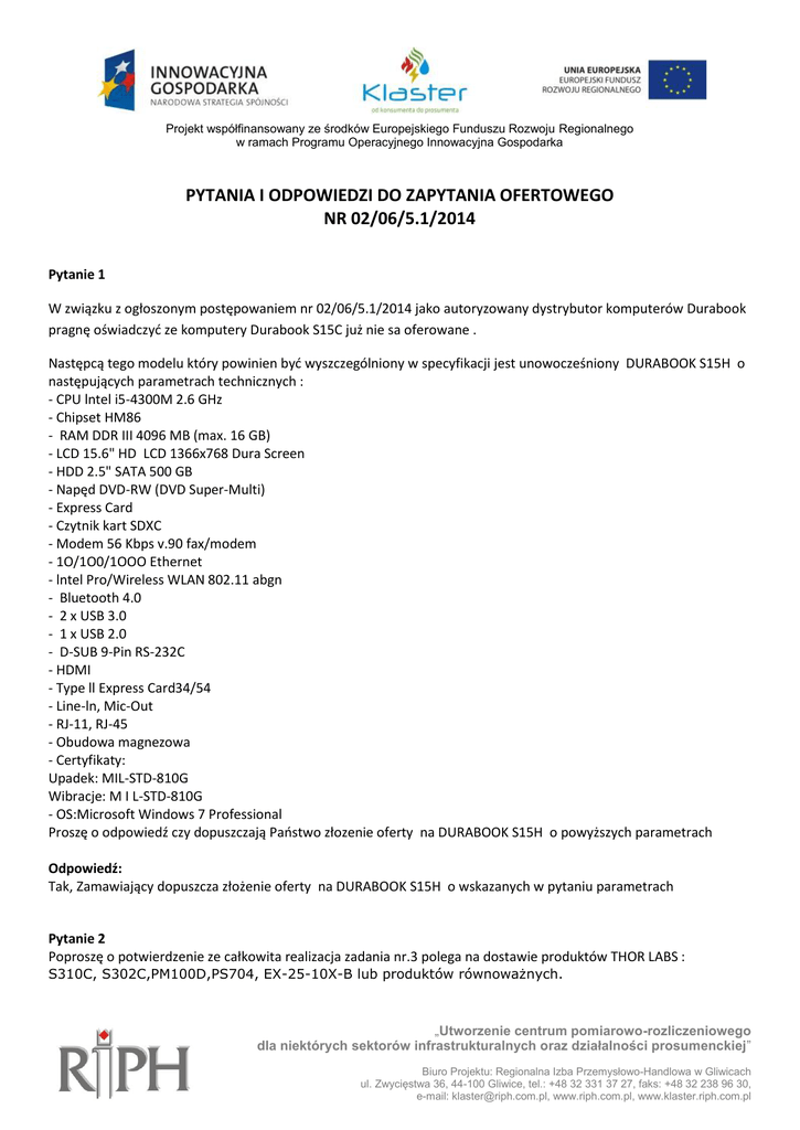 Projekt współfinansowany ze środków Europejskiego Funduszu Rozwoju Regionalnego w ramach Programu Operacyjnego Innowacyjna Gospodarka PYTANIA I ODPOWIEDZI DO ZAPYTANIA OFERTOWEGO NR 02/06/5.1/2014 Pytanie 1 W związku z ogłoszonym postępowaniem nr 02/06/5.1/2014 jako autoryzowany dystrybutor komputerów Durabook pragnę oświadczyć ze komputery Durabook S15C już nie sa oferowane . Następcą tego modelu który powinien być wyszczególniony w specyfikacji jest unowocześniony DURABOOK S15H o następujących parametrach technicznych : - CPU lntel i5-4300M 2.6 GHz - Chipset HM86 - RAM DDR III 4096 MB (max. 16 GB) - LCD 15.6" HD LCD 1366x768 Dura Screen - HDD 2.5" SATA 500 GB - Napęd DVD-RW (DVD Super-Multi) - Express Card - Czytnik kart SDXC - Modem 56 Kbps v.90 fax/modem - 1O/1O0/1OOO Ethernet - lntel Pro/Wireless WLAN 802.11 abgn - Bluetooth 4.0 - 2 x USB 3.0 - 1 x USB 2.0 - D-SUB 9-Pin RS-232C - HDMI - Type ll Express Card34/54 - Line-ln, Mic-Out - RJ-11, RJ-45 - Obudowa magnezowa - Certyfikaty: Upadek: MIL-STD-810G Wibracje: M I L-STD-810G - OS:Microsoft Windows 7 Professional Proszę o odpowiedź czy dopuszczają Państwo złozenie oferty na DURABOOK S15H o powyższych parametrach Odpowiedź: Tak, Zamawiający dopuszcza złożenie oferty na DURABOOK S15H o wskazanych w pytaniu parametrach Pytanie 2 Poproszę o potwierdzenie ze całkowita realizacja zadania nr.3 polega na dostawie produktów THOR LABS : S310C, S302C,PM100D,PS704, EX-25-10X-B lub produktów równoważnych. „Utworzenie centrum pomiarowo-rozliczeniowego dla niektórych sektorów infrastrukturalnych oraz działalności prosumenckiej” Biuro Projektu: Regionalna Izba Przemysłowo-Handlowa w Gliwicach ul. Zwycięstwa 36, 44-100 Gliwice, tel.: +48 32 331 37 27, faks: +48 32 238 96 30, e-mail: [email protected], www.riph.com.pl, www.klaster.riph.com.pl Projekt współfinansowany ze środków Europejskiego Funduszu Rozwoju Regionalnego w ramach Programu Operacyjnego Innowacyjna Gospodarka Odpowiedź Zadanie nr. 3 wskazuje na dostawę następujących produktów: miernika, czujnika mocy 2W, czujnika mocy 10W oraz 2szt. pryzmatu ze wskazanego szkła- CaF Pytanie 3 Termin realizacji podany w ogłoszeniu podany jest na :do 31 lipca 2014 r. Dla produktów wymienionych w zadaniu nr4, producent określa dostawę na ok. 6-9 tygodni . W związku z tym proszę o zmianę terminu realizacji dla zadania nr4 na „ do 9 tygodni od podpisania umowy.” Odpowiedź Zamawiający zmienia termin realizacji do dnia 20 sierpnia dla wszystkich zadań wchodzących w skład zapytania ofertowego. Pytanie 4 Pyt. W związku z informacją uzyskaną od Producentów sprzętu dla zadań nr 3, 4, 5 a dotyczącą braku dokumentacji : 1. 2. 3. 4. 5. 7. Deklaracja zgodności, Świadectwo jakości, Karta gwarancyjna Certyfikat legalności oprogramowania Certyfikat na znak CE, lnstrukcja obsługi, dla akcesoriów wymienionych w opisie przedmiotu zamówienia zwracam się z zapytaniem , czy Zamawiający dopuści dostawę wymienionych w opisie przedmiotu zamówienia produktów bez wyżej wymienionej dokumentacji ? Odpowiedź Zamawiający dopuści dostawę wymienionych w opisie przedmiotów zamówienia dla zadań 3,4,5 z następującą dokumentacją: 1. Deklaracja zgodności WE 2. Certyfikat legalności oprogramowania zgodny z oświadczeniem producenta Zamawiający nie wymaga dokumentacji dla podzespołów elektronicznych „Utworzenie centrum pomiarowo-rozliczeniowego dla niektórych sektorów infrastrukturalnych oraz działalności prosumenckiej” Biuro Projektu: Regionalna Izba Przemysłowo-Handlowa w Gliwicach ul. Zwycięstwa 36, 44-100 Gliwice, tel.: +48 32 331 37 27, faks: +48 32 238 96 30, e-mail: [email protected], www.riph.com.pl, www.klaster.riph.com.pl