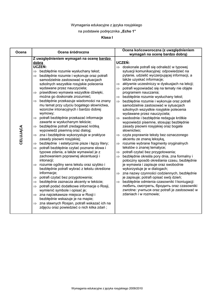 Wymagania edukacyjne z języka rosyjskiego na podstawie podręcznika „Echo 1” Klasa I CELUJĄCA Ocena Ocena śródroczna Z uwzględnieniem wymagań na ocenę bardzo dobrą UCZEŃ: ⇒ bezbłędnie rozumie wysłuchany tekst; ⇒ bezbłędnie rozumie i wykonuje oraz potrafi samodzielnie zastosować w sytuacjach szkolnych wszystkie rosyjskie polecenia wydawane przez nauczyciela; ⇒ prawidłowo wymawia wszystkie dźwięki, można go doskonale zrozumieć; ⇒ bezbłędnie przekazuje wiadomości na znany mu temat przy użyciu bogatego słownictwa, wzorców intonacyjnych i bardzo dobrej wymowy; ⇒ potrafi bezbłędnie przekazać informacje zawarte w wysłuchanym tekście; ⇒ bezbłędnie potrafi zredagować krótką wypowiedź pisemną oraz dialog; ⇒ zna i bezbłędnie wykorzystuje w praktyce zasady pisowni rosyjskiej; ⇒ bezbłędnie i estetycznie pisze i łączy litery; ⇒ potrafi bezbłędnie czytać poznane słowa i typowe zdania, a także wymawiać je z zachowaniem poprawnej akcentuacji i intonacji; ⇒ rozumie ogólny sens tekstu oraz szybko i bezbłędnie potrafi wybrać z tekstu określone informacje; ⇒ potrafi czytać bez przygotowania; ⇒ bezbłędnie zaznacza akcenty w tekście; ⇒ potrafi podać dodatkowe informacje o Rosji, wymienić symbole i opisać je; ⇒ zna najciekawsze miejsca w Rosji i bezbłędnie wskazuje je na mapie; ⇒ zna sławnych Rosjan, potrafi wskazać ich na zdjęciu oraz powiedzieć o nich kilka zdań ; Ocena końcoworoczna (z uwzględnieniem wymagań na ocenę bardzo dobrą) UCZEŃ: ⇒ doskonale potrafi się odnaleźć w typowej sytuacji komunikacyjnej: odpowiedzieć na pytanie, udzielić wyczerpującej informacji, a także uzyskać informacje; ⇒ aktywnie uczestniczy w dyskusjach na lekcji; ⇒ potrafi wypowiadać się na tematy nie objęte programem nauczania; ⇒ bezbłędnie rozumie wysłuchany tekst; ⇒ bezbłędnie rozumie i wykonuje oraz potrafi samodzielnie zastosować w sytuacjach szkolnych wszystkie rosyjskie polecenia wydawane przez nauczyciela; ⇒ swobodnie i bezbłędnie redaguje krótkie wypowiedzi pisemne, stosując bezbłędnie zasady pisowni rosyjskiej oraz bogate słownictwo; ⇒ czyta poprawnie teksty bez oznaczonego akcentu ze znaną leksyką, ⇒ rozumie wybrane fragmenty oryginalnych tekstów o znanej tematyce; ⇒ potrafi czytać bez przygotowania; ⇒ bezbłędnie określa pory dnia, zna formalny i potoczny sposób określania czasu, bezbłędnie je wymawia i zapisuje oraz swobodnie wykorzystuje je w dialogach; ⇒ zna nazwy czynności codziennych, bezbłędnie je zapisuje; potrafi opisać swój dzień; ⇒ bezbłędnie odmienia czasowniki II koniugacji: любить, смотреть, бродить oraz czasowniki zwrotne: учиться oraz potrafi je zastosować w zdaniach i w rozmowie; Wymagania edukacyjne z języka rosyjskiego 2009/2010 CELUJĄCA ⇒ potrafi bezbłędnie i płynnie przeliterować trudniejsze wyrazy; ⇒ umie bezbłędnie zadać pytania i odpowiedzieć na nie; ⇒ zna nazwy państw i stolic europejskich oraz innych kontynentów, nazwać ich mieszkańców, umie je bezbłędnie zapisać i przeczytać oraz zastosować w zdaniach; ⇒ zna znaczenie oraz odmianę czasowników należących do I koniugacji: играть, знать, жить oraz umie zastosować je w zdaniach; ⇒ zna liczebniki do 1000, bezbłędnie je zapisuje i wymawia, wykorzystuje w zdaniach, rozmowie; ⇒ potrafi bezbłędnie przedstawić się, powiedzieć kilka zdań o sobie, zapytać innych o dane osobowe i przekazać te informacje; ⇒ bezbłędnie odmienia rzeczowniki rodzaju żeńskiego np. мама, парта, песня i umie zastosować je w zdaniach różnego typu; ⇒ bez problemu i bezbłędnie wypełnia ankietę, ⇒ zna zwroty służące do zawierania znajomości, potrafi je bezbłędnie zapisać, wykorzystać swobodnie w rozmowie, odróżnić styl formalny od nieformalnego; ⇒ bezbłędnie zapisuje adres zgodnie z zasadami rosyjskimi; ⇒ bezbłędnie tworzy formy czasu przeszłego i umiejętnie stosuje je w wypowiedziach ustnych i pisemnych; ⇒ zna zwyczaje związane z popularnymi świętami w Rosji, potrafi wskazać różnice i podobieństwa między polskimi i rosyjskimi zwyczajami, złożyć życzenia; ⇒ bezbłędnie dostosowuje rodzaj przymiotnika do określanego rzeczownika i umiejętnie stosuje je w zdaniach; ⇒ swobodnie wypowiada się na temat życia codziennego stosując różnorodne konstrukcje leksykalno-gramatyczne; ⇒ zna i bezbłędnie zapisuje nazwy przedmiotów szkolnych i pomieszczeń w szkole, potrafi opisać szkołę, w której się uczy; ⇒ swobodnie wypowiada się na temat upodobań swoich i kolegów /koleżanek; ⇒ bezbłędnie pisze dłuższy tekst w jęz. rosyjskim stosując różnorodne struktury leksykalnogramatyczne oraz bezbłędnie stosuje zasady ortografii i interpunkcji; ⇒ bezbłędnie określa i zapisuje datę, potrafi odróżnić styl formalny od nieformalnego; ⇒ potrafi bezbłędnie odmieniać czasowniki zwrotne: заниматься, интересоваться oraz bezbłędnie stosuje je w zdaniach; ⇒ swobodnie i bezbłędnie wypowiada się na temat spędzania czasu wolnego przez siebie i innych, opowiada o swoich zajęciach, stosując zaimek каждый i przyimek по; ⇒ bezbłędnie odmienia czasowniki w czasie przeszłym złożonym i swobodnie wykorzystuje je w zdaniach różnego typu; ⇒ zna i bezbłędnie zapisuje nazwy członków rodziny, swobodnie opisuje swoją rodzinę i rodzinę kolegi / koleżanki oraz relacje panujące w rodzinie; ⇒ potrafi bezbłędnie odmieniać rzeczowniki deklinacji I zakończone na -ья: семья oraz swobodnie wykorzystuje je w zdaniach i wypowiedziach pisemnych i ustnych; ⇒ stosuje stopień wyższy i najwyższy przymiotników w celu określenia różnicy wieku; ⇒ zna i bezbłędnie zapisuje nazwy zawodów oraz miejsc pracy, tworzy definicje danego zawodu; ⇒ bezbłędnie układa tytuły do różnych tekstów Wyma