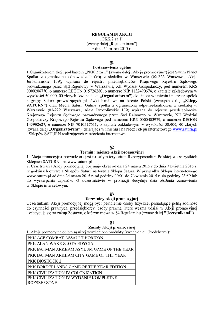 REGULAMIN AKCJI „PKK 2 za 1” (zwany dalej „Regulaminem”) z dnia 24 marca 2015 r. §1 Postanowienia ogólne 1.Organizatorem akcji pod hasłem „PKK 2 za 1” (zwana dalej „Akcją promocyjną”) jest Saturn Planet Spółka z ograniczoną odpowiedzialnością z siedzibą w Warszawie (02-222 Warszawa, Aleje Jerozolimskie 179), wpisana do rejestru przedsiębiorców Krajowego Rejestru Sądowego prowadzonego przez Sąd Rejonowy w Warszawie, XII Wydział Gospodarczy, pod numerem KRS 0000206770, o numerze REGON 015726260, o numerze NIP 1132490674, o kapitale zakładowym w wysokości 50.000, 00 złotych (zwana dalej „Organizatorem”) działająca w imieniu i na rzecz spółek z grupy Saturn prowadzących placówki handlowe na terenie Polski (zwanych dalej „Sklepy SATURN”) oraz Media Saturn Online Spółka z ograniczoną odpowiedzialnością z siedzibą w Warszawie (02-222 Warszawa, Aleje Jerozolimskie 179) wpisana do rejestru przedsiębiorców Krajowego Rejestru Sądowego prowadzonego przez Sąd Rejonowy w Warszawie, XII Wydział Gospodarczy Krajowego Rejestru Sądowego pod numerem KRS 0000403979, o numerze REGON 145902629, o numerze NIP 7010327611, o kapitale zakładowym w wysokości 50.000, 00 złotych (zwana dalej „Organizatorem”), działająca w imieniu i na rzecz sklepu internetowego www.saturn.pl i Sklepów SATURN realizujących zamówienia internetowe. §2 Termin i miejsce Akcji promocyjnej 1. Akcja promocyjna prowadzona jest na całym terytorium Rzeczypospolitej Polskiej we wszystkich Sklepach SATURN i na www.saturn.pl 2. Czas trwania Akcji promocyjnej obejmuje okres od dnia 24 marca 2015 r do dnia 7 kwietnia 2015 r. w godzinach otwarcia Sklepów Saturn na terenie Sklepu Saturn. W przypadku Sklepu internetowego www.saturn.pl od dnia 24 marca 2015 r. od godziny 00:01 do 7 kwietnia 2015 r. do godziny 23:59 lub do wyczerpania zapasów. O uczestnictwie w promocji decyduje data złożenia zamówienia w Sklepie internetowym. §3 Uczestnicy Akcji promocyjnej Uczestnikami Akcji promocyjnej mogą być: pełnoletnie osoby fizyczne, posiadające pełną zdolność do czynności prawnych, przedsiębiorcy, osoby prawne, które wezmą udział w Akcji promocyjnej i zdecydują się na zakup Zestawu, o którym mowa w §4 Regulaminu (zwane dalej "Uczestnikami"). §4 Zasady Akcji promocyjnej 1. Akcją promocyjną objęte są niżej wymienione produkty (zwane dalej „Produktami): PKK ACE COMBAT ASSAULT HORIZON PKK ALAN WAKE ZLOTA EDYCJA PKK BATMAN ARKHAM ASYLUM GAME OF THE YEAR PKK BATMAN ARKHAM CITY GAME OF THE YEAR PKK BIOSHOCK 2 PKK BORDERLANDS GAME OF THE YEAR EDITION PKK CIVILIZATION IV COLONIZATION PKK CIVILIZATION IV WYDANIE KOMPLETNE ROZSZERZONE PKK CIVILIZATION V PKK DARK SOULS PKK DEUS EX BUNT LUDZKOŚCI PKK DEUS EX BUNT LUDZKOŚCI ZLOTA EDYCJA PKK DEVIL MAY CRY 4 PKK DIVINITY II EGO DRACONIS PKK DMC DEVIL MAY CRY PKK DUNGEON SIEGE 3 PKK F.E.A.R. 3 PKK FALLOUT III PKK FALLOUT NEW VEGAS PKK FAR CRY PKK GHOST RECON ADVANCED WARFIGHTER 2 PKK GTA TRYLOGIA PKK GTA VICE CITY PKK HITMAN KWADROLOGIA PKK HITMAN ROZGRZESZENIE PKK IL-2 STURMOVIK 1946 PKK KANE & LYNCH + KANE & LYNCH 2 PKK KINGS BOUNTY WARRIORS OF THE NORTH COMPLETE PKK MAFIA 2 SPECIAL EXTENDED EDITION PKK MAFIA II PKK MAX PAYNE ANTOLOGIA PKK METRO LAST LIGHT STANDARD EDITION PKK MORTAL KOMBAT KOMPLETE EDITION PKK NARUTO SHIPPUDEN ULT. NINJA STORM 3 FULL BURST PKK NBA 2K11 PKK PRINCE OF PERSIA ZAPOMNIANE PIASKI PKK RAGE PKK RAINBOW SIX VEGAS 2 PKK RED ORCHESTRA 2 BOHATEROWIE STALINGRADU PKK RESIDENT EVIL 5 PKK RIDGE RACER UNBOUNDED WYD. KOMPL. ROZSZERZONE PKK RISEN PKK RISEN 2 MROCZNE WODY PKK S.T.A.L.K.E.R. ZEW PRYPECI PKK SACRED 2 PKK SACRED 2 ZŁOTA EDYCJA PKK SAINTS ROW THE THIRD PKK SERIOUS SAM 3 PKK SLEEPING DOGS PKK SPLINTER CELL DOUBLE AGENT PKK STREET FIGHTER 4 PKK STREET FIGHTER X TEKKEN PKK TEST DRIVE UNLIMITED 2 PKK TOMB RAIDER PKK TOMB RAIDER ULTIMATE EDITION PKK TORCHLIGHT II PKK TOTAL WAR EMPIRE + NAPOLEON PKK TOTAL WAR MEDIEVAL II ZLOTA EDYCJA PKK TOTAL WAR SHOGUN II ZLOTA EDYCJA PKK TWIERDZA 2 DELUXE PKK TWIERDZA HD PACK PKK TWIERDZA KRZYŻOWIEC EXTREME PKK VICTORIA ZLOTA EDYCJA PKK WARLOCK MASTER OF THE ARCANE - MISTRZ MAGII PKK WLADCA PIERSCIENI WOJNA NA POLNOCY dostępne w ofercie Sklepów Saturn oraz w Sklepie internetowym www. saturn.pl. 2. W ramach Akcji promocyjnej Uczestnik dokonując zakupu dwóch (2) Produktów promocyjnych, które biorą udział w Akcji (zwane dalej „Zestawem”) uprawniony będzie do otrzymania rabatu na zakup Zestawu (zwany dalej „Rabatem”). 3. W ramach jednego (1) Zestawu Uczestnik może dokonać zakupu dwóch (2) Produktów promocyjnych w cenie PLN 34,98 (trzydzieści cztery) brutto. 4. Uczestnik może brać udział w Akcji promocyjnej wielokrotnie, pod warunkiem każdorazowego spełnienia warunków przewidzianych w Regulaminie. 5. Uczestnikom nie przysługuje prawo do zastrzeżenia szczególnych cech Zestawów objętych Akcją promocyjną. 6. Uczestnikom Akcji promocyjnej nie przysługuje prawo do otrzymania ekwiwalentu pieniężnego w wysokości Rabatu. 7. Akcja promocyjna nie może być łączona z innymi Akcjami promocyjnymi, w tym kodami rabatowymi otrzymanymi w ramach programu Konto Plus. 8. Dokument stanowiący dowód zakupu (paragon fiskalny lub faktura VAT) w celu oznaczenia Akcji promocyjnej będzie zawierał w treści hasło „PKK 2 za 1”. §5 Odpowiedzialność 1. Odpowiedzialność Organizatora wobec Uczestnika z tytułu roszczeń związanych z uprawnieniami przyznanymi Uczestnikowi w Regulaminie ograniczona jest do ceny produktu uwzględniającej Rabat (tj. obowiązującej w trakcie Akcji promocyjnej), którego to produktu roszczenie dotyczy. 2. Powyższe ograniczenie nie wyłącza uprawnień przyznanych Uczestnikom na mocy odrębnych przepisów ustawowych. §6 Reklamacje i wymiana towarów 1. Reklamacje Uczestników dotyczące sposobu przeprowadzenia Akcji promocyjnej powinny być zgłaszane w trakcie trwania Akcji promocyjnej oraz przez 21 (dwadzie