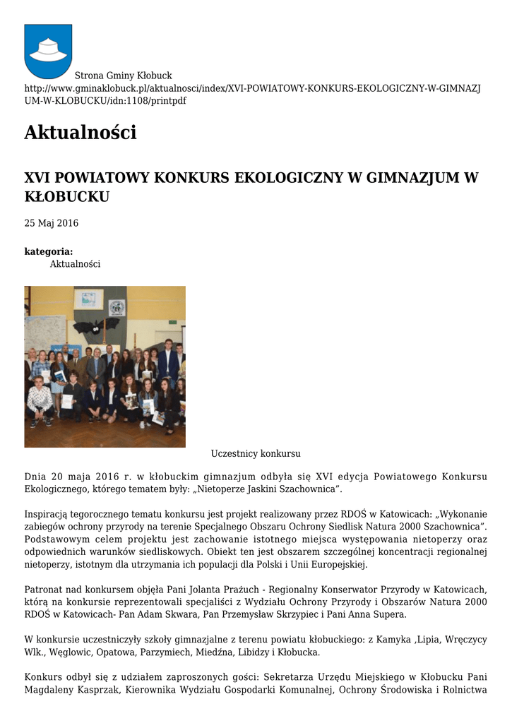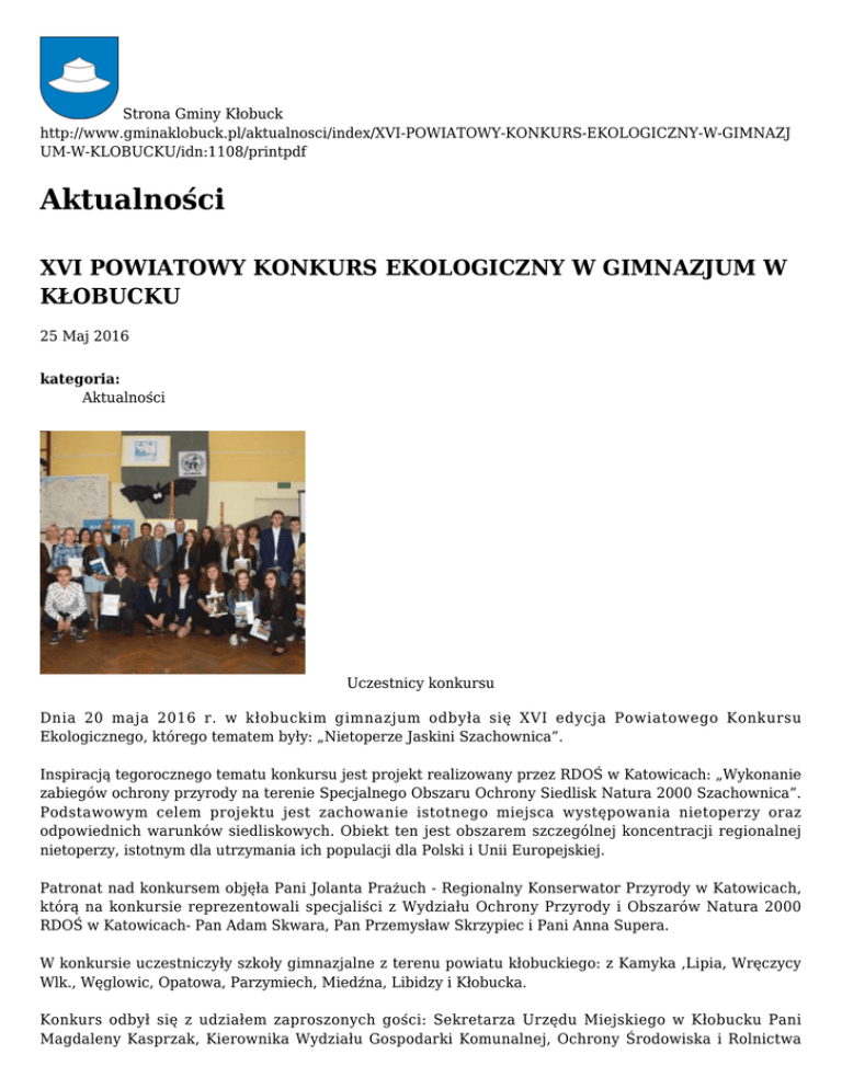Strona Gminy Kłobuck http://www.gminaklobuck.pl/aktualnosci/index/XVI-POWIATOWY-KONKURS-EKOLOGICZNY-W-GIMNAZJ UM-W-KLOBUCKU/idn:1108/printpdf Aktualności XVI POWIATOWY KONKURS EKOLOGICZNY W GIMNAZJUM W KŁOBUCKU 25 Maj 2016 kategoria: Aktualności Uczestnicy konkursu Dnia 20 maja 2016 r. w kłobuckim gimnazjum odbyła się XVI edycja Powiatowego Konkursu Ekologicznego, którego tematem były: „Nietoperze Jaskini Szachownica”. Inspiracją tegorocznego tematu konkursu jest projekt realizowany przez RDOŚ w Katowicach: „Wykonanie zabiegów ochrony przyrody na terenie Specjalnego Obszaru Ochrony Siedlisk Natura 2000 Szachownica”. Podstawowym celem projektu jest zachowanie istotnego miejsca występowania nietoperzy oraz odpowiednich warunków siedliskowych. Obiekt ten jest obszarem szczególnej koncentracji regionalnej nietoperzy, istotnym dla utrzymania ich populacji dla Polski i Unii Europejskiej. Patronat nad konkursem objęła Pani Jolanta Prażuch - Regionalny Konserwator Przyrody w Katowicach, którą na konkursie reprezentowali specjaliści z Wydziału Ochrony Przyrody i Obszarów Natura 2000 RDOŚ w Katowicach- Pan Adam Skwara, Pan Przemysław Skrzypiec i Pani Anna Supera. W konkursie uczestniczyły szkoły gimnazjalne z terenu powiatu kłobuckiego: z Kamyka ,Lipia, Wręczycy Wlk., Węglowic, Opatowa, Parzymiech, Miedźna, Libidzy i Kłobucka. Konkurs odbył się z udziałem zaproszonych gości: Sekretarza Urzędu Miejskiego w Kłobucku Pani Magdaleny Kasprzak, Kierownika Wydziału Gospodarki Komunalnej, Ochrony Środowiska i Rolnictwa Urzędu Miejskiego w Kłobucku Pani Marty Borkowskiej, Przedstawicieli Nadleśnictwa Kłobuck- Pana Wojciecha Niewęgłowskiego i Pana Tomasza Paciepnika oraz Dyrekcji Gimnazjum- Pana Pawła Kotkowskiego i Pani Sylwii Galle. Konkurs odbywał się równocześnie w dwóch etapach: wiedzowym w formie testu komputerowego oraz multimedialnym, gdzie dwuosobowe drużyny przedstawiły prezentację multimedialną dotyczącą Nietoperzy Jaskini Szachownica. Komisji konkursowej przewodniczył Pan Adam Skwara z RDOŚ w Katowicach, członkami komisji byli przedstawiciele Nadleśnictwa, specjaliści z RDOŚ oraz wszyscy nauczyciele opiekunowie z dziewięciu gimnazjów powiatu kłobuckiego. Uczestnicy konkursu zapoznali zebranych z wybranymi gatunkami nietoperzy z dziesięciu zimujących w Szachownicy oraz przedstawili szczególne adaptacje latających ssaków do środowiska życia. Wyniki konkursu przedstawiają się następująco: Etap multimedialny: I miejsce - Gimnazjum w Węglowicach ( Szleper Marta i Koza Mateusz ) II miejsce- ex aequo Gimnazjum w Kłobucku (Klaudia Tukajska i Jakub Rudzki ) i Gimnazjum we Wręczycy Wlk. (Kot Michał i Kamrowski Kacper) III miejsce - Gimnazjum w Parzymiechach (Monika Kmiecik i Wiktoria Bzdąk) Wyróżnienie: Gimnazjum w Opatowie (Sawicka Urszula i Myślińska Paulina ) Etap wiedzowy: I miejsce- Duda Daniel- Libidza II miejsce- Klimaszewska Zuzanna - Kłobuck III miejsce - Brzęczek Sylwia- Wręczyca Wlk. Wyróżnienie: Hanszke Ewelina- Wręczyca Wlk., Starowicz Julia – Miedźno, Bogacz Paulina - Opatów Nagrody dla laureatów konkursu i dla szkół ufundowali: Regionalna Dyrekcja Ochrony Środowiska w Katowicach, Urząd Miejski w Kłobucku, LGD Zielony Wierzchołek Śląska, Nadleśnictwo Kłobuck oraz Gimnazjum w Kłobucku. Gratulujemy laureatom i uczestnikom wiedzy, fundatorom nagród składamy podziękowania. Relacja -Dorota Ciemięga XVI POWIATOWY KONKURS EKOLOGICZNY XVI POWIATOWY KONKURS EKOLOGICZNY 5 zdjęć 25 maj 2016 powrót do listy aktualności poprzednia następna