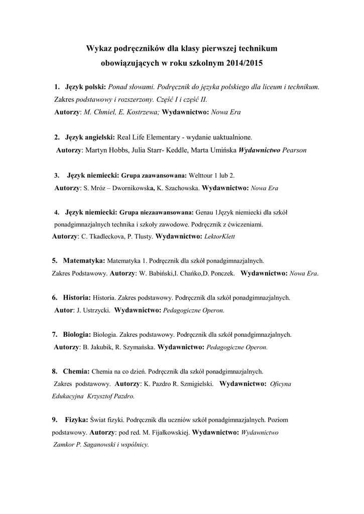 Wykaz podręczników dla klasy pierwszej technikum obowiązujących w roku szkolnym 2014/2015 1. Język polski: Ponad słowami. Podręcznik do języka polskiego dla liceum i technikum. Zakres podstawowy i rozszerzony. Część I i część II. Autorzy: M. Chmiel, E. Kostrzewa; Wydawnictwo: Nowa Era 2. Język angielski: Real Life Elementary - wydanie uaktualnione. Autorzy: Martyn Hobbs, Julia Starr- Keddle, Marta Umińska Wydawnictwo Pearson 3. Język niemiecki: Grupa zaawansowana: Welttour 1 lub 2. Autorzy: S. Mróz – Dwornikowska, K. Szachowska. Wydawnictwo: Nowa Era 4. Język niemiecki: Grupa niezaawansowana: Genau 1Język niemiecki dla szkół ponadgimnazjalnych technika i szkoły zawodowe. Podręcznik z ćwiczeniami. Autorzy: C. Tkadleckova, P. Tlusty. Wydawnictwo: LektorKlett 5. Matematyka: Matematyka 1. Podręcznik dla szkół ponadgimnazjalnych. Zakres Podstawowy. Autorzy: W. Babiński,I. Chańko,D. Ponczek. Wydawnictwo: Nowa Era. 6. Historia: Historia. Zakres podstawowy. Podręcznik dla szkół ponadgimnazjalnych. Autor: J. Ustrzycki. Wydawnictwo: Pedagogiczne Operon. 7. Biologia: Biologia. Zakres podstawowy. Podręcznik dla szkół ponadgimnazjalnych. Autorzy: B. Jakubik, R. Szymańska. Wydawnictwo: Pedagogiczne Operon. 8. Chemia: Chemia na co dzień. Podręcznik dla szkół ponadgimnazjalnych. Zakres podstawowy. Autorzy: K. Pazdro R. Szmigielski. Wydawnictwo: Oficyna Edukacyjna Krzysztof Pazdro. 9. Fizyka: Świat fizyki. Podręcznik dla uczniów szkół ponadgimnazjalnych. Poziom podstawowy. Autorzy: pod red. M. Fijałkowskiej. Wydawnictwo: Wydawnictwo Zamkor P. Saganowski i wspólnicy. 10. Geografia: Świat się zmienia. Geografia. Podręcznik dla szkół ponadgimnazjalnych. Zakres podstawowy. Autorzy: W. Janicki. Wydawnictwo: Oficyna Edukacyjna Krzysztof Pazdro. 11. Edukacja dla bezpieczeństwa: Żyję i działam bezpiecznie. Podręcznik do edukacji dla bezpieczeństwa dla szkół pondgimnazjalnych. Autorzy: J. Słoma. Wydawnictwo: Nowa Era. 12. Wiedza o kulturze: Wiedza kulturze. Podręcznik dla szkół średnich. Autorzy: W. Panek. Wydawnictwo: Wydawnictwo Polskie w Wołominie. Uwaga!!! Podręcznik do języka niemieckiego zostanie zakupiony we wrześniu po dokonaniu podziału na poszczególne grupy. KIERMASZ PODRĘCZNIKÓW DLA KLASY I W PIERWSZYM TYGODNIU WRZEŚNIA Wykaz podręczników dla klasy drugiej technikum obowiązujących w roku szkolnym 2014/2015 1. Język polski: Ponad słowami. Podręcznik do języka polskiego dla liceum i technikum. Zakres podstawowy i rozszerzony. Część II. Autorzy: M. Chmiel, E. Kostrzewa; Wydawnictwo: Nowa Era; 2. Matematyka: Matematyka 2. Podręcznik dla szkół ponadgimnazjalnych. Zakres Podstawowy. Autorzy: W. Babiński,I. Chańko, J. Czarnowska Wydawnictwo: Nowa Era. 3. Język angielski: Matura Focus 2. Autorzy: Sue Kay, Vaughan Jones, Bartosz Michałowski. Wydawnictwo Pearson 4. Język niemiecki: Welttour 2 Autorzy: S. Mróz – Dwornikowska K. Szachowska Wydawnictwo Nowa Era 5. Biologia: Biologia na czasie 1. Zakres rozszerzony. Autorzy: Marek Guzik, Ewa Jastrzębska, Ryszard Kozik. Wydawnictwo: Nowa Era