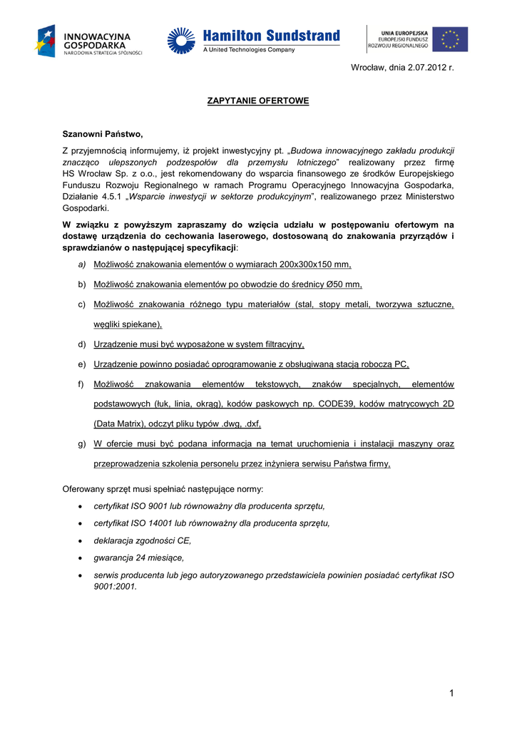 Wrocław, dnia 2.07.2012 r. ZAPYTANIE OFERTOWE Szanowni Państwo, Z przyjemnością informujemy, iż projekt inwestycyjny pt. „Budowa innowacyjnego zakładu produkcji znacząco ulepszonych podzespołów dla przemysłu lotniczego” realizowany przez firmę HS Wrocław Sp. z o.o., jest rekomendowany do wsparcia finansowego ze środków Europejskiego Funduszu Rozwoju Regionalnego w ramach Programu Operacyjnego Innowacyjna Gospodarka, Działanie 4.5.1 „Wsparcie inwestycji w sektorze produkcyjnym”, realizowanego przez Ministerstwo Gospodarki. W związku z powyższym zapraszamy do wzięcia udziału w postępowaniu ofertowym na dostawę urządzenia do cechowania laserowego, dostosowaną do znakowania przyrządów i sprawdzianów o następującej specyfikacji: a) Możliwość znakowania elementów o wymiarach 200x300x150 mm, b) Możliwość znakowania elementów po obwodzie do średnicy Ø50 mm, c) Możliwość znakowania różnego typu materiałów (stal, stopy metali, tworzywa sztuczne, węgliki spiekane), d) Urządzenie musi być wyposażone w system filtracyjny, e) Urządzenie powinno posiadać oprogramowanie z obsługiwaną stacją roboczą PC, f) Możliwość znakowania elementów tekstowych, znaków specjalnych, elementów podstawowych (łuk, linia, okrąg), kodów paskowych np. CODE39, kodów matrycowych 2D (Data Matrix), odczyt pliku typów .dwg, .dxf, g) W ofercie musi być podana informacja na temat uruchomienia i instalacji maszyny oraz przeprowadzenia szkolenia personelu przez inżyniera serwisu Państwa firmy, Oferowany sprzęt musi spełniać następujące normy: certyfikat ISO 9001 lub równoważny dla producenta sprzętu, certyfikat ISO 14001 lub równoważny dla producenta sprzętu, deklaracja zgodności CE, gwarancja 24 miesiące, serwis producenta lub jego autoryzowanego przedstawiciela powinien posiadać certyfikat ISO 9001:2001. 1 Procedura przetargowa odbywać będzie się dwustopniowo w następujących etapach: Etap I: PREKWALIFIKACJA - wybór oferentów oparty na kryteriach wejściowych, Etap II: OFERTOWANIE - przekazanie oferentom, którzy spełniają kryteria wejściowe (Etap I) specyfikacji technicznych (w języku polskim, ew. w języku angielskim) oraz przeprowadzenie przetargu zgodnie z załączonymi kryteriami. Etap I – PREKWALIFIKACJA. Zainteresowany uczestnictwem w dalszym postępowaniu Oferent zobowiązany jest do akceptacji umowy o poufności opracowanej przez HS Wrocław Sp. z o.o. Ponadto nadmienia się, iż zgodnie ze standardami Grupy Kapitałowej UTC, do której należy HS Wrocław Sp. z o.o., zakupy oraz współpraca z podwykonawcami przebiegają w oparciu o kryteria ochrony środowiska i zasady społecznej odpowiedzialności biznesu. Potencjalni kooperanci powinni zapoznać się z polityką wyboru dostawców realizowaną przez HS Wrocław (stanowiącą załącznik do zapytania ofertowego) oraz załączyć poniższe oświadczenie: „Oświadczam, że zapoznałem się z zasadami „Polityki wyboru wykonawców i dostawców realizowaną przez HS Wrocław Sp. z o.o,”, która stanowi załącznik do zapytania ofertowego”. Zainteresowani Oferenci, którzy akceptują powyższe kryteria proszeni są o dostarczenie pisemnego potwierdzenia tego faktu na załączonym formularzu umowy oraz oświadczenia (w języku polskim lub angielskim) w terminie do 13.07.2012 do godz. 12.00 w wersji elektronicznej na adresy email pracowników Zamawiającego podane poniżej, ew. listem poleconym, poprzez firmę kurierską lub osobiście w siedzibie Spółki na Sekretariacie Głównym. W przypadku braku zainteresowania z Państwa strony ofertą uprzejmie prosimy o potwierdzenie zaistniałego faktu. Etap II – OFERTOWANIE Tylko ci oferenci, którzy spełnią wymagania Etapu I zostaną dopuszczeni do Etapu II przetargu, w którym zostaną im dostarczone oczekiwane specyfikacje techniczne wyposażenia będącego przedmiotem zamówienia. Specyfikacje przekazane zostaną pocztą elektroniczną, drogą pocztową lub osobiście w terminie 7 dni od daty zakończenia etapu I, tj. prekwalifikacji. 1. Sposób i termin składania ofert. Uprasza się o dostarczenie oferty (w języku polskim lub angielskim) w terminie 7 dni od dnia odbioru specyfikacji technicznych od Zamawiającego. Oferty należy składać w wersji elektronicznej na adresy email pracowników Zamawiającego podane poniżej, ew. listem poleconym, poprzez firmę kurierską lub osobiście w siedzibie Spółki na Sekretariacie Głównym. W przypadku braku zainteresowania z Państwa strony udziałem w postępowaniu ofertowym uprzejmie prosimy o potwierdzenie zaistniałego faktu. Informuje się nadto, iż w przypadku jakichkolwiek wątpliwości językiem rozstrzygającym jest język polski. 2. Forma złożonej oferty. Złożona oferta powinna zawierać co najmniej: a) nazwę i adres oferenta, b) być sporządzona na papierze firmowym oferenta lub opatrzona pieczątką firmową, 2 c) posiadać datę sporządzenia, d) być podpisana przez przedstawiciela oferenta należycie upełnomocnionego do zaciągania zobowiązań w imieniu oferenta. Oferta powinna być ważna przynajmniej przez okres 6 miesięcy (oferta musi być ważna na dzień złożenia zamówienia). 3. Kryteria oceny ofert. Oferty zostaną poddane ocenie w odniesieniu do poniższych kryteriów wyboru. W przypadku każdego kryterium ocena zostaje udzielona na podstawie pisemnej oferty przedstawionej przez oferenta. Kryteria wyboru oferty: a) cena ( 7 pkt.), b) termin dostawy (3 pkt.), c) warunki płatności (2.5 pkt.), d) podstawowe wyposażenie i możliwość rozwinięcia maszyny o dodatkowe systemy, moduły (5.5 pkt.), e) funkcjonalność urządzenia, pozwalająca na znakowanie różnego typu elementów: płyty, elementy osiowo-symetryczne (6 pkt.). 4. Termin realizacji zamówienia. Oczekuje się realizacji zamówienia najpóźniej do dnia …2.10.2012… . 5. Forma wynagrodzenia oraz termin płatności. Wynagrodzenie za dostawę wyposażenia zostanie uregulowan