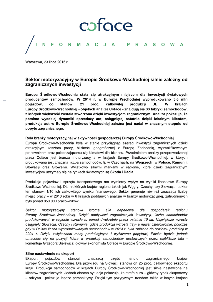 I N F O R M A C J A P R A S O W A Warszawa, 23 lipca 2015 r. Sektor motoryzacyjny w Europie Środkowo-Wschodniej silnie zależny od zagranicznych inwestycji Europa Środkowo-Wschodnia stała się atrakcyjnym miejscem dla inwestycji światowych producentów samochodów. W 2014 r. w Europie Wschodniej wyprodukowano 3,6 mln pojazdów, co stanowi 21 proc. całkowitej produkcji UE. W krajach Europy Środkowo-Wschodniej - objętych analizą Coface - znajdują się 33 fabryki samochodów, z których większość została stworzona dzięki inwestycjom zagranicznym. Analiza pokazuje, że pomimo wysokiej dynamiki sprzedaży aut, osiągniętej ostatnio dzięki lokalnym klientom, produkcja aut w Europie Środkowo-Wschodniej zależna jest nadal w znacznym stopniu od popytu zagranicznego. Rola branży motoryzacyjnej w aktywności gospodarczej Europy Środkowo-Wschodniej Europa Środkowo-Wschodnia była w stanie przyciągnąć szereg inwestycji zagranicznych dzięki atrakcyjnym kosztom pracy, bliskości geograficznej z Europą Zachodnią, wykwalifikowanym pracownikom oraz polepszającemu się klimatowi dla biznesu. Przedmiotem analizy przeprowadzonej przez Coface jest branża motoryzacyjna w krajach Europy Środkowo-Wschodniej, w których produkowana jest znaczna liczba samochodów, tj. w Czechach, na Węgrzech, w Polsce, Rumunii, Słowacji oraz Słowenii. Wyjątkowo silnymi markami w regionie, które dzięki zagranicznym inwestycjom utrzymały się na rynkach światowych są Skoda i Dacia. Produkcja pojazdów i sprzętu transportowego ma wymierny wpływ na wyniki finansowe Europy Środkowo-Wschodniej. Dla niektórych krajów regionu takich jak Węgry, Czechy, czy Słowacja, sektor ten stanowi 1/10 ich całkowitego wyniku finansowego. Sektor generuje również znaczącą liczbę miejsc pracy – w 2013 roku w 6 krajach poddanych analizie w branży motoryzacyjnej, zatrudnionych było ponad 850 000 pracowników. Sektor motoryzacyjny stanowi istotną siłę napędową dla gospodarek regionu Europy Środkowo-Wschodniej. Dzięki napływowi zagranicznych inwestycji, liczba samochodów produkowanych w regionie wzrosła tu ponad dwukrotnie przez ostatnie 10 lat. Największe wzrosty osiągnęły Słowacja, Czechy i Rumunia, gdzie produkcja wzrosła trzy- a nawet czterokrotnie, podczas gdy w Polsce liczba wyprodukowanych samochodów w 2014 r. była zbliżona do poziomu produkcji w 2004 r. Dzięki zwiększeniu mocy produkcyjnych i wyższemu popytowi, Polska będzie jednak umacniać się na pozycji lidera w produkcji samochodów dostawczych przez najbliższe lata komentuje Grzegorz Sielewicz, główny ekonomista Coface w Europie Środkowo-Wschodniej. Silne nastawienie na eksport Eksport pojazdów stanowi znaczącą część handlu zagranicznego krajów Europy Środkowo-Wschodniej. Dla przykładu na Słowacji stanowi on 25 proc. całkowitego eksportu kraju. Produkcja samochodów w krajach Europy Środkowo-Wschodniej jest silnie nastawiona na klientów zagranicznych. Jednak obecna sytuacja pokazuje, że strefa euro – główny rynek eksportowy – odżywa i pokazuje lepsze perspektywy. Dzięki tym pozytywnym trendom także w innych krajach 1 europejskich zapotrzebowanie na pojazdy wciąż rośnie. Mniejszy popyt na wyprodukowane samochody jest zauważalny w Rosji. Jest to jednak rekompensowane zwiększonym zapotrzebowaniem innych miejsc eksportu i lokalnej sprzedaży w krajach Europy Środkowo-Wschodniej. Zwiększanie wewnętrznego popytu poprawia krajową sprzedaż samochodów Podczas gdy sytuacja na niektórych rynkach zewnętrznych jest niepewna, lokalne rynki pokazują pozytywne prognozy. Popyt na rynkach krajowych Europy Środkowo-Wschodniej zwiększa się dzięki lepszym perspektywom gospodarstw domowych, na które przekłada się bardziej chłonny rynek pracy, łagodniejsza inflacja, niskie ceny paliw, rosnąca pewność klientów oraz atrakcyjne stopy procentowe. Wyższa skłonność do wydawania powoduje bardziej dynamiczną sprzedaż aut w gospodarkach Europy Środkowo-Wschodniej. Klientami są nie tylko gospodarstwa domowe, ale również firmy zwiększające swoje floty samochodów osobowych i pojazdów dostawczych. Auta dostawcze generują wysoką dynamikę sprzedaży dzięki lepszym perspektywom dla biznesu, takim jak przewidywany w tym roku wzrost PKB w strefie euro o 1,5 proc. Zwiększony popyt na pojazdy dostawcze napawa optymizmem, ma to znaczenie zwłaszcza dla polskich fabryk, gdyż to właśnie tam produkuje się znaczną liczbę lekkich pojazdów dostawczych. Nie mniej jednak zwiększone wydatki krajowe nie wystarczą, aby sektor motoryzacyjny w Europie Środkowo-Wschodniej stał się niezależny od zapotrzebowania płynącego z rynków zewnętrznych. Przy takim nastawieniu na eksport ryzyko związane z pogorszeniem sytuacji na rynkach zagranicznych jest nieuniknione, choć wyższy potencjał wzrostu na rynkach krajowych mógłby zmniejszyć to ryzyko. Niewielki udział Rosji w strukturze eksportu pojazdów z regionu nie wpływa znacząco na jego ogólny wynik, zwłaszcza dzięki lepszym perspektywom w strefie euro. Rosnące wyniki sprzedaży nie przekładają się na rentowność producentów samochodów Chociaż na rynku Europy Środkowo-Wschodniej liczba sprzedanych aut rośnie, nie oznacza to podobnego wzrostu rentowności producentów aut. Wielu z nich nadal cierpi z powodu nadmiaru mocy produkcyjnych czy oczekiwań klientów odnośnie znacznych rabatów. Pełna PANORAMA w jęz. angielskim „Sektor motoryzacyjny w Europie Środkowo-Wschodniej” do pobrania TUTAJ KONTAKT DLA MEDIÓW: Anna A. GUZIK – T. +48 22 465 02 22, M. +48 509 467 531 – E. [email protected] Informacje o Coface Grupa Coface, światowy lider w obszarze ubezpieczeń należności, oferuje firmom na całym świecie rozwiązania w zakresie ochrony przed ryzykiem niewypłacalności ich klientów, zarówno w transakcjach krajowych jak i eksportowych. W 2014 r. Grupa osiągnęła skonsolidowany obrót w wysokości 1,44 mld
