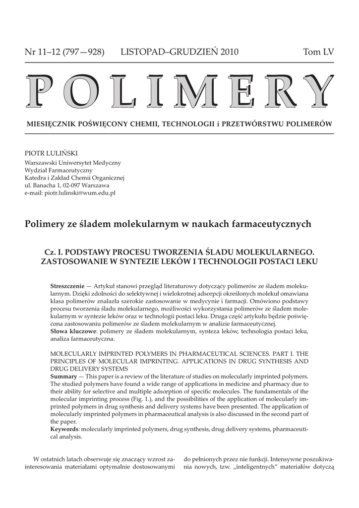 Nr 11–12 (797—928) LISTOPAD–GRUDZIEÑ 2010 Tom LV MIESIÊCZNIK POŒWIÊCONY CHEMII, TECHNOLOGII i PRZETWÓRSTWU POLIMERÓW PIOTR LULIÑSKI Warszawski Uniwersytet Medyczny Wydzia³ Farmaceutyczny Katedra i Zak³ad Chemii Organicznej ul. Banacha 1, 02-097 Warszawa e-mail: [email protected] Polimery ze œladem molekularnym w naukach farmaceutycznych Cz. I. PODSTAWY PROCESU TWORZENIA ŒLADU MOLEKULARNEGO. ZASTOSOWANIE W SYNTEZIE LEKÓW I TECHNOLOGII POSTACI LEKU Streszczenie — Artyku³ stanowi przegl¹d literaturowy dotycz¹cy polimerów ze œladem molekularnym. Dziêki zdolnoœci do selektywnej i wielokrotnej adsorpcji okreœlonych moleku³ omawiana klasa polimerów znalaz³a szerokie zastosowanie w medycynie i farmacji. Omówiono podstawy procesu tworzenia œladu molekularnego, mo¿liwoœci wykorzystania polimerów ze œladem molekularnym w syntezie leków oraz w technologii postaci leku. Druga czêœæ artyku³u bêdzie poœwiêcona zastosowaniu polimerów ze œladem molekularnym w analizie farmaceutycznej. S³owa kluczowe: polimery ze œladem molekularnym, synteza leków, technologia postaci leku, analiza farmaceutyczna. MOLECULARLY IMPRINTED POLYMERS IN PHARMACEUTICAL SCIENCES. PART I. THE PRINCIPLES OF MOLECULAR IMPRINTING. APPLICATIONS IN DRUG SYNTHESIS AND DRUG DELIVERY SYSTEMS Summary — This paper is a review of the literature of studies on molecularly imprinted polymers. The studied polymers have found a wide range of applications in medicine and pharmacy due to their ability for selective and multiple adsorption of specific molecules. The fundamentals of the molecular imprinting process (Fig. 1.), and the possibilities of the application of molecularly imprinted polymers in drug synthesis and delivery systems have been presented. The application of molecularly imprinted polymers in pharmaceutical analysis is also discussed in the second part of the paper. Keywords: molecularly imprinted polymers, drug synthesis, drug delivery systems, pharmaceutical analysis. W ostatnich latach obserwuje siê znacz¹cy wzrost zainteresowania materia³ami optymalnie dostosowanymi do pe³nionych przez nie funkcji. Intensywne poszukiwania nowych, tzw. „inteligentnych” materia³ów dotycz¹ POLIMERY 2010, 55, nr 11—12 800 m.in.: polimerów wra¿liwych na bodŸce [1, 2] lub polimerów z pamiêci¹ kszta³tu [3—5]. Materia³y polimerowe s¹ obecnie bardzo czêsto wykorzystywane w naukach farmaceutycznych. Zwi¹zki makrocz¹steczkowe znalaz³y zastosowanie jako noœniki w systemach kontrolowanego uwalniania substancji leczniczej, jako preparaty krwiozastêpcze oraz substancje pomocnicze [6]. Rozpoznanie molekularne zwi¹zane z komplementarnoœci¹ potencja³ów elektrostatycznych i sterycznych oddzia³ywuj¹cych cz¹stek determinuje aktywnoœæ organizmów ¿ywych, w których makrocz¹steczki s¹ tworzone z ³añcuchów polipeptydowych i polinukleotydowych. Na drodze drukowania molekularnego polimeru w matrycy polimerowej powstaje œlad molekularny. Procesy zachodz¹ce w ukszta³towanych wnêkach molekularnych imituj¹ naturalne procesy ustrojowe i naœladuj¹ zdolnoœæ rozpoznawania naturalnych biocz¹steczek. Polimery ze œladem molekularnym stanowi¹ klasê nowoczesnych materia³ów charakteryzuj¹cych siê zdolnoœci¹ do selektywnej i wielokrotnej adsorpcji okreœlonych cz¹steczek, du¿¹ wytrzyma³oœci¹ mechaniczn¹, trwa³oœci¹ termiczn¹ i chemiczn¹ a w wielu przypadkach mo¿na je otrzymaæ wzglêdnie prost¹ i niedrog¹ metod¹. Koncepcjê syntezy polimerów ze œladem molekularnym przedstawili, na pocz¹tku lat 70. XX w. Wulff i wspó³pr. [7]. W ci¹gu nastêpnych dwóch dekad badania tego procesu rozwija³y siê doœæ intensywnie, skupiaj¹c siê g³ównie na wyjaœnieniu podstaw zjawiska [8—10]. Wraz z postêpem w dziedzinie technik analitycznych, w tym ekstrakcji do fazy sta³ej, i poszukiwaniem nowych materia³ów cechuj¹cych siê lepszymi parametrami rozdzia³u zwi¹zków, szczególn¹ uwagê zwrócono na polimery ze œladem molekularnym [11]. Obecnie zainteresowanie t¹ klas¹ polimerów jest olbrzymie. Œwiadczy o tym kilkaset artyku³ów publikowanych rocznie w renomowanych czasopismach naukowych. Obszerna jest równie¿ literatura przegl¹dowa [12—19] i monograficzna [20, 21] oraz literatura patentowa [22—28]. PODSTAWY PROCESU TWORZENIA ŒLADU MOLEKULARNEGO Synteza polimeru ze œladem molekularnym przebiega w trzech zasadniczych etapach (rys. 1). Pierwszy etap obejmuje wytworzenie stabilnej struktury prepolimeryzacyjnej pomiêdzy cz¹steczk¹ tworz¹c¹ œlad (wzorcem) a monomerem funkcyjnym. Drugi etap stanowi reakcja polimeryzacji przebiegaj¹ca najczêœciej w obecnoœci czynników sieciuj¹cych. Ostatni etap polega na usuniêciu wzorca z matrycy polimerowej [12]. W celu oceny jakoœci polimeru ze œladem molekularnym oraz zdolnoœci do selektywnej adsorpcji wzorca, przeprowadza siê syntezê polimeru kontrolnego a nastêpnie poddaje siê analizie oba z³o¿a (najczêœciej z zastosowaniem technik chromatograficznych). Synteza polimeru ze œladem molekularnym i polimeru kontrolnego (b) (c) (d) (a) Rys. 1. Schemat przedstawiaj¹cy etapy procesu tworzenia œladu molekularnego, (a) wzorzec, (b) monomery funkcyjne, (c) kompleks prepolimeryzacyjny, (d) czynnik sieciuj¹cy Fig. 1. Schematic presentation of the imprinting process, (a) template, (b) functional monomers, (c) prepolymerization complex, (d) cross-linker przebiega w identyczny sposób jednak¿e w syntezie polimeru kontrolnego nie uczestniczy wzorzec [19]. W przypadku tworzenia œladu molekularnego wzorzec powinien zawieraæ okreœlone elementy strukturalne (np. grupy funkcyjne) oddzia³ywuj¹ce z monomerami funkcyjnymi. Istotna jest równie¿ budowa przestrzenna zwi¹zku [18]. Struktura wzorca determinuje wybór monomeru funkcyjnego. Krytycznym etapem syntezy polimeru ze œladem molekularnym jest uzyskanie trwa³ej struktury prepolimeryzacyjnej. Istniej¹ dwie strategie otrzymywania takiej stru