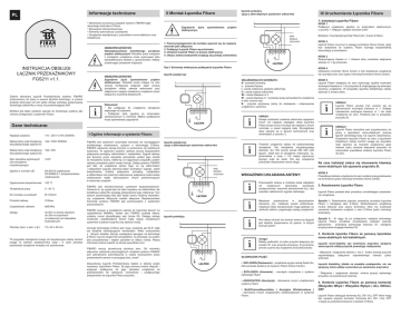 Informacje techniczne PL INSTRUKCJA OBSŁUGI ŁĄCZNIK PRZEKAŹNIKOWY FGS211 v1.1. Zdalnie sterowany Łącznik Przekaźnikowy systemu FIBARO przeznaczony do pracy w puszce łącznika ściennego, w puszce gniazda ściennego lub tam gdzie istnieje potrzeba wysterowania dowolnego odbiornika o mocy nie przekraczającej 3kW. Możliwe jest także wysłanie sygnału do dowolnego systemu jaki chcemy zintegrować z systemem Fibaro. Zagrożenie życia elektrycznym. 110 - 230 V ±10% 50/60Hz Maksymalny prąd obciążenia dla pojedynczego wyjścia AC 16A / 230V 50/60Hz Maksymalny prąd obciążenia dla pojedynczego wyjścia DC 16A / 30V Moc obwodów wyjściowych (dla obciążenia rezystancyjnego) 3 kW Zgodne z normami UE EN 55015 (zakłócenia) EN 60669-2-1 (bezpieczeństwo użytkowania) Ograniczenie temperaturowe 105 °C Temperatura pracy 0 - 40 °C Do montażu w puszkach Ø ≥ 50mm Protokół radiowy Z-Wave Częstotliwość radiowa 868 MHz Zasięg do 50m w terenie otwartym do 30m w budynkach (w zależności od materiałów budowlanych) Wymiary (wys. x szer. x gł.) 15 x 42 x 38 mm *W przypadku obciążenia innego niż rezystancyjne należy zwrócić uwagę na wartość współczynnika cosφ i w razie potrzeby zastosować obciążenie mniejsze niż znamionowe. KROK 1 Podłączyć urządzenie zgodnie ze schematem elektrycznym z rysunku 1. Włączyć napięcie sieciowe 230V. N prądem INNE ŹRÓDŁO ZASILANIA 1. Przed przystąpieniem do montażu upewnić się, że napięcie sieciowe jest odłączone. 2. Podłączyć Łącznik Fibaro wg schematu: 3. Umieścić Łącznik Fibaro w puszce elektrycznej. 4. Ułożyć antenę (wskazówki znajdują się poniżej schematów) I L N S1 S2 B O ŁĄCZNIK Rys.1 Schematy elektryczne podłączenia Łącznika Fibaro. NIEBEZPIECZEŃSTWO Zagrożenie życia spowodowane prądem elektrycznym. Wszelkie prace mające na celu zmianę konfiguracji połączeń bądź zmianę obciążenia należy zawsze wykonywać przy odłączonym napięciu zasilania w urządzeniu przez wyłączony wcześniej bezpiecznik. i OBJAŚNIENIA DO SCHEMATU: N - przewód neutralny L - przewód fazowy I - zacisk wejściowy zasilania odbiornika O - zacisk wyjścia odbiornika S2 - zacisk klawisza nr 2 S1 - zacisk klawisza nr 1 (posiada opcję wprowadzenia urządzenia w stan uczenia się) B - przycisk serwisowy (służy do dodawanie i odejmowania urządzenia z systemu) L N Wskazówki • Nie podłączać do urządzenia obciążenia większego niż zalecane. • Podłączać tylko zgodnie ze schematem zamieszczonym w instrukcji. Błędne podłączenie może spowodować zagrożenie. I L N S1 S2 O B ŁĄCZNIK i UWAGA Istnieje możliwość zasilania odbiornika napięciem innym niż napięcie zasilające układ Łącznika Fibaro (może to być inna faza lub napięcie o innym nominale, a nawet napięcie stałe. Szczegółowe dane zawarte są w danych technicznych oraz schematach z rysunku 1). i Trwałość urządzenia zależy od zastosowanego obciążenia. Dla obciążenia rezystancyjnego (żarówki, itp) 16A wynosi ponad 200 000 cykli łączeń. Jeżeli jest to obciążenie indukcyjne, np. jarzeniówka z cosφ = 0.6 należy ograniczyć płynący prąd do około 12A aby urządzenie pracowało niezawodnie równie długo. I Ogólne informacje o systemie Fibaro: FIBARO jest systemem automatyki domowej nie wymagającym dodatkowego okablowania, opartym o technologię Z-Wave. FIBARO zapewnia szereg korzyści w porównaniu do podobnych systemów. W ogólności systemy radiowe tworzą bezpośrednie połączenie pomiędzy odbiornikiem i nadajnikiem. Sygnał radiowy jest tłumiony przez wszystkie przeszkody wzdłuż jego ścieżki (w mieszkaniu ściany, meble itp.) w najgorszym przypadku system radiowy przestanie pełnić swoje funkcje. Zaletą systemu FIBARO jest fakt, że urządzenia oprócz tego, że są odbiornikiem i nadajnikiem sygnału stanowią także "powielacz" sygnału. Jeżeli bezpośrednia ścieżka połączenia pomiędzy nadajnikiem a odbiornikiem nie może być ustanowiona, połączenie może zostać zrealizowane dzięki wykorzystaniu innych pośredniczących w transmisji urządzeń. łącznik pojedynczy opcja z alternatywnym zasilaniem odbiornika L N INNE ŹRÓDŁO ZASILANIA FIBARO jest dwukierunkowym systemem bezprzewodowym. Oznacza to, że sygnał jest nie tylko wysyłany do odbiorników, ale dodatkowo odbiorniki wysyłają potwierdzenie jego odebrania. Tym samym potwierdzają swój stan dzięki czemu możemy stwierdzić, czy urządzenie faktycznie zostało włączone. Bezpieczeństwo transmisji systemu FIBARO jest porównywalne z systemami przewodowymi. FIBARO pracuje w bezpłatnym paśmie do transmisji danych na częstotliwości 868MHz. Każda sieć FIBARO posiada własny unikalny numer identyfikujący sieć (home ID). Dlatego istnieje możliwość współdziałania dwóch bądź więcej niezależnych systemów w jednym budynku bez żadnych kolizji. Chociaż technologia Z-Wave jest nowa, podobnie jak Wi-Fi stała się oficjalnie obowiązującym standardem. Wielu producentów z różnych dziedzin oferuje rozwiązania bazujące na technologii Z-Wave i są one wzajemnie kompatybilne. To powoduje, że system jest przyszłościowy i będzie pozwalał na dalszy rozwój. Więcej informacji można znaleźć na stronie www.fibaro.com. FIBARO tworzy dynamiczną strukturę sieci. Od momentu włączenia, położenie poszczególnych urządzeń systemu FIBARO jest uaktualniane automatycznie w czasie rzeczywistym przez potwierdzenie stanów w pracującej sieci „mesh”. Dopuszkowy Łącznik Przekaźnikowy będzie w dalszej części nazywany Łącznikiem Fibaro. Za jego pomocą można włączać i wyłączać podłączone do jego zacisków urządzenia za pośrednictwem fal radiowych, kontrolerów i podłączonego bezpośrednio do Łącznika Fibaro przycisku. I L N S1 S2 O B WSKAZÓWKI UKŁADANIA ANTENY: i Poprowadzić antenę w możliwie dużej odległości od metalowych elementów (przewody przyłączeniowe, wspor