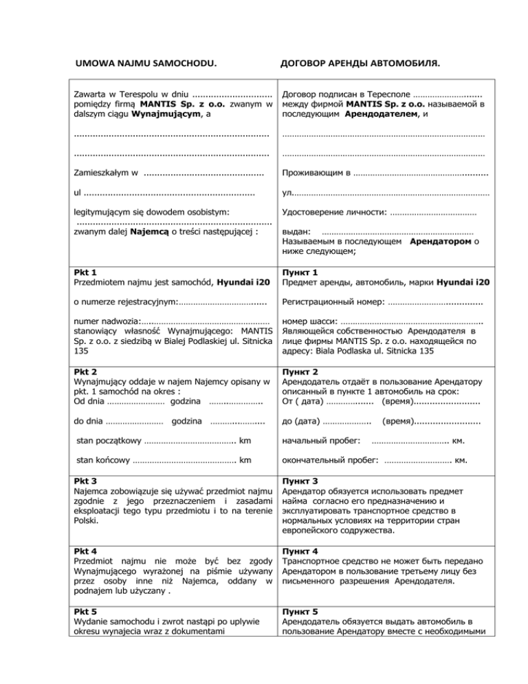 UMOWA NAJMU SAMOCHODU. ДОГОВОР АРЕНДЫ АВТОМОБИЛЯ. Zawarta w Terespolu w dniu .............................. pomiędzy firmą MANTIS Sp. z o.o. zwanym w dalszym ciągu Wynajmującym, a Договор подписан в Тересполе …………………....... между фирмой MANTIS Sp. z o.o. называемой в последующим Арендодателем, и ......................................................................... ………………………………………………………………………… ......................................................................... ………………………………………………………………………… Zamieszkałym w ............................................. Проживающим в ……………………………………….......... ul ................................................................ ул.……………………………………………………………………… legitymującym się dowodem osobistym: ......................................................................... zwanym dalej Najemcą o treści następującej : Удостоверение личности: ……………………………… Pkt 1 Przedmiotem najmu jest samochód, Hyundai i20 Пункт 1 Предмет аренды, автомобиль, марки Hyundai i20 o numerze rejestracyjnym:…………………………...... Регистрационный номер: …………………….............. numer nadwozia:…..………………………………………… stanowiący własność Wynajmującego: MANTIS Sp. z o.o. z siedzibą w Bialej Podlaskiej ul. Sitnicka 135 номер шасси: ………………………………………………….. Являющейся собственностью Арендодателя в лице фирмы MANTIS Sp. z o.o. находящейся по адресу: Biala Podlaska ul. Sitnicka 135 Pkt 2 Wynajmujący oddaje w najem Najemcy opisany w pkt. 1 samochód na okres : Od dnia …………………… godzina ……..………….. Пункт 2 Арендодатель отдаёт в пользование Арендатору описанный в пункте 1 автомобиль на срок: От ( дата) …………....... (время)......................... do dnia …………………… godzina ………...…….... до (дата) ……………….. выдан: ……………………………………………………… Называемым в последующем Арендатором о ниже следующем; (время)......................... stan początkowy ……………………………….. km начальный пробег: ………………………….. км. stan końcowy ……………………………………. km окончательный пробег: ………………………. км. Pkt 3 Najemca zobowiązuje się używać przedmiot najmu zgodnie z jego przeznaczeniem i zasadami eksploatacji tego typu przedmiotu i to na terenie Polski. Пункт 3 Арендатор обязуется использовать предмет найма согласно его предназначению и эксплуатировать транспортное средство в нормальных условиях на территории стран европейского содружества. Pkt 4 Przedmiot najmu nie może być bez zgody Wynajmującego wyrażonej na piśmie używany przez osoby inne niż Najemca, oddany w podnajem lub użyczany . Пункт 4 Транспортное средство не может быть передано Арендатором в пользование третьему лицу без письменного разрешения Арендодателя. Pkt 5 Wydanie samochodu i zwrot nastąpi po uplywie okresu wynajecia wraz z dokumentami Пункт 5 Арендодатель обязуется выдать автомобиль в пользование Арендатору вместе с необходимыми niezbednymi do eksploatacji pojazdu: - dowodem rejestracyjnym - dowodem ubezpieczenia polisą OC,AC oraz do uzgodnienia: nawigacją GPS 10zł / doba wydano: TAK / NIE fotelik dla dziecka 10zł / doba wydano : TAK / NIE - для эксплуатации документами транспортного средства: - свидетельство о регистрации - страховой полис (страхование гражданской ответственности и страхование КАСКО), а также при необходимости: навигатор GPS 10 злотых/сутки выдано: ДА / НЕТ -кресло детское 10 злотых/сутки выдано: ДА / НЕТ Pkt 6 Wynajmujący oświadcza, że samochód będący przedmiotem najmu jest ubezpieczony w zakresie OC,AC, posiada ważny przegląd techniczny,nie posiada uszkodzeń – co Najemca sprawdził i podpisując umowę potwierdza. Пункт 6 Арендодатель подтверждает, что автомобиль, который является объектом аренды, имеет действительный страховой полис и технический осмотр и не имеет видимых повреждений, что Арендатор, проверив, подписывает договор, подтверждая это. Pkt 7 Najemca zobowiązany jest do ponoszenia kosztów związanych z bieżącą eksploatacją samochodu i dokonywania drobnych napraw . Пункт 7 Арендатор обязан нести расходы по содержанию автомобиля в течение всего срока проката, а также произвести мелко срочный ремонт, если таковой потребуется. P