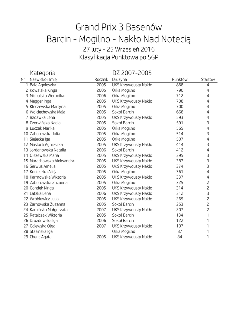 Grand Prix 3 Basenów Barcin - Mogilno - Nakło Nad Notecią 27 luty - 25 Wrzesień 2016 Klasyfikacja Punktowa po 5GP Kategoria Nr 1 2 3 4 5 6 7 8 9 10 11 12 13 14 15 16 17 18 19 20 21 22 23 24 25 26 27 28 29 Nazwisko i Imię Bala Agnieszka Kowalska Kinga Michalska Weronika Megger Inga Kleczewska Martyna Wojciechowska Maja Bzdawka Lena Czerwińska Nadia Łuczak Marika Zaborowska Julia Sielecka Iga Masloch Agnieszka Jordanowska Natalia Olszewska Maria Marachowska Aleksandra Serwus Amelia Konieczka Alicja Karmowska Wiktoria Zaborowska Zuzanna Gondek Kinga Latzka Lena Wróblewicz Julia Żarnowska Zuzanna Kamińska Małgorzata Ratajczak Wiktoria Drozdowska Iga Gajewska Olga Stasińska Iga Chenc Agata DZ 2007-2005 Rocznik 2005 2005 2006 2005 2005 2005 2005 2005 2005 2005 2005 2005 2006 2005 2005 2005 2005 2005 2005 2005 2006 2005 2005 2007 2005 2006 2007 2005 Drużyna UKS Krzywousty Nakło Orka Mogilno Orka Mogilno UKS Krzywousty Nakło Orka Mogilno Sokół Barcin UKS Krzywousty Nakło Sokół Barcin Orka Mogilno Orka Mogilno Orka Mogilno UKS Krzywousty Nakło Sokół Barcin UKS Krzywousty Nakło UKS Krzywousty Nakło UKS Krzywousty Nakło Orka Mogilno UKS Krzywousty Nakło Orka Mogilno UKS Krzywousty Nakło UKS Krzywousty Nakło UKS Krzywousty Nakło Sokół Barcin UKS Krzywousty Nakło Sokół Barcin Sokół Barcin UKS Krzywousty Nakło Orka Mogilno UKS Krzywousty Nakło Punktów 868 790 712 708 700 668 593 591 565 514 507 414 412 395 387 374 361 337 325 314 312 265 253 207 134 122 107 87 84 Startów 4 4 4 4 4 4 4 3 4 3 4 3 4 3 3 3 4 4 2 2 3 2 2 2 1 1 1 1 1 Grand Prix 3 Basenów Barcin - Mogilno - Nakło Nad Notecią 27 luty - 25 Wrzesień 2016 Klasyfikacja Punktowa po 5GP Kategoria Nr 1 2 3 4 5 6 7 8 9 10 11 12 13 14 15 16 17 18 19 20 21 22 23 24 Nazwisko i Imię Pater Martyna Owsińska Roksana Szwedziak Martyna Bochat Zofia Rafińska Iga Kucaj Martyna Ziomek Iga Ojczenasz Martyna Smoczyńska Magdalena Zamroczyńska Julita Śmigowska Aleksandra Wróblewska Oliwia Lesicka Julia Schuster Zuzanna Nowak Julia Sobol Agata Drozdowska Lena Sroka Zuzanna Dymel Zuzanna Masloch Anna Stolarska Julia Hałajczak Marika Kamińska Katarzyna Rogalska Anna DZ 2004-2003 Rocznik 2003 2003 2004 2003 2003 2003 2004 2003 2003 2003 2003 2004 2004 2004 2004 2003 2004 2004 2003 2003 Drużyna UKS Krzywousty Nakło Orka Mogilno UKS Krzywousty Nakło UKS Krzywousty Nakło Sokół Barcin Sokół Barcin UKS Krzywousty Nakło Sokół Barcin UKS Krzywousty Nakło Orka Mogilno Orka Mogilno Sokół Barcin Orka Mogilno UKS Krzywousty Nakło Sokół Barcin UKS Krzywousty Nakło Sokół Barcin UKS Krzywousty Nakło Orka Mogilno UKS Krzywousty Nakło Orka Mogilno Orka Mogilno UKS Krzywousty Nakło Orka Mogilno Punktów 1100 990 974 870 810 804 708 697 640 606 601 576 472 441 437 411 359 350 343 335 233 222 182 111 Startów 4 4 4 4 4 4 4 3 3 4 3 4 3 3 4 3 2 3 2 2 1 2 1 1 Grand Prix 3 Basenów Barcin - Mogilno - Nakło Nad Notecią 27 luty - 25 Wrzesień 2016 Klasyfikacja Punktowa po 5GP Kategoria Nr 1 2 3 4 5 6 7 Nazwisko i Imię Śmigielska Julia Weihs Patrycja Lisiecka Joanna Franczak Zuzanna Olejarz Martyna Marciniak Martyna Dominiczak Kamila DZ 2002-2001 Rocznik 2001 2002 2002 2001 2001 Drużyna Orka Mogilno Orka Mogilno Sokół Barcin UKS Krzywousty Nakło UKS Krzywousty Nakło Orka Mogilno Orka Mogilno Punktów 1012 935 861 780 759 515 267 Startów 4 4 4 4 3 3 1 Grand Prix 3 Basenów Barcin - Mogilno - Nakło Nad Notecią 27 luty - 25 Wrzesień 2016 Klasyfikacja Punktowa po 5GP Kategoria Nr 1 2 3 4 5 6 7 Nazwisko i Imię Staniek Agata Nowacka Martyna Ozimek Paulina Witkowska Beata Nowaczyk Dominika Kujawska Agata Kopiszka Paulina DZ 2000-1997 Rocznik 1997 1999 1999 1999 1998 2000 1999 Drużyna Orka Mogilno Orka Mogilno Orka Mogilno UKS Krzywousty Nakło UKS Krzywousty Nakło Orka Mogilno UKS Krzywousty Nakło Punktów 1527 922 880 398 236 232 118 Startów 4 3 3 2 1 1 1 Grand Prix 3 Basenów Barcin - Mogilno - Nakło Nad Notecią 27 luty - 25 Wrzesień 2016 Klasyfikacja Punktowa po 5GP Kategoria Nr 1 2 3 4 5 6 7 8 9 10 11 12 13 14 15 16 17 18 19 20 21 22 23 24 Nazwisko i Imię Szcześniak Dominik Szpara Maciej Wojtylak Oskar Łusiak Nicolas Koszny Kacper Markuszewski Aleksander Szurik Wiktor Rosenau Fabian Ignasiak Igor Matuszewski Marek Skubiszewski Filip Guth Marcel Sobczak Tymoteusz Maćkowiak Michał Łasa Mikołaj Czyżewski Marcel Giętkowski Igor Kopiszka Jakub Gapiński Hubert Kalisz Dominik Kraiński Dominik Krainski Dominik Rydlewski Nikodem Zyga Kornel CH 2007-2005 Rocznik 2005 2005 2005 2006 2005 2006 2005 2005 2005 2005 2006 2005 2005 2006 2007 2005 2006 2005 2005 2006 2005 2005 2005 (blank) Drużyna UKS Krzywousty Nakło UKS Krzywousty Nakło Orka Mogilno UKS Krzywousty Nakło UKS Krzywousty Nakło UKS Krzywousty Nakło UKS Krzywousty Nakło UKS Krzywousty Nakło UKS Krzywousty Nakło Sokół Barcin UKS Krzywousty Nakło UKS Krzywousty Nakło UKS Krzywousty Nakło Sokół Barcin UKS Krzywousty Nakło Sokół Barcin Sokół Barcin UKS Krzywousty Nakło UKS Krzywousty Nakło UKS Krzywousty Nakło UKS Krzywousty Nakło UKS Krzywousty Nakło Sokół Barcin Orka Mogilno Punktów 739 617 515 480 462 433 409 387 350 335 309 307 307 256 206 193 179 175 135 83 75 72 66 55 Startów 4 4 4 4 4 4 4 4 4 3 4 4 4 4 3 2 2 2 2 1 1 1 1 1 Grand Prix 3 Basenów Barcin - Mogilno - Nakło Nad Notecią 27 luty - 25 Wrzesień 2016 Klasyfikacja Punktowa po 5GP Kategoria Nr 1 2 3 4 5 6 7 8 9 10 11 12 13 14 15 16 17 18 19 20 Nazwisko i Imię Tomyślak Jakub Ziomek Mikołaj Nowak Wiktor Baczyński Wiktor Wolski Jędrzej Żarnowski Michał Bąk Bartłomiej Maciążek Marcel Piechociński Maksymilian Wojciechowski Dominik Wesołek Jakub Baliniak Patryk Grzeszczak Mikołaj Sielecki Kacper Błażejewski Marcel Naborczyk Krystian Ruciński Beniamin Młynarczyk Cyprian Adamczak Mateusz Szafrański Wiktor CH 2004-2003 Rocznik 2003 2003 2003 2004 2004 2003 2003 2004 2003 2004 2003 2004 2004 2004 2004 2003 2003 2003 Drużyna UKS Krzywousty Nakło