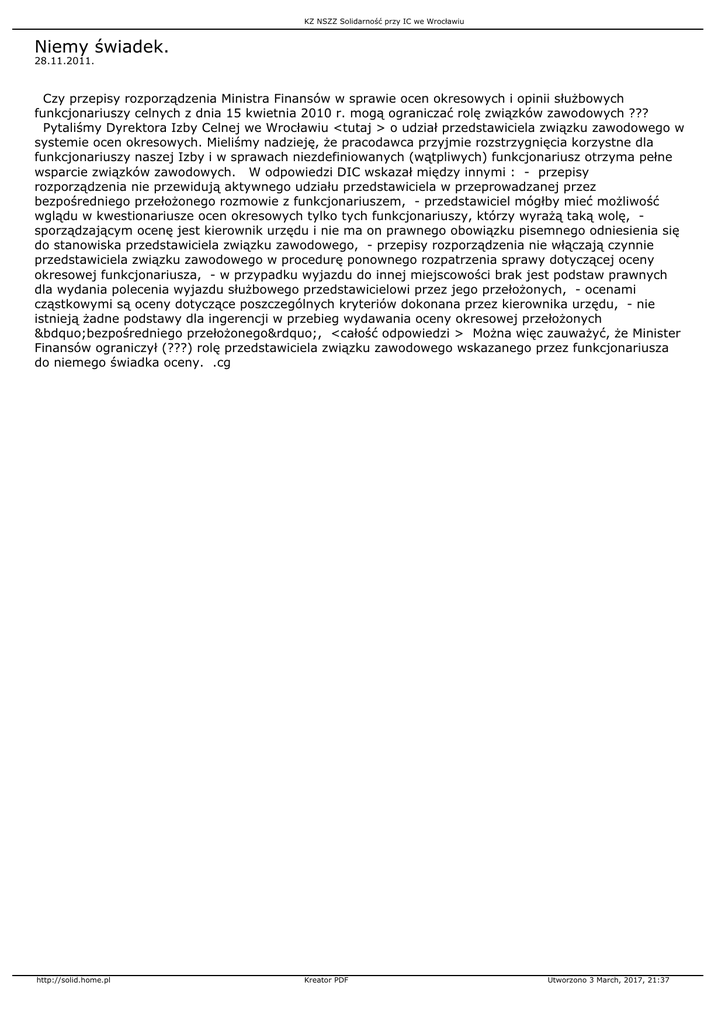 KZ NSZZ Solidarność przy IC we Wrocławiu Niemy świadek. 28.11.2011. Czy przepisy rozporządzenia Ministra Finansów w sprawie ocen okresowych i opinii służbowych funkcjonariuszy celnych z dnia 15 kwietnia 2010 r. mogą ograniczać rolę związków zawodowych ??? Pytaliśmy Dyrektora Izby Celnej we Wrocławiu <tutaj > o udział przedstawiciela związku zawodowego w systemie ocen okresowych. Mieliśmy nadzieję, że pracodawca przyjmie rozstrzygnięcia korzystne dla funkcjonariuszy naszej Izby i w sprawach niezdefiniowanych (wątpliwych) funkcjonariusz otrzyma pełne wsparcie związków zawodowych. W odpowiedzi DIC wskazał między innymi : - przepisy rozporządzenia nie przewidują aktywnego udziału przedstawiciela w przeprowadzanej przez bezpośredniego przełożonego rozmowie z funkcjonariuszem, - przedstawiciel mógłby mieć możliwość wglądu w kwestionariusze ocen okresowych tylko tych funkcjonariuszy, którzy wyrażą taką wolę, sporządzającym ocenę jest kierownik urzędu i nie ma on prawnego obowiązku pisemnego odniesienia się do stanowiska przedstawiciela związku zawodowego, - przepisy rozporządzenia nie włączają czynnie przedstawiciela związku zawodowego w procedurę ponownego rozpatrzenia sprawy dotyczącej oceny okresowej funkcjonariusza, - w przypadku wyjazdu do innej miejscowości brak jest podstaw prawnych dla wydania polecenia wyjazdu służbowego przedstawicielowi przez jego przełożonych, - ocenami cząstkowymi są oceny dotyczące poszczególnych kryteriów dokonana przez kierownika urzędu, - nie istnieją żadne podstawy dla ingerencji w przebieg wydawania oceny okresowej przełożonych „bezpośredniego przełożonego”, <całość odpowiedzi > Można więc zauważyć, że Minister Finansów ograniczył (???) rolę przedstawiciela związku zawodowego wskazanego przez funkcjonariusza do niemego świadka oceny. .cg http://solid.home.pl Kreator PDF Utworzono 3 March, 2017, 21:37