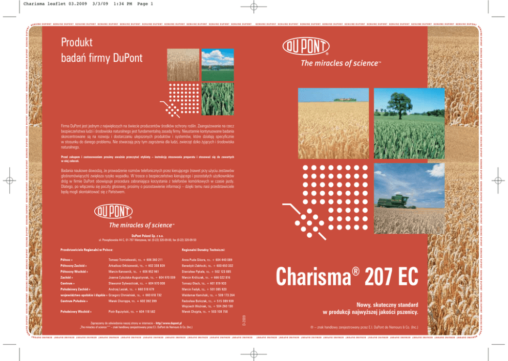 Charisma leaflet 03.2009 3/3/09 1:34 PM Page 1 Produkt badaƒ firmy DuPont Firma DuPont jest jednym z najwi´kszych na Êwiecie producentów Êrodków ochrony roÊlin. Zaanga˝owanie na rzecz bezpieczeƒstwa ludzi i Êrodowiska naturalnego jest fundamentalnà zasadà firmy. Nieustannie kontynuowane badania skoncentrowane sà na rozwoju i dostarczaniu ulepszonych produktów i systemów, które dzia∏ajà specyficznie w stosunku do danego problemu. Nie stwarzajà przy tym zagro˝enia dla ludzi, zwierzàt dziko ˝yjàcych i Êrodowiska naturalnego. Przed zakupem i zastosowaniem prosimy uwa˝nie przeczytaç etykiet´ – instrukcj´ stosowania preparatu i stosowaç si´ do zawartych w niej zaleceƒ. Badania naukowe dowodzà, ˝e prowadzenie rozmów telefonicznych przez kierujàcego (nawet przy u˝yciu zestawów g∏oÊnomówiàcych) zwi´ksza ryzyko wypadku. W trosce o bezpieczeƒstwo kierujàcego i pozosta∏ych u˝ytkowników dróg w firmie DuPont obowiàzuje procedura zabraniajàca korzystania z telefonów komórkowych w czasie jazdy. Dlatego, po w∏àczeniu si´ poczty g∏osowej, prosimy o pozostawienie informacji – dzi´ki temu nasi przedstawiciele b´dà mogli skontaktowaç si´ z Paƒstwem. DuPont Poland Sp. z o.o. ul. Powàzkowska 44 C, 01-797 Warszawa, tel. (0-22) 320-09-00, fax (0-22) 320-09-50 ® Zapraszamy do odwiedzenia naszej strony w internecie – http//:www.dupont.pl „The miracles of science™“ – znak handlowy zarejestrowany przez E.I. DuPont de Nemours & Co. (Inc.) D-2009 Charisma 207 EC Nowy, skuteczny standard w produkcji najwy˝szej jakoÊci pszenicy. ® – znak handlowy zarejestrowany przez E.I. DuPont de Nemours & Co. (Inc.) Charisma leaflet 03.2009 3/3/09 1:34 PM Page 3 Charisma® 207 EC Charisma® 207 EC wskazówki praktyczne wskazówki praktyczne Charisma® 207 EC firmy DuPont – nowy dwusk∏adnikowy fungicyd o unikalnym i d∏ugim okresie dzia∏ania, zwalczajàcy szerokie spektrum najgroêniejszych chorób w uprawie zbó˝. Charisma® bardzo skutecznie zwalcza choroby podstawy êdêb∏a, dolnych liÊci i k∏osa. Charisma®, dzi´ki swym w∏aÊciwoÊciom biologicznym, zapewnia najlepsze efekty w zwalczaniu chorób powodujàcych najwi´ksze straty w wielkoÊci i jakoÊci uzyskiwanych plonów. Charisma®, wp∏ywajàc bezpoÊrednio na procesy metaboliczne roÊliny, a zw∏aszcza na proces fotosyntezy, powoduje zwy˝ki plonu nawet w przypadku braku chorób w ∏anie. Charisma® 207 EC to nowy, skuteczny standard w produkcji najwy˝szej jakoÊci pszenicy. Charisma® to efektywne po∏àczenie dwóch uzupe∏niajàcych si´ substancji biologicznie czynnych, o ró˝nych mechanizmach dzia∏ania: Famoxate® i flusilazolu. Septorioza liÊci OKRES KARENCJI - okres od ostatniego zabiegu do zbioru – 35 dni. Septorioza k∏osów WYKONANIE OPRYSKIWANIA - zalecana iloÊç wody: 200-400 l/ha, - zalecane opryskiwanie – drobnokropliste. Ârodka nie stosowaç na roÊliny mokre lub pokryte rosà. Famoxate® jest nowà, unikalnà substancjà, jedynym przedstawicielem nowej grupy chemicznej – oxazolidyn. Famoxate® to unikalny mechanizm dzia∏ania – zak∏óca procesy wytwarzania energii niezb´dnej do rozwoju grzybni w roÊlinach oraz powstawania i kie∏kowania zarodników. Flusilazol jest znanà i sprawdzonà w szerokiej praktyce substancjà z grupy triazoli, odznaczajàcà si´ wysokà skutecznoÊcià w zwalczaniu wielu groênych chorób. W wyniku po∏àczenia tych dwóch sk∏adników Charisma® odznacza si´ wielokierunkowym sposobem dzia∏ania, co zapewnia bardzo wysokà skutecznoÊç w zwalczaniu chorób i d∏u˝szy okres dzia∏ania. Zapobiega to tak˝e rozwojowi genetycznej odpornoÊci patogenu na preparat. Charisma® jest fungicydem o dzia∏aniu systemicznym i kontaktowym, dzia∏a zapobiegawczo i leczniczo, a tak˝e hamuje wytwarzanie zarodników patogenów, przez co zapewnia d∏ugi okres skutecznej ochrony zbó˝. Màczniak prawdziwy Brunatna plamistoÊç liÊci Rynchosporioza PlamistoÊç siatkowa Fuzarioza k∏osa SPORZÑDZANIE CIECZY U˚YTKOWEJ Przed u˝yciem wstrzàsnàç opakowaniem. Odmierzonà iloÊç Êrodka wlaç do zbiornika opryskiwacza nape∏nionego cz´Êciowo wodà (z w∏àczonym mieszad∏em) i uzupe∏niç wodà do potrzebnej iloÊci. Opró˝nione opakowanie przep∏ukaç trzykrotnie wodà, a pop∏uczyny wlaç do zbiornika opryskiwacza z cieczà u˝ytkowà. UWAGA Podczas wykonywania zabiegów nie dopuÊciç do przedostawania si´ Êrodka do zbiorników i cieków wodnych. MAGAZYNOWANIE Preparat nale˝y przechowywaç wy∏àcznie w oryginalnym, szczelnie zamkni´tym opakowaniu, w suchych i dobrze wentylowanych magazynach, z dala od êróde∏ ciep∏a, w temperaturze 0-30°C. Charisma leaflet 03.2009 3/3/09 1:34 PM Page 5 Charisma® 207 EC Charisma® 207 EC wskazówki praktyczne intensywna technologia produkcji pszenicy ozimej ® Charisma – najwy˝sza skutecznoÊç za rozsàdnà cen´ Dà˝eniem ka˝dego producenta zbó˝, a szczególnie producenta pszenicy, jest uzyskanie najwy˝szego plonu o najlepszych parametrach jakoÊciowych. W cyklu uprawy te aspekty przyÊwiecajà rolnikowi przy wyborze preparatów chroniàcych przed chorobami. Charisma® daje mo˝liwoÊç zastosowania najbardziej intensywnej i efektywnej technologii w rozsàdnej cenie (Technologia PREMIUM) – ni˝szej ni˝ przy zastosowaniu preparatów z grupy strobiluryn. Pszenica ozima ulega pora˝eniu wieloma patogenami jeszcze w okresie jesienno-zimowym lub wczesnà wiosnà. Dlatego nale˝y dà˝yç do zabezpieczenia zbo˝a od najwczeÊniejszych faz rozwojowych, wykonujàc pierwszy zabieg wczeÊnie wiosnà, do fazy pierwszego kolanka pszenicy, rekomendujemy mieszanin´ Alert® 0,8 l/ha + Talius® 0,15 l/ha. Zastosowanie preparatu Charisma® zaleca si´ do drugiego zabiegu, w fazie liÊcia flagowego, do fazy poczàtku k∏oszenia. LiÊç flagowy Wykres 1 Plonowanie pszenicy ozimej w zale˝noÊci od zastosowanego programu zwalczania chorób (SDOO G∏ubczyce 20