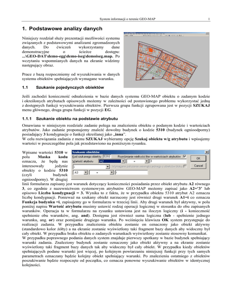 System informacji o terenie GEO-MAP 1 1. Podstawowe analizy danych Niniejszy rozdział służy prezentacji możliwości systemu związanych z podstawowymi analizami zgromadzonych danych. Do ćwiczeń wykorzystamy dane demonstracyjne o ścieżce dostępu: ...\GEO-DAT\demo-egg\demo-iseg\demoiseg.map. Po wczytaniu wspomnianych danych na ekranie widzimy następujący obraz. Prace z bazą rozpoczniemy od wyszukiwania w danych systemu obiektów spełniających wymagane warunku. 1.1 Szukanie pojedynczych obiektów Jeśli zachodzi konieczność odnalezienia w bazie danych systemu GEO-MAP obiektu o zadanym kodzie i określonych atrybutach opisowych możemy w zależności od postawionego problemu wykorzystać jedną z dostępnych funkcji wyszukiwania obiektów. Pierwsza grupa funkcji zgrupowana jest w pozycji SZUKAJ menu głównego, druga grupa funkcji w pozycji EG. 1.1.1 Szukanie obiektu na podstawie atrybutu Omawiana w niniejszym rozdziale zadanie polega na znalezieniu obiektu o podanym kodzie i wartościach atrybutów. Jako zadanie proponujemy znaleźć dowolny budynek o kodzie 5310 (budynek ognioodporny) posiadający 3 kondygnacje o funkcji określanej jako „inna”. W celu rozwiązania zadania z menu SZUKAJ wybieramy opcję Szukaj obiektu w/g atrybutu i wpisujemy wartości w poszczególne pola jak przedstawiono na poniższym rysunku. Wpisane wartości 5310 w polu Maska kodu oznacza, że będą nas interesowały jedynie obiekty o kodzie 5310 (czyli budynek ognioodporny). W drugiej linii formularza zapisany jest warunek dotyczący konieczności posiadania przez obiekt atrybutu A2 równego 3, co zgodnie z nazewnictwem systemowym atrybutów GEO-MAP możemy zapisać jako A2=’3’ lub opisowo Liczba kondygnacji = 3. Wynika to z faktu, że w przypadku obiektu 5310 atrybut A2 oznacza liczbę kondygnacji. Ponieważ na szukany obiekt narzucony jest również drugi warunek A1=i co oznacza Funkcja budynku =i, zapisujemy go w formularzu w trzeciej linii. Aby drugi warunek był aktywny, w polu poniżej napisu Wartość atrybutu musimy ustawić rodzaj operacji logicznej w stosunku do obu zapisanych warunków. Operacja ta w formularzu na rysunku ustawiona jest na iloczyn logiczny (i - konieczność spełnienie obu warunków, ang. and). Dostępna jest również suma logiczna (lub - spełnienie jednego warunku, ang. or) oraz pomijanie drugiego warunku. Po wciśnięciu klawisza OK system przystępuje do realizacji zadania. W przypadku znalezienia obiektu zostanie on oznaczony jako obiekt aktywny (standardowo kolor żółty) a na ekranie zostanie wyświetlony taki fragment bazy danych aby widoczny był cały obiekt. W przypadku braku obiektu o zadanych warunkach wyświetlony zostanie stosowny komunikat. W przypadku poprawnego podania danych system znajduje pierwszy spotkany w bazie budynek spełniający warunki zadania. Znaleziony budynek zostanie oznaczony jako obiekt aktywny a na ekranie zostanie wyświetlony taki fragment bazy danych tak aby widoczny był cały obiekt. W przypadku kiedy obiektów spełniających podane warunki jest więcej, po kolejnym powtarzaniu niniejszej funkcji przy tych samych parametrach oznaczany będzie kolejny obiekt spełniający warunki. Po znalezieniu ostatniego z obiektów poszukiwanie będzie rozpoczęte od początku, co oznacza ponowne wyszukiwanie obiektów w identycznej kolejności. System informacji o terenie GEO-MAP 1.2 2 Szukanie działki System GEO-MAP pozwala na szukanie obiektów wszystkich typów narzędziami uniwersalnymi, jednak działki zostały potraktowane w sposób szczególny i posiadają własne (specyficzne głównie ze względu na ułatwienia dla użytkownika) narzędzia analiz i poszukiwań (nie wyklucza to jednak stosowania do nich narzędzi ogólnych). Poniżej przedstawiamy przykład szukania działki o numerze 54/2 z obrębu 31. Z menu głównego wybieramy pozycję EG\Szukaj działki z obrębu i wpisujemy w poszczególne pola wartości jak przedstawiono na rysunku z prawej strony. Funkcję możemy również uaktywnić skrótem klawiszowym F9. Ułatwieniem dla użytkownika jest możliwość skorzystania z rozwijalnej listy obrębów w polu Obręb. W tym celu należy kliknąć na przycisk , aby rozwinęła się lista, a następnie wybrać odpowiedni obręb korzystając z paska przewijania po prawej stronie. Można także wpisywać początkowe znaki numeru obrębu a system będzie automatycznie odnajdywał obręby, które zaczynają się od tej frazy. Na liście tej znajdą się wszystkie obręby znajdujące się w bazie. Po wypełnieniu pól odpowiednimi wartościami, klikamy lewym klawiszem myszy na przycisk uruchamiając w ten sposób funkcję szukania. System znajdzie interesującą nas działkę i oznaczy ją jako obiekt aktywny a na ekranie zostanie wyświetlony taki fragment bazy danych tak aby widoczna była cała działka. W przypadku braku szukanej działki wyświetlony zostanie komunikat o braku takiego obiektu. Jeżeli nie podamy numeru działki, a wpiszemy tylko numer obrębu, zostanie wyszukany odpowiadający podanemu numerowi obręb i tak samo zaprezentowany na ekranie jak działka. System informacji o terenie GEO-MAP 1.3 3 Szukanie granicznika o określonym numerze Inną funkcją służącą do wyszukiwania określonych obiektów jest funkcja szukania granicznika o podanym numerze. Aby zrealizować zadanie z menu głównego wybieramy EG\Szukanie granicznika i wypełniamy jedynie pole formularza zawierające numer szukanego punktu jak na rysunku poniżej. Funkcję możemy również uaktywnić skrótem klawiszowym Shift+F9. Po wciśnięciu klawisza OK system odnajduje szukany punkt i wyświetla fragment bazy danych tak aby w centralnym punkcie ekranu znalazł się znaleziony punkt. Jeśli punkt o podanym numerze nie istnieje wtedy jest to sygnalizowane odpowiednim komunikatem. 1.4 Szukanie działki na podstawie numeru KW W trakcie porównywania bazy geometrycznej z bazą opisową ewidencji gruntów, może zostać wpisany do każdej dział