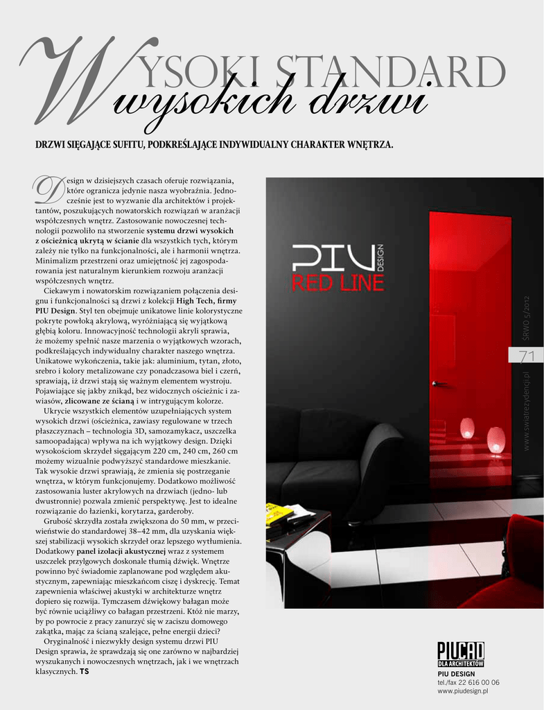 W wysokich drzwi ysoki standard Drzwi sięgające sufitu, podkreślające indywidualny charakter wnętrza. ŚRWO 5/2012 D 71 www.swiatrezydencji.pl esign w dzisiejszych czasach oferuje rozwiązania, które ogranicza jedynie nasza wyobraźnia. Jednocześnie jest to wyzwanie dla architektów i projektantów, poszukujących nowatorskich rozwiązań w aranżacji współczesnych wnętrz. Zastosowanie nowoczesnej technologii pozwoliło na stworzenie systemu drzwi wysokich z ościeżnicą ukrytą w ścianie dla wszystkich tych, którym zależy nie tylko na funkcjonalności, ale i harmonii wnętrza. Minimalizm przestrzeni oraz umiejętność jej zagospodarowania jest naturalnym kierunkiem rozwoju aranżacji współczesnych wnętrz. Ciekawym i nowatorskim rozwiązaniem połączenia designu i funkcjonalności są drzwi z kolekcji High Tech, firmy PIU Design. Styl ten obejmuje unikatowe linie kolorystyczne pokryte powłoką akrylową, wyróżniającą się wyjątkową głębią koloru. Innowacyjność technologii akryli sprawia, że możemy spełnić nasze marzenia o wyjątkowych wzorach, podkreślających indywidualny charakter naszego wnętrza. Unikatowe wykończenia, takie jak: aluminium, tytan, złoto, srebro i kolory metalizowane czy ponadczasowa biel i czerń, sprawiają, iż drzwi stają się ważnym elementem wystroju. Pojawiające się jakby znikąd, bez widocznych ościeżnic i zawiasów, zlicowane ze ścianą i w intrygującym kolorze. Ukrycie wszystkich elementów uzupełniających system wysokich drzwi (ościeżnica, zawiasy regulowane w trzech płaszczyznach – technologia 3D, samozamykacz, uszczelka samoopadająca) wpływa na ich wyjątkowy design. Dzięki wysokościom skrzydeł sięgającym 220 cm, 240 cm, 260 cm możemy wizualnie podwyższyć standardowe mieszkanie. Tak wysokie drzwi sprawiają, że zmienia się postrzeganie wnętrza, w którym funkcjonujemy. Dodatkowo możliwość zastosowania luster akrylowych na drzwiach (jedno- lub dwustronnie) pozwala zmienić perspektywę. Jest to idealne rozwiązanie do łazienki, korytarza, garderoby. Grubość skrzydła została zwiększona do 50 mm, w przeciwieństwie do standardowej 38–42 mm, dla uzyskania większej stabilizacji wysokich skrzydeł oraz lepszego wytłumienia. Dodatkowy panel izolacji akustycznej wraz z systemem uszczelek przylgowych doskonale tłumią dźwięk. Wnętrze powinno być świadomie zaplanowane pod względem akustycznym, zapewniając mieszkańcom ciszę i dyskrecję. Temat zapewnienia właściwej akustyki w architekturze wnętrz dopiero się rozwija. Tymczasem dźwiękowy bałagan może być równie uciążliwy co bałagan przestrzeni. Któż nie marzy, by po powrocie z pracy zanurzyć się w zaciszu domowego zakątka, mając za ścianą szalejące, pełne energii dzieci? Oryginalność i niezwykły design systemu drzwi PIU Design sprawia, że sprawdzają się one zarówno w najbardziej wyszukanych i nowoczesnych wnętrzach, jak i we wnętrzach klasycznych. TS PIU DESIGN tel./fax 22 616 00 06 www.piudesign.pl