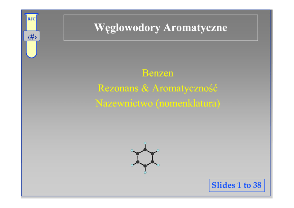 RJC Węglowodory Aromatyczne ‹#› Benzen Rezonans & Aromatyczność Nazewnictwo (nomenklatura) Slides 1 to 38 RJC Węglowodory Aromatyczne ‹#› W pierwotnym znaczeniu słowo “aroma “aroma”” nawiązywało do pachnących składników roślin; obecnie, związki aromatyczne są definiowane jako klasa węglowodorów oraz ich pochodnych, dla których najprostszym przedstawicielem jest benzen o wzorze sumarycznym C6H6. RJC Benzen... Właściwości Fizyczne ‹#› • Wzór sumaryczny C6H6 • Bezbarwna ciecz • Łatwopalny • Charakterystyczny zapach RJC Benzen... Wybrane Zastosowania ‹#› • farmaceutyki • barwniki • środki czyszczące • rozpuszczalniki farb i lakierów RJC Benzen... ZagroŜenia ‹#› • PodraŜnienie błon śluzowych • PodraŜnienie, konwulsje • Depresje, leukemia • Przypadki śmiertelne – zatrucia ! RJC Benzen... Źródła Pozyskiwania ‹#› ...kraking termiczny węgla oraz surowej ropy naftowej. Benzen stanowi cenny surowiec dla przemysłu chemicznego ... ... jest jednak zaliczany do grupy niebezpiecznych chemikaliów. RJC ‹#› Pierwsze, Historyczne Struktury Zaproponowane dla Benzenu W połowie XIX wieku zaproponowano trzy struktury dla benzenu (C6H6) Dewar Ladenburg Kekule RJC Symetria Cząsteczki Benzenu ‹#› PoniewaŜ stwierdzono, Ŝe cząsteczka benzenu jest symetryczna, struktura Dewara została wyeliminowana. Dewar Ladenburg Kekule RJC Reaktywność ‹#› Benzen jest związkiem reaktywnym; takiej właściwości nie zapewniała struktura Ladenburga. Dewar Ladenburg Kekule RJC ‹#› Sen Kekulego a Struktura Benzenu RJC Reakcje Addycji ‹#› Wiadomo dobrze, Ŝe cząsteczka Br2 łatwo ulega przyłączeniu do wiązania podwójnego C=C (reaktywność alkenów). Br Br Br2 R R R R RJC ‹#› Dalsze, Wybrane Izomery C6H6; Łącznie 217 Struktur ! RJC Reakcje Podstawienia (Substytucji) ‹#› W wyniku reakcji z bromem Br2, benzen ulega reakcji substytucji dając bromobenzen. Br Br2 RJC Dibromobenzeny ‹#› Bromobenzen moŜe dalej ulegać reakcji z Br2 dając trzy izomeryczne dibromobenzeny (trzy izomery strukturalne C6H4Br2). Br Br Br Br Br Br RJC Izomery orto vs meta vs para (o, m, p) ‹#› Te trzy izomery określają sposób podstawienia w dipodstawionych pochodnych benzenu ... R R R R R ortho meta R para RJC A co z Czwartym Izomerem? ‹#› Na pierwszy rzut oka wydaje się, Ŝe moŜliwe są dwa oo-dibromobenzeny ? Br Br Br Br RJC Rezonans ‹#› Trzy wiązania ‘podwójne’ w benzenie są sprzęŜone i znajdują się w stanie rezonansu (są sprzęŜone ze sobą). RJC ‹#› Struktura Rezonansowa Cząsteczki Benzenu Strzałka rezonansowa (z dwoma grotami) jest stosowana w celu zapisania struktur rezonansowych. WAśNE : zjawisko rezonansu dotyczy wyłącznie ruchu (przemieszczenia) elektronów ! Atomy nie zmieniają swoich pozycji ! RJC Substytucja vs Addycja ‹#› Z powodu stabilizacji rezonansowej, benzen jest znacznie mniej reaktywny niŜ typowe alkeny (alkatrieny). Br Br Br addn subsn RJC ‹#› Uwodornienie Cykloheksenu Addycja cząsteczki H2 do cycloheksenu prowadzi do bardziej trwałego cykloheksanu. addn ∆G° -ve ∴ reakcja egzotermiczna (28.6 kcal/mol) RJC Uwodornienie CykloheksaCykloheksa-1,31,3-dienu ‹#› Addycja dwóch moli H2 do cyclohexacyclohexa-1,31,3-dienu prowadzi do bardziej trwałego cykloheksanu. addn ∆G° ∴ reakcja egzotermiczna (55.4.6 kcal/mol) RJC Uwodornienie Benzenu ‹#› Addycja 3 moli H2 do benzenu prowadzi do otrzymania cykloheksanu. addn ∆G° -ve ∴ reakcja egzotermiczna (49.8 kcal/mol) RJC Stabilizacja Rezonansowa ‹#› Cząsteczka benzenu jest o 36 kcal/mol bardziej trwała dzięki stabilizacji rezonansowej. (3 x 28.6) - 49.8 = 36 kcal/mol KaŜdy proces, który zakłóca stabilizację rezonansową (addycja) jest niekorzystny wobec takiego, który nie zakłóca stabilizacji (substytucja) RJC Aromatyczność ‹#› Wszystkie sprzęŜone wiązania podwójne są stabilizowane energią rezonansu, lecz układy aromatyczne posiadają jeszcze większą, specjalną stabilizację ... ... takie określenie stanowi w części, definicję związku aromatycznego. RJC ‹#› Reguła Huckela [Reguła (4n + 2)] Cząsteczka związku aromatycznego posiada charakter aromatyczny, jeŜeli … “...posiada planarny, cykliczny układ sprzęŜonych orbitali p posiadających (4n + 2) elektronów, (gdzie n jest liczbą naturalną)...” RJC ‹#› Cyklopropen sprzęŜony × planarny √ monocykliczny √ 4n + 2 √ aromatyczny × Click on picture to play movie RJC ‹#› Cyclobutadien sprzęŜony √ planarny √ monocykliczny √ 4n + 2 × aromatyczny × Click on picture to play movie RJC ‹#› Cyclopentadien sprzęŜony × planarny √ monocykliczny √ 4n + 2 × aromatyczny × Click on picture to play movie RJC Benzen ‹#› sprzęŜony √ planarny √ monocykliczny √ 4n + 2 √ aromatyczny √ Click on picture to play movie RJC ‹#› Cyklohepta--1,3,5Cyklohepta 1,3,5-trien sprzęŜony × planarny × monocykliczny √ 4n + 2 √ aromatyczny × Click on picture to play movie RJC ‹#› Cyklooktatetraen sprzęŜony √ planarny √ monocykliczny √ 4n + 2 × aromatyczny × Click on picture to play movie RJC Pirydyna ‹#› N sprzęŜony √ planarny √ monocykliczny √ 4n + 2 √ aromatyczny √ Click on picture to play movie RJC Pirol ‹#› N H sprzęŜony √ planarny √ monocykliczny √ 4n + 2 √ aromatyczny √ Click on picture to play movie RJC ‹#› Nazewnictwo Pochodnych Benzenu: nazwy zwyczajowe OH OCH3 fenol CHO benzaldehyd anizol O CH3 acetofenon CH2OH alkohol benzylowy CO2H kwas benzoesowy RJC ‹#› Nazewnictwo Pochodnych Benzenu: nazwy zwyczajowe NH2 CN anilina benzonitryl CH3 CH3 CH3 toluen kumen styren CH3 CH3 o-ksylen RJC Nazewnictwo IUPAC ‹#› ... ...dla dla struktur związków nie pochodzących od nazw zwyczajowych… Monopodstawione pochodne benzenu są identyfikowane poprzez przyrostek benzen... (np. bromobenzen) Dipodstawione pochodne be