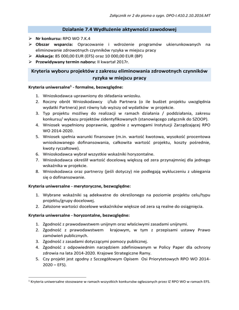 Załącznik nr 2 do pisma o sygn. DPO-I.410.2.10.2016.MT Działanie 7.4 Wydłużenie aktywności zawodowej Nr konkursu: RPO WO 7.K.4 Obszar wsparcia: Opracowanie i wdrożenie programów ukierunkowanych na eliminowanie zdrowotnych czynników ryzyka w miejscu pracy Alokacja: 85 000,00 EUR (EFS) oraz 10 000,00 EUR (BP) Przewidywany termin naboru: II kwartał 2017r. Kryteria wyboru projektów z zakresu eliminowania zdrowotnych czynników ryzyka w miejscu pracy Kryteria uniwersalne1 - formalne, bezwzględne: 1. Wnioskodawca uprawniony do składania wniosku. 2. Roczny obrót Wnioskodawcy i/lub Partnera (o ile budżet projektu uwzględnia wydatki Partnera) jest równy lub wyższy od wydatków w projekcie. 3. Typ projektu możliwy do realizacji w ramach działania / poddziałania, zakresu konkursu/ wykazu projektów zidentyfikowanych (stanowiącego załącznik do SZOOP). 4. Wniosek wypełniony poprawnie, zgodnie z wymogami Instytucji Zarządzającej RPO WO 2014-2020. 5. Wniosek spełnia warunki finansowe (m.in. wartość kwotowa, wysokość procentowa wnioskowanego dofinansowania, całkowita wartość projektu, koszty pośrednie, kwoty ryczałtowe). 6. Wnioskodawca wybrał wszystkie wskaźniki horyzontalne. 7. Wnioskodawca określił wartość docelową większą od zera przynajmniej dla jednego wskaźnika w projekcie. 8. Wnioskodawca oraz partnerzy (jeśli dotyczy) nie podlegają wykluczeniu z ubiegania się o dofinansowanie. Kryteria uniwersalne - merytoryczne, bezwzględne: 1. Wybrane wskaźniki są adekwatne do określonego na poziomie projektu celu/typu projektu/grupy docelowej. 2. Założone wartości docelowe wskaźników większe od zera są realne do osiągnięcia. Kryteria uniwersalne - horyzontalne, bezwzględne: 1. Zgodność z prawodawstwem unijnym oraz właściwymi zasadami unijnymi. 2. Zgodność z prawodawstwem krajowym, w tym z przepisami ustawy Prawo zamówień publicznych. 3. Zgodność z zasadami dotyczącymi pomocy publicznej. 4. Zgodność z odpowiednim narzędziem zdefiniowanym w Policy Paper dla ochrony zdrowia na lata 2014-2020. Krajowe Strategiczne Ramy. 5. Czy projekt jest zgodny z Szczegółowym Opisem Osi Priorytetowych RPO WO 20142020 – EFS). 1 Kryteria uniwersalne stosowane w ramach wszystkich konkursów ogłaszanych przez IZ RPO WO w ramach EFS. Załącznik nr 2 do pisma o sygn. DPO-I.410.2.10.2016.MT 6. Zgodność z określonym na dany rok Planem działania w sektorze zdrowia RPO WO 2014-2020. Kryteria uniwersalne - szczegółowe, bezwzględne: 1. Projekt skierowany do osób fizycznych mieszkających w rozumieniu Kodeksu Cywilnego i/lub pracujących i/lub uczących się na terenie województwa opolskiego (Jeżeli dotyczy. Kryterium może zostać uszczegółowione w ramach poszczególnych konkursów). 2. Projekt skierowany do podmiotów, których siedziba/oddział znajduje się na terenie województwa opolskiego (Jeżeli dotyczy. Kryterium może zostać uszczegółowione w ramach poszczególnych konkursów). 3. Wnioskodawca w okresie realizacji prowadzi biuro projektu (lub posiada siedzibę, filię, delegaturę, oddział czy inną prawnie dozwoloną formę organizacyjną działalności podmiotu) na terenie województwa opolskiego z możliwością udostępnienia pełnej dokumentacji wdrażanego projektu oraz zapewniające uczestnikom projektu możliwość osobistego kontaktu z kadrą projektu. 4. Projekt jest realizowany na terenie województwa opolskiego. Kryteria uniwersalne - merytoryczne, punktowane: 1. 2. 3. 4. Potencjał Wnioskodawcy i/lub Partnerów. Doświadczenie Wnioskodawcy i/lub Partnerów z uwzględnieniem dotychczasowej działalności. Trafność doboru i opisu zadań przewidzianych do realizacji w ramach projektu. Poprawność sporządzenia budżetu projektu. Kryteria szczegółowe - merytoryczne bezwzględne: 1. Preferowanie projektów, w których zagwarantowano ograniczenia kosztów działań informacyjno/edukacyjnych, 2. Preferowanie projektów, które nie zastępują obowiązkowych badań z zakresu medycyny pracy. 3. Preferowanie projektów zgodnych z odpowiednim RPZ. 4. Preferowanie projektów realizowanych w oparciu o analizę występowania niekorzystnych czynników zdrowotnych w miejscu pracy. 3.5. Preferowanie projektów wpierających pracodawców w opracowaniu i wdrożeniu rozwiązań przyczyniających się do eliminacji zidentyfikowanych zagrożeń zdrowotnych. Kryteria szczegółowe - merytoryczne punktowane: 1. Premiowanie projektów komplementarnych do innych przedsięwzięć współfinansowanych ze środków UE/ krajowych lub innych źródeł. 2. Premiowanie projektów zakładających współpracę z organizacjami pozarządowymi. 1.3. Premiowanie projektów zakładających działania konsolidacyjne lub inne formy współpracy podmiotów .leczniczych.