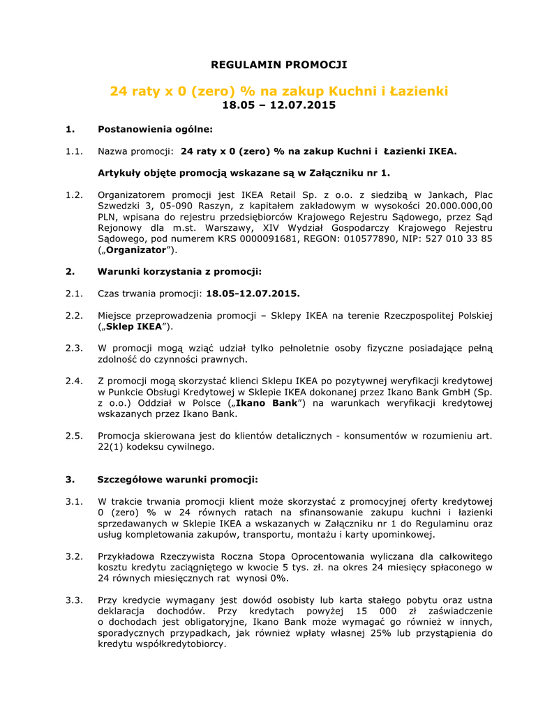 REGULAMIN PROMOCJI 24 raty x 0 (zero) % na zakup Kuchni i Łazienki 18.05 – 12.07.2015 1. Postanowienia ogólne: 1.1. Nazwa promocji: 24 raty x 0 (zero) % na zakup Kuchni i Łazienki IKEA. Artykuły objęte promocją wskazane są w Załączniku nr 1. 1.2. Organizatorem promocji jest IKEA Retail Sp. z o.o. z siedzibą w Jankach, Plac Szwedzki 3, 05-090 Raszyn, z kapitałem zakładowym w wysokości 20.000.000,00 PLN, wpisana do rejestru przedsiębiorców Krajowego Rejestru Sądowego, przez Sąd Rejonowy dla m.st. Warszawy, XIV Wydział Gospodarczy Krajowego Rejestru Sądowego, pod numerem KRS 0000091681, REGON: 010577890, NIP: 527 010 33 85 („Organizator”). 2. Warunki korzystania z promocji: 2.1. Czas trwania promocji: 18.05-12.07.2015. 2.2. Miejsce przeprowadzenia promocji – Sklepy IKEA na terenie Rzeczpospolitej Polskiej („Sklep IKEA”). 2.3. W promocji mogą wziąć udział tylko pełnoletnie osoby fizyczne posiadające pełną zdolność do czynności prawnych. 2.4. Z promocji mogą skorzystać klienci Sklepu IKEA po pozytywnej weryfikacji kredytowej w Punkcie Obsługi Kredytowej w Sklepie IKEA dokonanej przez Ikano Bank GmbH (Sp. z o.o.) Oddział w Polsce („Ikano Bank”) na warunkach weryfikacji kredytowej wskazanych przez Ikano Bank. 2.5. Promocja skierowana jest do klientów detalicznych - konsumentów w rozumieniu art. 22(1) kodeksu cywilnego. 3. Szczegółowe warunki promocji: 3.1. W trakcie trwania promocji klient może skorzystać z promocyjnej oferty kredytowej 0 (zero) % w 24 równych ratach na sfinansowanie zakupu kuchni i łazienki sprzedawanych w Sklepie IKEA a wskazanych w Załączniku nr 1 do Regulaminu oraz usług kompletowania zakupów, transportu, montażu i karty upominkowej. 3.2. Przykładowa Rzeczywista Roczna Stopa Oprocentowania wyliczana dla całkowitego kosztu kredytu zaciągniętego w kwocie 5 tys. zł. na okres 24 miesięcy spłaconego w 24 równych miesięcznych rat wynosi 0%. 3.3. Przy kredycie wymagany jest dowód osobisty lub karta stałego pobytu oraz ustna deklaracja dochodów. Przy kredytach powyżej 15 000 zł zaświadczenie o dochodach jest obligatoryjne, Ikano Bank może wymagać go również w innych, sporadycznych przypadkach, jak również wpłaty własnej 25% lub przystąpienia do kredytu współkredytobiorcy. 3.4. W przypadku rezygnacji z zakupów, reklamacji, zwrotu towaru, wymiany towaru na inny lub odstąpienia od umowy kredytowej będą miały zastosowanie uregulowania Ikano Bank stosowane przy zwykłym kredycie ratalnym. 4. Inne postanowienia: 4.1. Przystąpienie do promocji jest równoznaczne z potwierdzeniem zapoznania się przez klienta z treścią niniejszego Regulaminu i jego akceptacją. 4.2. Wszelkie reklamacje dotyczące promocji należy składać w Dziale Obsługi Klienta w Sklepie IKEA, w którym dokonano zakupu, w formie pisemnej w terminie do 14 dni od dnia zakończenia promocji albo przesłać na adres Sklepu IKEA, w którym dokonano zakupu. W przypadku przesłania reklamacji za pośrednictwem poczty, decyduje data nadania pisma w urzędzie pocztowym. Reklamacje będą rozpatrzone pisemnie w terminie 14 dni. Powyższe nie wyłącza, nie ogranicza, ani nie zawiesza uprawnień klienta związanych z nabytym towarem/wykonaną usługą (w tym składania reklamacji co do ich jakości) wynikających z obowiązujących przepisów prawa, w tym z przepisów Kodeksu cywilnego o rękojmi za wady rzeczy sprzedanej. 4.3. Pisemna reklamacja powinna zawierać: dane kontaktowe z Klientem tj. imię i nazwisko, adres, telefon oraz opis i powód reklamacji. 4.4. Regulamin promocji dostępny jest w Sklepie IKEA w Dziale Obsługi Klienta, w Sklepach IKEA w działach, których produktów dotyczy promocja (tj. Dział Kuchnie oraz Dział Łaznienki), w Punktach Obsługi Kredytowej Ikano Banku w Sklepie IKEA oraz na www.IKEA.pl/regulaminy. 4.5. W sprawach nieuregulowanych niniejszym odpowiednie przepisy Kodeksu Cywilnego. 4.6. Organizator może wprowadzić zmiany w niniejszym Regulaminie w trakcie trwania promocji. Zmienione warunki Regulaminu zostaną udostępnione na stronie internetowej IKEA.pl oraz w Sklepie IKEA. Wprowadzone zmiany obowiązują od daty ogłoszenia zmienionego Regulaminu, zgodnie ze zdaniem poprzednim. Data zmiany Regulaminu zostanie wskazana również w treści Regulaminu. Zmiany niniejszego Regulaminu nie mają zastosowania do osób, które przystąpiły do promocji przed datą wprowadzenia zmiany. 4.7. Wszelkie spory wynikłe z tytułu wykonania zobowiązań związanych z niniejszą promocją będą rozstrzygane przez właściwy sąd powszechny. Załącznik nr 1 – lista produktów objętych promocją Janki, 18.05.2015 regulaminem mają zastosowanie PA NY Nr artykułu Asortyment Kuchenny Nr artykułu Oświetlenie Kuchenne 0762 00011428 GRUNDTAL pół ścien 80 stal nierdz 60116899 ANSLUTA kabel łącz 0.7 m 0762 00011536 GRUNDTAL s-hacz 11 stal nierdz 5szt. 50116729 ANSLUTA kabel łącz 2.0 m 0741 00025717 PERSO róg drewno 50116593 ANSLUTA kabel zasil 3.5 m 0751 00031841 EDSVIK N bateria chrom 90300773 ANSLUTA N pilot zdalnego sterowania biały 0711 00054564 CAPITA N nog 16 stal nierdz 4szt. 80300764 ANSLUTA transf elek 30 W biały 0782 00058487 FLYTTA barek kuch 98x57 stal nierdz 30260384 FORMAT ośw reg LED niklowano 0741 00073874 PERSO blat 10-40x4.0 dąb 10260436 LINDSHULT ośw reg LED niklowano 0741 00084537 PERSO krawędź 3.8 drewno 30277129 MAGLEHULT ośw sza/obr LED srebrny 0752 00115727 BOHOLMEN zle 1k 48x50 stal nierdz 40245227 OMLOPP list ośw LED szuf 36 srebrny 0791 00116699 VINNA uchw 357 mm stal nierdz 2szt. 00245229 OMLOPP list ośw LED szuf 56 srebrny 0782 00116996 STENSTORP wys kuch 126x79 biały/dąb 80245230 OMLOPP list ośw LED szuf 76 srebrny 0741 00124717 NUMERÄR listwa śc 246 buk 30245218 OMLOPP ośw bla LED 40 biały 0741 00135674 PERSO BOH zlew1 susz 70x50 do kamienia 10245219 OMLOPP ośw bla LED 40 srebrny 0741 00135706 PERSO BOH zlew 1,5-k ociek 90x50 do drewna 30245223 OMLOPP ośw b