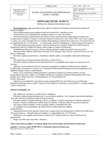 FORMULARZ Regionalne Centrum Krwiodawstwa i Krwiolecznictwa w Kielcach SOP – HLA – 20/F - 04 Numer dokumentu związanego: SOP – HLA 20 KARTA ZGŁOSZENIA HONOROWEGO DAWCY SZPIKU Data obowiązywania: 01.06.2013r Wersja 2 Strona 1 z 2 OŚWIADCZENIE DAWCY (Zaznaczyć akceptowane propozycje) Po raz pierwszy zgłaszam dobrowolny udział w Rejestrze Niespokrewnionych Potencjalnych Dawców Szpiku. Potwierdzam poprawność podanych danych osobowych i teleadresowych. Zobowiązuje się do uaktualnienia podanych danych w razie ich zmiany. Wyrażam zgodę na gromadzenie, przechowywanie i przetwarzanie moich danych osobowych i medycznych z godnie z Ustawą o Ochronie Danych Osobowych z dn. 29.08.1997r. Art.23 ust.1 punkt 1 z późn. zm. przez Ośrodek Dawców Szpiku Regionalnego Centrum Krwiodawstwa i Krwiolecznictwa, ul. Jagiellońska 66, 25-734 Kielce – w ramach jego statuowej działalności i obowiązujących przepisów, Wyrażam zgodę na przekazywanie w formie anonimowej wyników badań HLA do Światowej Organizacji Dawców Szpiku Kostnego ( Bone Marrow Donors Worldwide ). Zostałe(a)ł poinformowany(a) o istocie zabiegu pobrania szpiku (komórek macierzystych). Wyrażam chęć oddania szpiku dla ratowania życia chorego, który nie jest moim krewnym i nie ma dawcy rodzinnego. Wyrażam zgodę na anonimowe i bezpłatne oddanie szpiku w przypadku znalezienia dobranego biorcy. Nie zgłaszam zastrzeżeń odnośnie kryteriów wyboru biorcy. Wyrażam zgodę na pobranie ode mnie płytek krwi w przypadku gdy mogą one uratować życie chorego. Zgadzam się na pobranie krwi na oznaczenie antygenów zgodności tkankowej oraz badania wykluczające nosicielstwo wirusów, we wskazanych laboratoriach diagnostycznych znajdujących się najbliżej mojego miejsca zamieszkania. Wiem, że po wykonaniu badań antygenów zgodności tkankowej zostanę wpisany na listę potencjalnych dawców szpiku w Centralnym Rejestrze Niespokrewnionych Potencjalnych Dawców Szpiku i Krwi Pępowinowej w Poltransplancie, Al. Jerozolimskie 87, 02-001 Warszawa Zgadzam się na pobranie i przechowywanie mojej próbki krwi do badań przy poszukiwaniu niespokrewnionego dawcy szpiku i innych, które mogą być wykonane w przyszłości w wyniku postępu wiedzy medycznej. Jestem świadomy, że: Dar szpiku jest anonimowy, dobrowolny i bezpłatny. Pobranie szpiku przeprowadzane jest w znieczuleniu ogólnym. Nie wymaga znieczulenia pobranie krwi obwodowej na izolację komórek macierzystych. Pobranie szpiku wymaga krótkiego pobytu w szpitalu, za który otrzymam zwolnienie lekarskie. Koszty związane z pobraniem szpiku pokrywa szpital, w którym odbywa się przeszczepienie. Nie mogę szukać kontaktu z biorcą mojego szpiku w jakimkolwiek celu. W wyjątkowych przypadkach, dla dobra biorcy szpiku ponownie oddam szpik lub krew. Administratorem moich danych osobowych i medycznych jest Regionalne Centrum Krwiodawstwa i Krwiolecznictwa – Ośrodek Dawców Szpiku, ul. Jagiellońska 66, 25-734 Kielce. Mam prawo do wglądu moich danych osobowych i medycznych oraz mam możliwość ich poprawiania. Mogę wycofać moje nazwisko z Rejestru. Chcę zostać dawcą szpiku i wyrażam zgodę na przetwarzanie moich danych osobowych zgodnie z Ustawą z dnia 29.08.1997r. o Ochronie Danych Osobowych (Dziennik Ustaw nrv 133 poz. 883) Data i miejsce …...................................................... Podpis Dawcy Szpiku …...................................................
