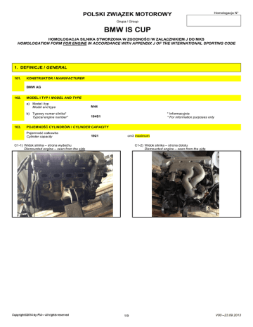 POLSKI ZWIĄZEK MOTOROWY Homologacja N° Grupa / Group BMW IS CUP HOMOLOGACJA SILNIKA STWORZONA W ZGODNOŚCI W ZAŁĄCZNIKIEM J DO MKS HOMOLOGATION FORM FOR ENGINE IN ACCORDANCE WITH APPENDIX J OF THE INTERNATIONAL SPORTING CODE 1. DEFINICJE / GENERAL 101. KONSTRUKTOR / MANUFACTURER BMW AG 102. 103. MODEL I TYP / MODEL AND TYPE a) Model i typ Model and type M44 b) Typowy numer silnika* Typical engine number* 194S1 * Informacyjnie * For information purposes only POJEMNOŚĆ CYLINDRÓW / CYLINDER CAPACITY Pojemność całkowita Cylinder capacity 1921 cm3 maximum C1-1) Widok silnika – strona wydechu Dismounted engine – seen from the side C1-2) Widok silnika – strona dolotu Dismounted engine – seen from the side 1/9 Marque Modèle BMW AG Make Model Homologacja N° M44 3. MOTEUR / ENGINE 303. CYKL / CYCLE 4 – suw (OTTO) 304. DOŁADOWANIE / SUPERCHARGING Tak / Yes 305. Nie / No Liczba i typ sprężarek Type and number of compressors LICZBA I UKŁAD CYLINDROW / NUMBER AND LAYOUT OF CYLINDERS 4, w rzędzie 306. TYP UKŁADU CHŁODZENIA / TYPE OF COOLING cieczą 307. POJEMNOŚĆ CYLINDROW / CYLINDER CAPACITY a) Pojemność jednostkowa Unitary b) 308. Pojemność całkowita Total cm3 maximum 1921 cm3 maximum MINIMALNA POJEMNOŚĆ KOMORY SPALANIA / TOTAL MINIMUM VOLUME OF A COMBUSTION CHAMBER 47,38 310. 480 cm3 STOPIEŃ SPRĘŻANIA / COMPRESSION RATIO (IN RELATION WITH THE UNIT) Maksimum 311. 10,5 :1 BLOK CYLINDROWY / CYLINDER BLOCK a) Materiał Material żeliwo C3-1) Blok cylindrowy – z góry Bare cylinder block seen from above C3-2) Blok cylindrowy – z dołu Bare cylinder block seen from underneath 2/9 Marque Modèle BMW AG Make C3-3) Blok cylindrowy – z prawej Bare cylinder block seen from right hand side 312. Homologacja N° M44 Model C3-4) Blok cylindrowy – z lewej Bare cylinder block seen from left hand side MINIMALNA WYSOKOŚĆ BLOKU CYLINDRÓW / MIN. HEIGHT OF THE CYLINDER BLOCK a) Wymiar pomiędzy pow. miski olej. a powierzchnią uszczelki pod głowicą Between sump and head gasket planes 313. TULEJE CYLUNDROWE / SLEEVES a) Tuleje w bloku Sleeved cylinder block Tak / Yes Nie / No Mokre Wet Suche Dry b) Typ Type c) Materiał Material 314. +0 - 0.1 mm MAKSYMALNA ŚREDNICA CYLINDRA / MAXIMUM BORE ALLOWED 85,5 316. mm SKOK / STROKE +0 - 0.1 mm 83,5 317. żeliwo ŚREDNICA CYLINDRA / BORE 85 315. 272 TŁOK / PISTON a) Materiał Material b) Ilość pierścieni Number of rings c) Minimalna waga Minimum weight Aluminium 3 456 Z pierścieniami i sworzniem With pin, clips and rings g d) Odległość od osi sworznia tłokowego do wierzchołka tłoku Distance from gudgeon pin center line to top of piston crown 31,65 + 0.1 mm f) Objętość wgłębienia tłoka Piston groove volume (top) 8,98 + 0.5 cm3 g) System chłodzenia tłoka Piston colling system Tak / Yes 3/9 Nie / No mm E Marque 318. Modèle BMW AG Make Model Homologacja N° M44 KORBOWODY / CONNECTING ROD a) Materiał Material b) Żeliwo c) Diamètre intérieur de la tête de bielle (sans coussinets) Interior diameter of the big end (without shell bearings) d) Odległość między osiami Length between axes 140 + 0.1 mm e) Minimalna waga Minimum weight 620 g Typ stopy korbowodu Big end type dzielona +0.1 - 0 mm 48 Wraz z pokrywą, śrubami, łożyskami With cap, bolts and shell bearings C5-1) Bielle de ¾ côté tête Connecting rod from ¾ on big end side 319. WAŁ KORBOWY / CRANKSHAFT a) Typ konstrukcji Type of manufacture jednoczęściowy c) Proces produkcji Manufacturing process Odlew Cast d) Liczba łożysk Number of bearings 5 Średnica łożysk Diameter of bearings 60 Materiał pokryw łożysk Bearing caps material stal f) g) b) Materiał Material stal Odkówka Forged e) Typ łożysk Type of bearings Łożyska ślizgowe +0 - 0.1 mm h) C6-1) Widok wału korbowego Crankshaft from ¾ front 4/9 Minimalna waga wału korbowego Min. weight of bare crankshaft 13520 g Marque Make 320. BMW AG Modèle Model Homologacja N° M44 KOŁO ZAMACHOWE / FLYWHEEL Skrzynia manualna Manual Gearbox Skrzynia automatyczna Automatic Gearbox stal - a) Materiał Material b) Waga minimalna wraz z pierścieniem zębatym Minimum weight with starter ring 9040 g - g Avec fixations et couronne de démarreur With fixings and starter ring C7-1) Koło zamachowe dwumasowe Flywheel from ¾ front 321. C7-2) Koło zamachowe Flywheel from ¾ rear GLOWICA CYLINDROW / CYLINDERHEAD Ilość Number 1 Materiał Material Aluminium Minimalna wysokość Minimum height 139,5 0,05 d) Gdzie mierzona Where measured Między powierzchnią uszczelki głowicy a powierzchnią między wałkami rozrządu g) Minimalna objętość komory spalania Minimum volume of a combustion chamber 47,38 25 a) b) c) C8-1) Głowica cylindrowa – widok z góry (strona wałków r.) Bare cylinderhead seen from top (camshaft side) mm cm3 and exhaust valv C8-2) Głowica cylindrowa – widok z dołu (strona komory spalania) Bare cylinderhead seen from underneath (chamber side) 5/9 Marque Make 322. Modèle BMW AG Model USZCZELKA GŁOWICY CYLINDRÓW / CYLINDERHEAD GASKET a) Grubość dokręconej uszczelki pod głowicą Thickness of tightened cylinderhead gasket 324. Homologacja N° M44 1,65 + 0.2 mm SYSTEM KONTROLI SILNIKA / ENGINE CONTROL SYSTEM a) Marka i typ Make and type Bosch b) Model Model DME, Digital Motor Electronic Mechaniczny / Mechanical Wtrysk - Bezpośredni Wtrysk - Pośredni Electroniczny / Electronic Hydrauliczny / Hydraulic W kolektorze / Manifold W głowicy / Cylinder head c) Pomiar ilości paliwa Fuel measurement e) Ilość wtryskiwaczy paliwa Number of effective fuel outlets f) Wtryskiwacz Injectors 325. 4 f1) Pozycja Position WALEK ROZRZADU / CAMSHAFT a) Ilość Number 2 b) Umiejscowienie Location W głowicy c) Napęd Drive system łańcuchem d) Liczba łożysk Number of bearings per shaft 5 e) Średnica łożysk Diameter of bearings 30 + 0.1 mm (zmierzona na wałku / measured on shaft) f) Sposób przekazania napędu Type of valve operation system popychacze g) Wymiary krzywki Cam dimens