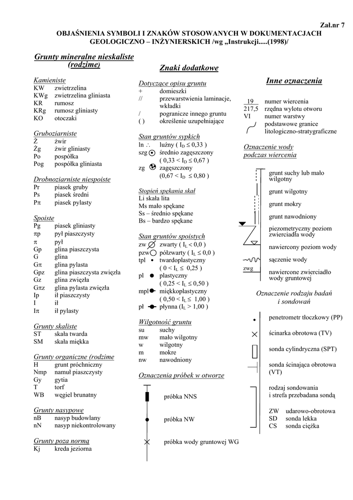 Zał.nr 7 OBJAŚNIENIA SYMBOLI I ZNAKÓW STOSOWANYCH W DOKUMENTACJACH GEOLOGICZNO – INŻYNIERSKICH /wg „Instrukcji.....(1998)/ Grunty mineralne nieskaliste (rodzime) Kamieniste KW KWg KR KRg KO zwietrzelina zwietrzelina gliniasta rumosz rumosz gliniasty otoczaki Gruboziarniste Ż Żg Po Pog żwir żwir gliniasty pospółka pospółka gliniasta Znaki dodatkowe + // / () piasek gruby piasek średni piasek pylasty Spoiste Pg πp π Gp G Gπ Gpz Gz Gπz Ip I Iπ piasek gliniasty pył piaszczysty pył glina piaszczysta glina glina pylasta glina piaszczysta zwięzła glina zwięzła glina pylasta zwięzła ił piaszczysty ił ił pylasty Grunty skaliste ST SM skała twarda skała miękka Grunty organiczne (rodzime H Nmp Gy T WB grunt próchniczny namuł piaszczysty gytia torf węgiel brunatny domieszki przewarstwienia laminacje, wkładki pogranicze innego gruntu określenie uzupełniające Stan gruntów sypkich ln ∴ szg zg Drobnoziarniste niespoiste Pr Ps Pπ luźny ( ID ≤ 0,33 ) średnio zagęszczony ( 0,33 < ID ≤ 0,67 ) zagęszczony (0,67 < ID ≤ 0,80 ) nasyp budowlany nasyp niekontrolowany Grunty poza normą Kj kreda jeziorna numer wiercenia 19 217,5 rzędna wylotu otworu VI numer warstwy podstawowe granice litologiczno-stratygraficzne Oznaczenie wody podczas wiercenia grunt suchy lub mało wilgotny Stopień spękania skał Li skała lita Ms mało spękane Ss – średnio spękane Bs – bardzo spękane grunt wilgotny grunt mokry grunt nawodniony piezometryczny poziom zwierciadła wody Stan gruntów spoistych zw pzw tpl pl mpl pł zwarty ( IL < 0,0 ) półzwarty ( IL ≤ 0,0 ) twardoplastyczny ( 0 < IL ≤ 0,25 ) plastyczny ( 0,25 < IL ≤ 0,50 ) miękkoplastyczny ( 0,50 < IL ≤ 1,00 ) płynna (IL > 1,00 ) Wilgotność gruntu su mw w m nw suchy mało wilgotny wilgotny mokre nawodniony Oznaczenia próbek w otworze próbka NNS Grunty nasypowe nB nN Inne oznaczenia Dotyczące opisu gruntu próbka NW próbka wody gruntowej WG nawiercony poziom wody sączenie wody zwg nawiercone zwierciadło wody gruntowej Oznaczenie rodzaju badań i sondowań penetrometr tłoczkowy (PP) ścinarka obrotowa (TV) sonda cylindryczna (SPT) sonda ścinająca obrotowa (VT) rodzaj sondowania i strefa przebadana sondą ZW SD CS udarowo-obrotowa sonda lekka sonda ciężka