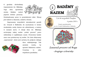 6 grudnia obchodzimy wspomnienie św. Mikołaja. Tego dnia swoim 2 sprawiamy bliskim RAZEM radość poprzez drobne prezenty. Doświadczamy przez to prawdziwości słów: Więcej jest radości w dawaniu, aniŜeli w braniu. Zapraszamy wszystkich mieszkańców parafii św. Urszuli w Malborku do zauwaŜenia w swoim środowisku osoby dawno nie odwiedzanej, a waŜnej w naszym zechciejmy Ŝyciu. takiej Z okazji osobie BADŹMY dnia „zrobić św. List do wszystkich Parafian 6 grudnia 2010 r. Parafia rzymskokatolicka p.w. św. Urszuli Ledóchowskiej w Malborku Mikołaja prezent” przez odwiedziny w najbliŜszym czasie. Prezentem będzie nasz czas poświęcony tej osobie. Do Listu dołączamy „zaproszenie”, które jest zachętą do podjęcia takiego daru mikołajowego. Tak niewiele trzeba, by sprawić bliźniemu radość. Uczyńmy to wspólnota parafialna. jako Z auw aŜ a Ŝ prezent od B oga - drugiego człow ieka Przyjaciele ADWENT (opowiadanie) Bardzo dawno temu w Chinach, żyło sobie dwóch przyjaciół. Jeden z nich potrafił pięknie grać na harfie. Drugi był niezwykle utalentowany w bardzo rzadkiej sztuce słuchania. Kiedy pierwszy z nich grał i śpiewał o górach, drugi mówił: - Widzę te góry, tak jakby stały przede mną. Kiedy pierwszy wyrażał swoją muzyką dźwięk strumienia, drugi słuchał go i potwierdzał: - Słyszę jak woda przemyka pośród kamieni. Ale pewnego dnia ten, który umiał słuchać zachorował i wkrótce zmarł. Jego przyjaciel przeciął struny harfy i nie grał już nigdy więcej. *** Istniejemy w pełni wtedy, kiedy ktoś nas słucha. Najpiękniejszy dar, jaki możemy ofiarować drugiemu człowiekowi to naprawdę wysłuchać go dając mu swój czas. Pewna bardzo wrażliwa dziewczyna rozmawiała z nauczycielem o nurtującym ją problemie. Nauczyciel skłaniał ją do porozmawiania na ten temat z rodzicami. Dziewczyna uczyniła tak, ale pomimo jej strachu i rozterki, rodzice zbagatelizowali i zlekceważyli problem, próbując zmienić temat; mówiąc, że dziewczyna przesadza; że wszystko się samo rozwiąże; że trzeba czasu itd. Nie chcieli kontynuować dyskusji, uważając, że jedynie lekceważąc sprawę można pomóc córce... Bruno Ferrero Adwent to czas radosnego oczekiwania na przyjście Pana Jezusa. Słowo adwent pochodzi z języka łacińskiego "adventus", które oznacza przyjście. Jest to wyjątkowy czas dla chrześcijan. Zaczyna się w niedzielę po uroczystości Chrystusa Króla. Trwa od 23 do 28 dni, z których cztery zawsze są niedzielami. Pierwsza niedziela Adwentu zawsze rozpoczyna nowy rok liturgiczny w Kościele. Ten czas kończy się wigilią BoŜego Narodzenia. RORATY Niepowtarzalny adwentowy klimat tworzą roraty, adwentowe msze odprawiane o wschodzie Słońca, podkreślają wyjątkowość tego okresu. Nazwa "roraty" pochodzi od zwyczajowej pieśni na wejście, rozpoczynającej się od słów "Rorate caeli desuper" - "Spuśćcie rosę niebiosa". Msza roratnia, czyli msza wotywna o Najświętszej Maryi Pannie w okresie Adwentu. Tak wyjątkowa obecność Matki Bożej w Adwencie ma głęboki sens. Warto na nie się wybrać, nawet jeśli są odprawiane bardzo wczesnym rankiem. W naszej parafii we wszystkie zwykłe dni tygodnia o godzinie 6.00. KONKURS ADWENTOWY Zapraszamy wszystkie dzieci do konkursu na najpiękniejszy samodzielnie wykonany lampion. Dla zwycięzców są przewidziane nagrody. To właśnie dzieci z zapalonymi światełkami w lampionach torują drogę kapłanowi do ołtarza . Liturgia bowiem rozpoczyna się w ciemności. Dopiero na hymn Chwała na wysokości Bogu... zapala się światła w kościele. Wszystkie dzieci uczęszczające na roraty będą mogły same stworzyć obrazek, który składa się jak puzzle z wielu części. Po każdej Mszy św. roratniej otrzymają jedną jego część. REKOLEKCJE ADWENTOWE 19-21 grudnia NIEDZIELA – PONIEDZIAŁEK – WTOREK W niedzielę Msze św.: 7.00; 8.30; 10.00; 11.30; 13.00; 18.00 W poniedziałek i wtorek: Msze św. dla dorosłych o godz. 10.00 i 19.00 Dla dzieci szkół podstawowych godz. 16.30 Dla młodzieŜy gimnazjum i szkół średnich o 17.30