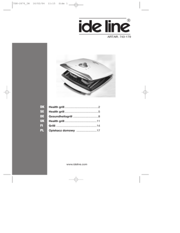 TSK-2676_IM 16/02/04 11:15 Side 1 ® ART.NR. 743-179 DK SE DE UK FI PL Health grill ........................................2 Health grill ........................................5 Gesundheitsgrill ..............................8 Health grill ......................................11 Grilli ................................................14 Opiekacz domowy ........................17 www.ideline.com TSK-2676_IM 16/02/04 11:15 Side 2 DK INTRODUKTION Før De tager Deres nye Health Grill i brug beder vi Dem venligst gennemlæse denne brugsanvisning. Vi anbefaler Dem yderligere at gemme brugsanvisningen, hvis De på et senere tidspunkt skulle få brug for at få genopfrisket grillens funktioner. (Netspænding: 230V ~ 50Hz) FØR FØRSTE ANVENDELSE Før De begynder at grille første gang, bør varmepladerne aftørres med en let fugtig klud. Smør derefter varmepladerne med en lille smule smør, margarine eller madolie. VIGTIGE SIKKERHEDSFORANSTALTNINGER: - Anvend kun grillen til det, den er beregnet til. Grillen må kun tilsluttes 230V. Berør aldrig metaldelene på grillen, mens den er i brug, da de bliver meget varme. Selve grillen eller ledningen må ikke nedsænkes i nogen form for væske. Efter endt brug skal stikket tages ud af stikkontakten. Undlad at trække i ledningen når De tager stikket ud af stikkontakten. Lad ikke ledningen hænge ud over bordkanten, og sørg for at ledningen ikke kommer i klemme i skuffer eller lign. Før rengøring skal stikket tages ud af stikkontakten, og grillen skal være fuldstændig afkølet. Anvend IKKE metalredskaber på de non-stick behandlede varmeplader. Når grillen er i brug, bør den holdes under konstant opsyn. Grillen bør opbevares utilgængeligt for børn. Såfremt apparatet eller ledningen skulle blive beskadiget, undlad da at benytte apparatet. Indlevér det til fagmand for reparation. OBS! Placer grillen på en varme resistent overflade eller måtte. Grillen må ikke placeres under et skab under eller tæt på gardiner eller andre brændbare materialer. Vær opmærksom på den varme damp, der kommer ud, når grillen åbnes. 2 TSK-2676_IM 16/02/04 11:15 Side 3 ALMINDELIG BRUG: - - - Placer bakken til fedtopsamling i frontåbningen Tilslut grillen til 230V og tænd for stikkontakten. Den røde og grønne kontrollampe begynder nu at lyse. Vælg den ønskede temperatur på termostatknappen L = Lav Lav temperatur M = Medium Medium temperatur H = Høj Høj temperatur Luk låget på grillen mens den varmer op. Når den grønne lampe slukker, er den ønskede grill temperatur opnået. Åbn grillen og placer de madvarer i den, De ønsker at grille. Luk forsigtigt låget igen. Grilningen er færdig efter 8-10 minutter afhængig af tykkelsen af de fødevarer, der skal grilles. Luk overdelen op og fjern de tilberedte fødevarer med en træspartel eller lignende. Brug ikke metalredskaber da De ellers risikerer at beskadige overfladen på grillpladerne. Når grillen ikke anvendes, bør den være lukket. Hvis De ønsker at stoppe tilberedningen drejes termostaten til OFF og stikket tages ud af stikkontakten. RENGØRING: - - Tag stikket ud af stikkontakten og lad grillen køle af. Brug et stykke køkkenrulle eller en let fugtig klud til at aftørre varmepladerne med. Brug evt. en let fugtig blød svamp til rengøring. Hvis der skulle sidde en smule madrester tilbage på varmepladerne, kan dette løsnes ved at komme en lille smule madolie på. Lad olien sidde i 5 min., og aftør varmepladerne med et stykke køkkenrulle. Grillen skal være fuldstændig afkølet, før denne procedure foretages. Brug INGEN former for stærke, opløsende eller slibende rengøringsmidler. Brug IKKE metalredskaber eller stålbørster ved rengøring. MILJØTIPS Et el/elektronik produkt bør, når det ikke længere er funktionsdygtigt, bortskaffes med mindst mulig miljøbelastning. Apparatet skal bortskaffes efter de gældende regler i Deres kommune. i de fleste tilfælde kan De komme af med produktet på Deres lokale genbrugsstation. 3 TSK-2676_IM 16/02/04 11:15 Side 4 GARANTIEN GÆLDER IKKE - hvis ovennævnte ikke iagttages. hvis der har været foretaget uautoriseret indgreb i apparatet. hvis apparatet har været misligholdt, været udsat for vold eller lidt anden form for overlast. for fejl som måtte opstå grundet fejl på ledningsnettet. Grundet konstant udvikling af vore produkter på funktions- og designsiden forbeholder vi os ret til ændringer af produktet uden forudgående varsel. IMPORTØR Adexi group Vi tager forbehold for trykfejl. 4 TSK-2676_IM 16/02/04 11:15 Side 5 SE INTRODUKTION Innan du börjar använda din nya Health Grill bör du läsa igenom denna bruksanvisning. Vi rekommenderar även att du sparar bruksanvisningen om du behöver friska upp minnet om grillens funktioner längre fram. (Nätspänning: 230 V ~ 50 Hz) FÖRE FÖRSTA ANVÄNDNINGSTILLFÄLLET Innan du använder grillen för första gången ska du torka av värmeplattorna med en fuktig trasa. Olja därefter in värmeplattorna med en liten mängd smör, margarin eller matolja. VIKTIGA SÄKERHETSÅTGÄRDER: Använd endast grillen för dess avsedda ändamål. Grillen får endast anslutas till 230 V strömkälla. Vidrör aldrig grillens metalldelar medan den används. Metalldelarna blir mycket heta under användning. Sänk inte ner grill, sladd eller kontakt i någon form av vätska. När du är klar med användningen av grillen ska du dra ut kontakten ur eluttaget. Dra inte i sladden, eftersom det kan få kontakten att lossna. Låt inte sladden hänga över kanten på ett bord, och se till att sladden inte kläms i en kökslåda eller liknande. Före rengöring, ta ut kontakten ur vägguttaget och se till att grillen har svalnat helt. Använd INTE köksredskap av metall på de non-stick behandlade värmeplattorna. Lämna inte grillen utan tillsyn medan den är igång. Grillen ska alltid placeras utom räckhåll för barn. Använd inte grillen om grillen eller sladden har skadats. Lämna in grillen till en 