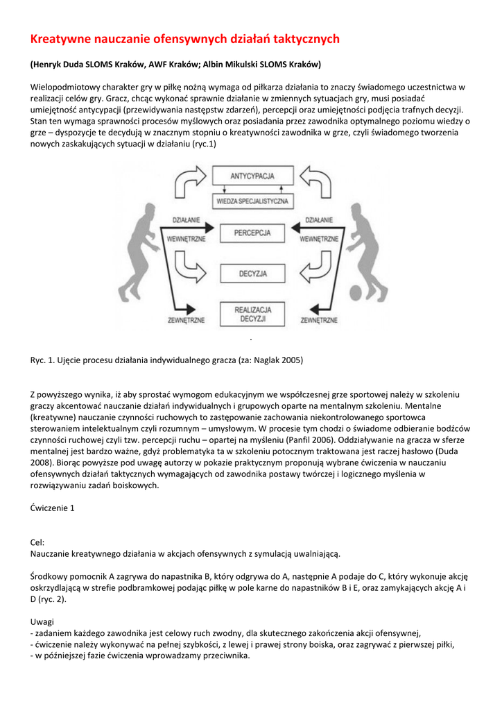 Kreatywne nauczanie ofensywnych działań taktycznych (Henryk Duda SLOMS Kraków, AWF Kraków; Albin Mikulski SLOMS Kraków) Wielopodmiotowy charakter gry w piłkę nożną wymaga od piłkarza działania to znaczy świadomego uczestnictwa w realizacji celów gry. Gracz, chcąc wykonać sprawnie działanie w zmiennych sytuacjach gry, musi posiadać umiejętność antycypacji (przewidywania następstw zdarzeń), percepcji oraz umiejętności podjęcia trafnych decyzji. Stan ten wymaga sprawności procesów myślowych oraz posiadania przez zawodnika optymalnego poziomu wiedzy o grze – dyspozycje te decydują w znacznym stopniu o kreatywności zawodnika w grze, czyli świadomego tworzenia nowych zaskakujących sytuacji w działaniu (ryc.1) . Ryc. 1. Ujęcie procesu działania indywidualnego gracza (za: Naglak 2005) Z powyższego wynika, iż aby sprostać wymogom edukacyjnym we współczesnej grze sportowej należy w szkoleniu graczy akcentować nauczanie działań indywidualnych i grupowych oparte na mentalnym szkoleniu. Mentalne (kreatywne) nauczanie czynności ruchowych to zastępowanie zachowania niekontrolowanego sportowca sterowaniem intelektualnym czyli rozumnym – umysłowym. W procesie tym chodzi o świadome odbieranie bodźców czynności ruchowej czyli tzw. percepcji ruchu – opartej na myśleniu (Panfil 2006). Oddziaływanie na gracza w sferze mentalnej jest bardzo ważne, gdyż problematyka ta w szkoleniu potocznym traktowana jest raczej hasłowo (Duda 2008). Biorąc powyższe pod uwagę autorzy w pokazie praktycznym proponują wybrane ćwiczenia w nauczaniu ofensywnych działań taktycznych wymagających od zawodnika postawy twórczej i logicznego myślenia w rozwiązywaniu zadań boiskowych. Ćwiczenie 1 Cel: Nauczanie kreatywnego działania w akcjach ofensywnych z symulacją uwalniającą. Środkowy pomocnik A zagrywa do napastnika B, który odgrywa do A, następnie A podaje do C, który wykonuje akcję oskrzydlającą w strefie podbramkowej podając piłkę w pole karne do napastników B i E, oraz zamykających akcję A i D (ryc. 2). Uwagi - zadaniem każdego zawodnika jest celowy ruch zwodny, dla skutecznego zakończenia akcji ofensywnej, - ćwiczenie należy wykonywać na pełnej szybkości, z lewej i prawej strony boiska, oraz zagrywać z pierwszej piłki, - w późniejszej fazie ćwiczenia wprowadzamy przeciwnika. . Ryc. 2. Nauczanie kreatywnego działania w akcjach ofensywnych z symulacją uwalniającą. Ćwiczenie 2 Cel: Nauczanie kreatywnego działania w akcji ofensywnej z symulacją uwalniającą - z akcentem szybkiego rozegrania piłki. Opis ćwiczenia Środkowy pomocnik A podaje piłkę do lewego obrońcy D, ten zagrywa do C, który odgrywa bez przyjęcia do D, który dośrodkowuje przed pole karne, na wchodzącego pomocnika A, lub do B, E, C kończącego akcję strzałem (ryc.3). Uwagi - szybki akcent rozgrywania piłki (gra z „klepki”), - wykonywanie ruchów „zwodnych”, gra na pełnej szybkości, - zamykanie akcji przez zawodników w swoich strefach. . Ryc. 3. Nauczanie kreatywnego działania w akcji ofensywnej z symulacją uwalniającą - akcent szybkiego rozegrania piłki Ćwiczenie 3 Cel: Rozegranie piłki z zagraniem zwrotnym dla zawiązania akcji oskrzydlającej. Opis ćwiczenia Środkowy pomocnik A zagrywa piłkę do lewego obrońcy D, który podaje do napastnika B, odgrywającego z pierwszej piłki do lewego pomocnika C, ten wykonuje podanie prostopadłe do D, dośrodkowując w pole karne na celowo zajmujących pozycję, wchodzących zawodników A, B, E i C (ryc. 4). * zwracamy także uwagę na wszystkie szczegóły zawarte w ćwiczeniach 1 i 2. Uwagi Celowy i antycypacyjny charakter działania napastników w uderzeniach piłki na bramkę. . Ryc. 4. Rozegranie piłki z zagraniem zwrotnym dla zawiązania akcji oskrzydlającej. Ćwiczenie 4 Cel Współdziałanie w rozegraniu piłki z podaniami zwrotnymi dla wytworzenia akcji oskrzydlającej. Opis ćwiczenia Środkowy pomocnik A podaje piłkę do bocznego pomocnika C, który odgrywa do obrońcy D, następnie ten odgrywa piłkę do napastnika B, który dalej podaje ją do pomocnika A, a ten bez przyjęcia zagrywa do wchodzącego obrońcy D. Po tych działaniach następuje dośrodkowanie zakończone strzałem na bramkę, przez zawodników B, E, A i C (ryc. 5). Uwagi Doskonaląc działania w warunkach gry, wprowadzamy stopniowo przeciwnika do ćwiczeń. - antycypacyjne zwodne uwalnianie napastników dla skutecznego uderzenia piłki na bramkę. . Ryc. 5. Współdziałanie w rozegraniu piłki z podaniami zwrotnymi dla wytworzenia akcji oskrzydlającej. Dążąc w dalszej kolejności do pełnej wszechstronności, zaproponowano organizację ćwiczeń, które w swoim założeniu najwierniej odzwierciedlają naturalne środowisko walki sportowej (wymuszające kreatywną postawę w działaniu); będą to więc ćwiczenia w formie wiązanej. Ćwiczenia te zaprezentowano łącząc gry z ćwiczeniami usprawniającymi, gry z ćwiczeniami działań technicznych oraz gry z ćwiczeniami działań taktycznych . Utworzone w ten sposób grupy ćwiczeń tworzą bardziej kompleksowe i wszechstronne zadania, przyczyniając się do rozwijania kreatywnej postawy gracza (zmienność działań, koncentracja w sygnalizowanych działaniach) a także większej efektywności jednostki treningowej (Duda 1997). W proponowanych formach ćwiczeń oprócz wspomnianych akcentów szkoleniowych, zwrócono również uwagę na czynnik organizacyjny, gdzie przy ograniczonych możliwościach sprzętowych, które często występują w klubach (mała ilość piłek, przyrządów i przyborów), ograniczonych warunkach terenowych (np. zajęcia w hali sportowej), jest jednocześnie zaangażowana duża liczba zawodników (od 6 do 12 graczy), a ćwiczenia wykonywane są z dużą intensywnością i objętością. 2. Przykłady ćwiczeń w formie wiązanej 2.1. W grach i zabawach z ćwiczeniami usprawniającymi W wyznaczonym polu gry (ryc.6) MGT 3:3