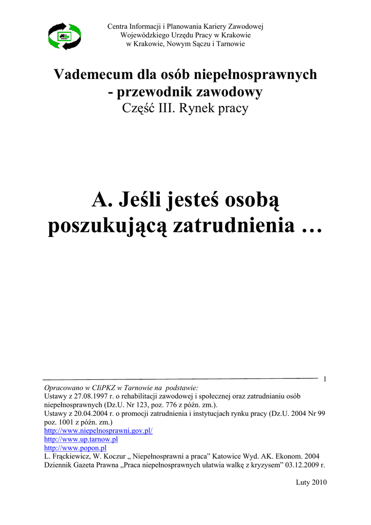 Centra Informacji i Planowania Kariery Zawodowej Wojewódzkiego Urzędu Pracy w Krakowie w Krakowie, Nowym Sączu i Tarnowie Vademecum dla osób niepełnosprawnych - przewodnik zawodowy Część III. Rynek pracy A. Jeśli jesteś osobą poszukującą zatrudnienia … 1 Opracowano w CIiPKZ w Tarnowie na podstawie: Ustawy z 27.08.1997 r. o rehabilitacji zawodowej i społecznej oraz zatrudnianiu osób niepełnosprawnych (Dz.U. Nr 123, poz. 776 z późn. zm.). Ustawy z 20.04.2004 r. o promocji zatrudnienia i instytucjach rynku pracy (Dz.U. 2004 Nr 99 poz. 1001 z późn. zm.) http://www.niepelnosprawni.gov.pl/ http://www.up.tarnow.pl http://www.popon.pl L. Frąckiewicz, W. Koczur „ Niepełnosprawni a praca” Katowice Wyd. AK. Ekonom. 2004 Dziennik Gazeta Prawna „Praca niepełnosprawnych ułatwia walkę z kryzysem” 03.12.2009 r. Luty 2010 Centra Informacji i Planowania Kariery Zawodowej Wojewódzkiego Urzędu Pracy w Krakowie w Krakowie, Nowym Sączu i Tarnowie SPIS TREŚCI:………………………………………………………2 A. Jeśli jesteś osobą poszukującą zatrudnienia Praca zwana „Poszukiwanie pracy”……………………………………………………..3 Osoby niepełnosprawne na rynku pracy…………………………………………......….5 Wojewódzkie Urzędy Pracy ………………………………..……………………………6 Powiatowe Urzędy Pracy…………………………………………………………….…...9 POPON…………………………………………………………………………………...14 2 Opracowano w CIiPKZ w Tarnowie na podstawie: Ustawy z 27.08.1997 r. o rehabilitacji zawodowej i społecznej oraz zatrudnianiu osób niepełnosprawnych (Dz.U. Nr 123, poz. 776 z późn. zm.). Ustawy z 20.04.2004 r. o promocji zatrudnienia i instytucjach rynku pracy (Dz.U. 2004 Nr 99 poz. 1001 z późn. zm.) http://www.niepelnosprawni.gov.pl/ http://www.up.tarnow.pl http://www.popon.pl L. Frąckiewicz, W. Koczur „ Niepełnosprawni a praca” Katowice Wyd. AK. Ekonom. 2004 Dziennik Gazeta Prawna „Praca niepełnosprawnych ułatwia walkę z kryzysem” 03.12.2009 r. Luty 2010 Centra Informacji i Planowania Kariery Zawodowej Wojewódzkiego Urzędu Pracy w Krakowie w Krakowie, Nowym Sączu i Tarnowie Praca zwana „Poszukiwaniem pracy” KaŜdy kto jest na etapie poszukiwania zatrudnienia (w ramach umowy o pracę, czy teŜ umowy cywilnoprawnej oraz w dowolnym wymiarze etatu) powinien się do tego odpowiednio przygotować, poniewaŜ samo poszukiwanie moŜe się okazać zajęciem na pełny etat. NaleŜy powiadomić wszystkich znajomych, Ŝe poszukuje się pracy, poprosić ich aby powiedzieli o tym równieŜ swoim znajomym, zapytali w firmach, w których pracują o wolne stanowiska. Kolejny krok to przygotowanie własnego CV. Przygotowane dokumenty aplikacyjne naleŜy złoŜyć w firmach i instytucjach, w których chcielibyśmy pracować, nawet jeśli obecnie firmy te nie prowadzą naboru pracowników. Dokumenty najlepiej składać osobiście. NaleŜy notować wszystkie kontakty z ewentualnymi pracodawcami, zapisywać gdzie i kiedy wysłano CV, kiedy i z kim przeprowadzono telefoniczną lub osobistą rozmowę oraz jak przebiegały rozmowy. Własna oferta Własna oferta to krótka informacja o kwalifikacjach poszukującego pracy, a w przypadku absolwentów szkół mówi o predyspozycjach i rodzaju poszukiwanej pracy. W ofercie własnej moŜna równieŜ podać cechy atrakcyjne dla pracodawców tj. wiek, dyspozycyjność, specjalne umiejętności: znajomość języka obcego, obsługi komputera. W zaleŜności od rodzaju pracy, naleŜy przygotować kilka ofert. Powinny one zawierać następujące informacje: kto poszukuje pracy, o jaki rodzaj pracy zabiega, dane kontaktowe osoby poszukującej zatrudnienia. Ofertę moŜna zamieścić: w prasie i innych mediach lokalnych, na tablicach ogłoszeń, w zakładach pracy, przekazać znajomym, których prosimy o pomoc w poszukiwaniu pracy. Osoba poszukująca pracy powinna sprawdzić, jakie gazety, stacje radiowe lub telewizyjne w jej regionie rozpowszechniają bezpłatnie oferty osób bezrobotnych. NaleŜy zachowaj sobie treść swojej oferty (ofert). MoŜe się przydać, jeśli otrzyma się zaproszenie na rozmowę kwalifikacyjną. Ogłoszenia internetowe Obecnie Internet to najbogatsze źródło ofert pracy. MoŜna tam szybko znaleźć oferty pracy odwiedzając specjalnie do tego stworzone serwisy. Szczególne znaczenie Internet moŜe mieć dla osób niepełnosprawnych, które za jego pośrednictwem mogą skorzystać z ofert pracy. 3 Opracowano w CIiPKZ w Tarnowie na podstawie: Ustawy z 27.08.1997 r. o rehabilitacji zawodowej i społecznej oraz zatrudnianiu osób niepełnosprawnych (Dz.U. Nr 123, poz. 776 z późn. zm.). Ustawy z 20.04.2004 r. o promocji zatrudnienia i instytucjach rynku pracy (Dz.U. 2004 Nr 99 poz. 1001 z późn. zm.) http://www.niepelnosprawni.gov.pl/ http://www.up.tarnow.pl http://www.popon.pl L. Frąckiewicz, W. Koczur „ Niepełnosprawni a praca” Katowice Wyd. AK. Ekonom. 2004 Dziennik Gazeta Prawna „Praca niepełnosprawnych ułatwia walkę z kryzysem” 03.12.2009 r. Luty 2010 Centra Informacji i Planowania Kariery Zawodowej Wojewódzkiego Urzędu Pracy w Krakowie w Krakowie, Nowym Sączu i Tarnowie W Internecie istnieją strony zawierające oferty pracy skierowane do tylko do osób niepełnosprawnych np.: www.bezbarier.pl www.popon.pl www.niepelnosprawni.pl www.actus.free.ngo.pl Inne przydatne adresy stron internetowych to: Portal publicznych słuŜb zatrudnienia: www.psz.praca.gov.pl Serwisy internetowe z ofertami pracy: www.praca.pl www.praca.gratka.pl www.wakaty.com.pl www.praca.org www.pracuj.pl www.hrk.pl www.praca.info.pl www.iobo.pl www.i-praca.pl www.tlenek.pl www.tylkopraca.com.pl www.kariera.pl www.gowork.pl www.praca.money.pl www.gazetapraca.pl www.praca.onet.pl www.epraca.com.pl www.praca.interia.pl www.people.com.pl 4 Opracowano w CIi