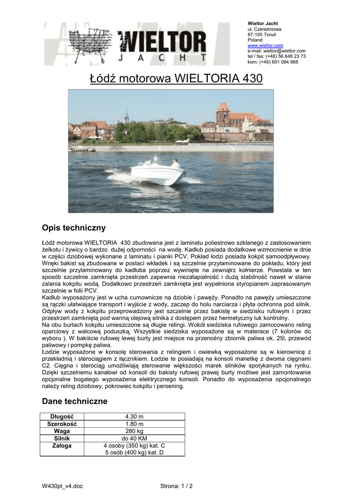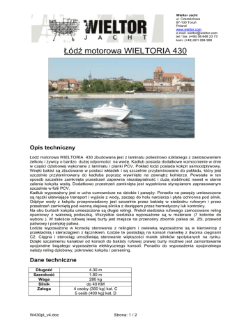 Wieltor Jacht ul. Czereśniowa 87-100 Toruń Poland www.wieltor.com e-mail: [email protected] tel / fax: (+48) 56 648 23 73 kom: (+48) 601 084 968 Łódź motorowa WIELTORIA 430 Opis techniczny Łódź motorowa WIELTORIA 430 zbudowana jest z laminatu poliestrowo szklanego z zastosowaniem Ŝelkotu i Ŝywicy o bardzo duŜej odporności na wodę. Kadłub posiada dodatkowe wzmocnienie w dnie w części dziobowej wykonane z laminatu i pianki PCV. Pokład łodzi posiada kokpit samoodpływowy. Wnęki bakist są zbudowane w postaci wkładek i są szczelnie przylaminowane do pokładu, który jest szczelnie przylaminowany do kadłuba poprzez wywinięte na zewnątrz kołnierze. Powstała w ten sposób szczelnie zamknięta przestrzeń zapewnia niezatapialność i duŜą stabilność nawet w stanie zalania kokpitu wodą. Dodatkowo przestrzeń zamknięta jest wypełniona styropianem zaprasowanym szczelnie w folii PCV. Kadłub wyposaŜony jest w ucha cumownicze na dziobie i pawęŜy. Ponadto na pawęŜy umieszczone są rączki ułatwiające transport i wyjście z wody, zaczep do holu narciarza i płyta ochronna pod silnik. Odpływ wody z kokpitu przeprowadzony jest szczelnie przez bakistę w siedzisku rufowym i przez przestrzeń zamkniętą pod wanną olejową silnika z dostępem przez hermetyczny luk kontrolny. Na obu burtach kokpitu umieszczone są długie relingi. Wokół siedziska rufowego zamocowano reling oparciowy z walcową poduszką. Wszystkie siedziska wyposaŜone są w materace (7 kolorów do wyboru ). W bakiście rufowej lewej burty jest miejsce na przenośny zbiornik paliwa ok. 25l, przewód paliwowy i pompkę paliwa. Łodzie wyposaŜone w konsolę sterowania z relingiem i owiewką wyposaŜone są w kierownicę z przekładnią i sterociągiem z łącznikiem. Łodzie te posiadają na konsoli manetkę z dwoma cięgnami C2. Cięgna i sterociąg umoŜliwiają sterowanie większości marek silników spotykanych na rynku. Dzięki szczelnemu kanałowi od konsoli do bakisty rufowej prawej burty moŜliwe jest zamontowanie opcjonalne bogatego wyposaŜenia elektrycznego konsoli. Ponadto do wyposaŜenia opcjonalnego naleŜy reling dziobowy, pokrowiec kokpitu i persening. Dane techniczne Długość Szerokość Waga Silnik Załoga W430pl_v4.doc 4.30 m 1.80 m 280 kg do 40 KM 4 osoby (350 kg) kat. C 5 osób (400 kg) kat. D Strona: 1 / 2 Wieltor Jacht ul. Czereśniowa 87-100 Toruń Poland www.wieltor.com e-mail: [email protected] tel / fax: (+48) 56 648 23 73 kom: (+48) 601 084 968 Łódź motorowa WIELTORIA 430 Wersje łodzi WIELTORIA 430 - wersja podstawowa WIELTORIA 430 FC - wersja wędkarska boczna sterówka WIELTORIA 430 F - wersja wędkarska WIELTORIA 430 CC - centralna sterówka WIELTORIA 430 SC - boczna sterówka WIELTORIA 430 CS - centralna sterówka pokład plaŜowy W430pl_v4.doc Strona: 2 / 2