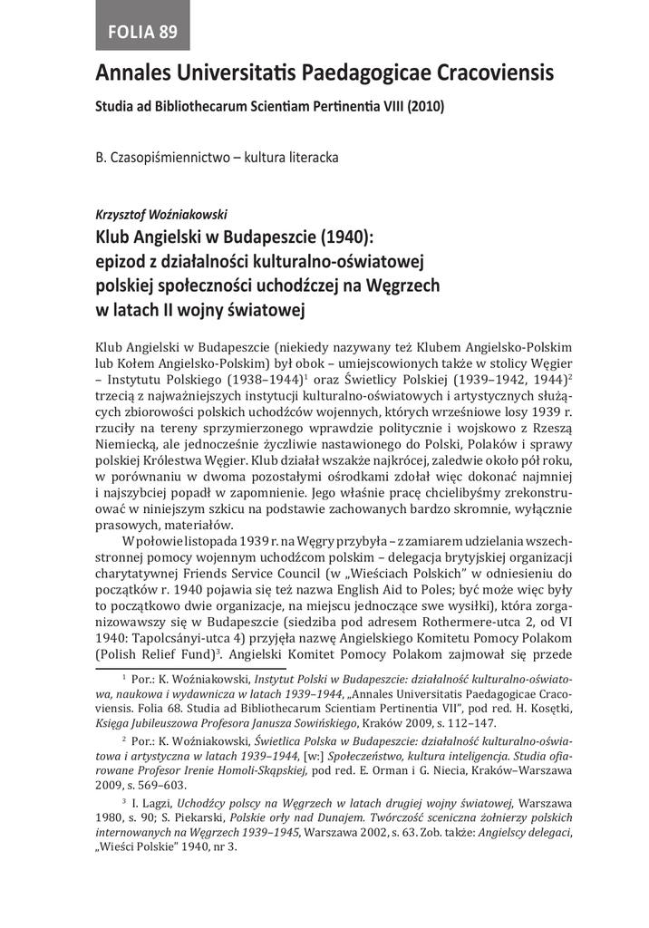 Folia 89 Annales Universitatis Paedagogicae Cracoviensis Studia ad Bibliothecarum Scientiam Pertinentia VIII (2010) B. Czasopiśmiennictwo – kultura literacka Krzysztof Woźniakowski Klub Angielski w Budapeszcie (1940): epizod z działalności kulturalno-oświatowej polskiej społeczności uchodźczej na Węgrzech w latach II wojny światowej Klub Angielski w Budapeszcie (niekiedy nazywany też Klubem Angielsko-Polskim lub Kołem Angielsko-Polskim) był obok – umiejscowionych także w stolicy Węgier – Instytutu Polskiego (1938–1944)1 oraz Świetlicy Polskiej (1939–1942, 1944)2 trzecią z najważniejszych instytucji kulturalno-oświatowych i artystycznych służących zbiorowości polskich uchodźców wojennych, których wrześniowe losy 1939 r. rzuciły na tereny sprzymierzonego wprawdzie politycznie i wojskowo z Rzeszą Niemiecką, ale jednocześnie życzliwie nastawionego do Polski, Polaków i sprawy polskiej Królestwa Węgier. Klub działał wszakże najkrócej, zaledwie około pół roku, w porównaniu w dwoma pozostałymi ośrodkami zdołał więc dokonać najmniej i najszybciej popadł w zapomnienie. Jego właśnie pracę chcielibyśmy zrekonstruować w niniejszym szkicu na podstawie zachowanych bardzo skromnie, wyłącznie prasowych, materiałów. W połowie listopada 1939 r. na Węgry przybyła – z zamiarem udzielania wszechstronnej pomocy wojennym uchodźcom polskim – delegacja brytyjskiej organizacji charytatywnej Friends Service Council (w „Wieściach Polskich” w odniesieniu do początków r. 1940 pojawia się też nazwa English Aid to Poles; być może więc były to początkowo dwie organizacje, na miejscu jednoczące swe wysiłki), która zorganizowawszy się w Budapeszcie (siedziba pod adresem Rothermere-utca 2, od VI 1940: Tapolcsányi-utca 4) przyjęła nazwę Angielskiego Komitetu Pomocy Polakom (Polish Relief Fund)3. Angielski Komitet Pomocy Polakom zajmował się przede 1 Por.: K. Woźniakowski, Instytut Polski w Budapeszcie: działalność kulturalno-oświatowa, naukowa i wydawnicza w latach 1939–1944, „Annales Universitatis Paedagogicae Cracoviensis. Folia 68. Studia ad Bibliothecarum Scientiam Pertinentia VII”, pod red. H. Kosętki, Księga Jubileuszowa Profesora Janusza Sowińskiego, Kraków 2009, s. 112–147. Por.: K. Woźniakowski, Świetlica Polska w Budapeszcie: działalność kulturalno-oświatowa i artystyczna w latach 1939–1944, [w:] Społeczeństwo, kultura inteligencja. Studia ofiarowane Profesor Irenie Homoli-Skąpskiej, pod red. E. Orman i G. Niecia, Kraków–Warszawa 2009, s. 569–603. 2 3 I. Lagzi, Uchodźcy polscy na Węgrzech w latach drugiej wojny światowej, Warszawa 1980, s. 90; S. Piekarski, Polskie orły nad Dunajem. Twórczość sceniczna żołnierzy polskich internowanych na Węgrzech 1939–1945, Warszawa 2002, s. 63. Zob. także: Angielscy delegaci, „Wieści Polskie” 1940, nr 3. [100] Krzysztof Woźniakowski wszystkim działalnością socjalną (dożywianie, pomoc odzieżowa i finansowa, także częściowo opieka nad młodzieżą polską, zwłaszcza żeńską, podejmującą na uchodźstwie naukę i studia), przy czym, aby nie dublować działań istniejącego równolegle i zajmującego się w dużej mierze tym samym Amerykańskiego Komitetu Pomocy Polakom (YMCA) zawarto z nim w lutym 1940 r. porozumienie, na mocy którego Angielski Komitet wziął pod swoją pieczę polskie obozy uchodźcze w zachodnich Węgrzech, Amerykański Komitet zaś – w Węgrzech wschodnich4. Analogicznie jak Amerykański Komitet, Anglicy nie zapominali też o działalności kulturalno-oświatowej wśród Polaków, jakkolwiek w istniejących realiach nie była ona oczywiście dla tej charytatywnej organizacji priorytetowa. Wyrażała się przede wszystkim w „powielaczowej” akcji wydawniczej, przy czym – odmiennie niż powielaczowe edycje Amerykańskiego Komitetu – publikacje pod angielską firmą (niestety, także bardzo kiepskie technicznie i dziś niemal nie zachowane w oryginałach) miały przeważnie charakter reedycji wybranych dzieł polskiej klasyki literackiej bądź niektórych utworów pisarzy współczesnych5. Ponadto – jakby wzorując się na Amerykanach i utworzonej pod egidą Amerykańskiego Komitetu jeszcze w grudniu 1939 r. Świetlicy Polskiej – Angielski Komitet Pomocy Polakom także postanowił stworzyć w węgierskiej stolicy swoją własną agendę kulturalną. Był nią właśnie Klub Angielski. Od razu trzeba stwierdzić, iż między Amerykańskim Komitetem a Angielskim Komitetem (a w konsekwencji – między Świetlicą Polską a Klubem Angielskim) istniały bardzo poważne różnice w statusie. Pierwszy był „amerykański” niemalże jedynie z nazwy (i najwcześniejszych źródeł finansowania z przełomu r. 1939/40) oraz w sensie personalnym opanowany – praktycznie bez reszty – przez polskich działaczy uchodźczych. Drugi to rzeczywista instytucja angielska, zorganizowana i kierowana przez delegowanych ze Zjednoczonego Królestwa obywateli brytyjskich (pozostająca pod dyskretną opieką poselstwa brytyjskiego w Budapeszcie), z którą polscy uchodźcy aktywnie współpracowali, ale o której pracach i kierunkach działań nie mogli współdecydować. Z niejasnych powodów nowa placówka kulturalna rodziła się jakby dwukrotnie. Po raz pierwszy budapeszteńskie „Wieści Polskie” poinformowały, że 8 stycznia 1940 wspomniana organizacja angielska English Aid to Poles uruchomiła dla Polaków swoją świetlicę pod adresem Déak Ferenc-utca 2, z zamiarem organizowania tam wieczorów muzycznych, nauki języka angielskiego oraz kursów kroju i szycia dla młodzieży żeńskiej. Podkreślono przy tym tyleż stanowczo, co bez wszelkich konkretów, iż „Organizatorzy tej świetlicy wyraźnie zaznaczają, że nie ma ona być 4 Podział kompetencji terytorialnej, „Wieści Polskie” 1940, nr 21. H. Csorby i I. Michalik, Bibliografia poloniców węgierskich 1939–1945 („Biuletyn Inst