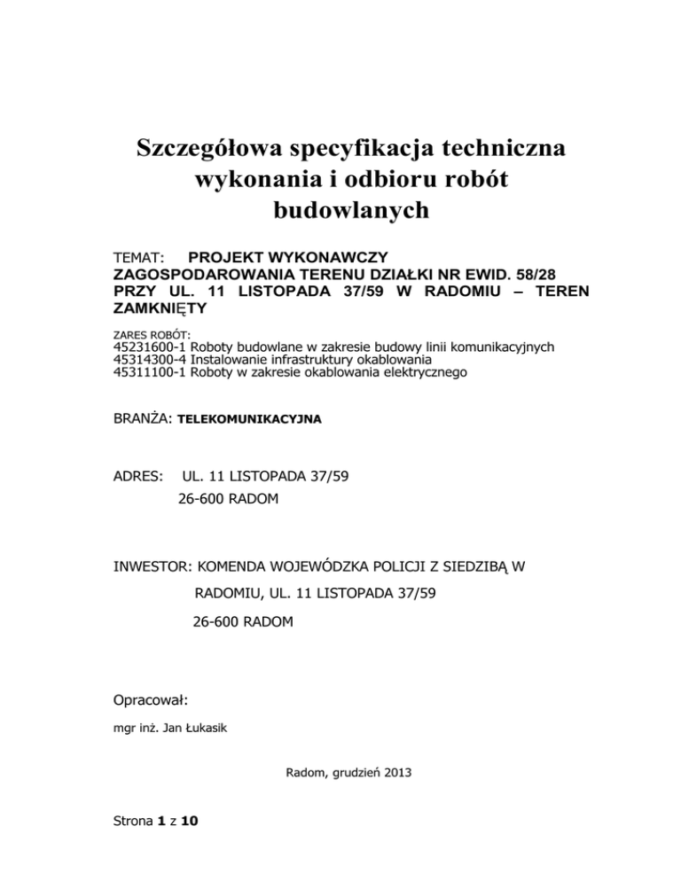 Szczegółowa specyfikacja techniczna wykonania i odbioru robót budowlanych TEMAT: PROJEKT WYKONAWCZY ZAGOSPODAROWANIA TERENU DZIAŁKI NR EWID. 58/28 PRZY UL. 11 LISTOPADA 37/59 W RADOMIU – TEREN ZAMKNIĘTY ZARES ROBÓT: 45231600-1 Roboty budowlane w zakresie budowy linii komunikacyjnych 45314300-4 Instalowanie infrastruktury okablowania 45311100-1 Roboty w zakresie okablowania elektrycznego BRANŻA: TELEKOMUNIKACYJNA ADRES: UL. 11 LISTOPADA 37/59 26-600 RADOM INWESTOR: KOMENDA WOJEWÓDZKA POLICJI Z SIEDZIBĄ W RADOMIU, UL. 11 LISTOPADA 37/59 26-600 RADOM Opracował: mgr inż. Jan Łukasik Radom, grudzień 2013 Strona 1 z 10 Szczegółowa specyfikacja techniczna Przebudowa i budowa urządzeń telekomunikacyjnych W S T Ę P 1.1 Przedmiot specyfikacji technicznej (ST) Przedmiotem niniejszej specyfikacji technicznej są wymagania dotyczące wykonania i odbioru przebudowy kanalizacji telekomunikacyjnej, linii kablowych światłowodowych i linii telekomunikacyjnych miejscowych kolidujących w związku z budową budynku strzelnicy Komendy Wojewódzkiej Policji z siedzibą w Radomiu oraz budową nowego przyłącza telekomunikacyjnego. 1.2 Zakres stosowania ST Specyfikacja techniczna jest stosowana jako dokument przetargowy i kontraktowy przy zlecaniu i realizacji robót wymienionych w pkt. 1.1. 1.3 Zakres robót objętych ST Ustalenia zawarte w niniejszej specyfikacji ST dotyczą prowadzenia robót przy przebudowie kanalizacji i kablowych linii wymienionych w pkt. 1.1 kolidujących z nowobudowanym budynkiem strzelnicy Komendy Wojewódzkiej Policji z siedzibą w Radomiu oraz budowy nowego przyłącza telekomunikacyjnego i obejmują: - przebudowę kabli światłowodowych ułożonych w kanalizacji wtórnej - budowę kanalizacji pierwotnej i wtórnej - wciąganie kabli do kanalizacji kablowej pierwotnej - wyciąganie kabli z kanalizacji kablowej pierwotnej - montaż kabli telekomunikacyjnych. 1.4 Określenia podstawowe 1.4.1 Kanalizacja kablowa pierwotna - zespół ciągów podziemnych z wbudowanymi studniami przeznaczony do prowadzenia kabli telekomunikacyjnych i rur kanalizacji wtórnej. 1.4.2. Ciąg kanalizacji - rury ułożone w wykopie jeden za drugim i połączone pojedynczo lub w zestawach pozwalających uzyskać potrzebną liczbę otworów w kanalizacji. 1.4.3 Studnia kablowa Strona 2 z 10 a) pomieszczenie podziemne wybudowane między ciągami kanalizacji kablowej w celu umożliwienia wciągania, montażu i konserwacji kabli. 1.4.4 Telekomunikacyjna linia kablowa światłowodowa - linia optotelekomunikacyjna wybudowana z kabli światłowodowych. 1.4.5 Telekomunikacyjna linia kablowa miejscowa - linia telekomunikacyjna wybudowana z kabli symetrycznych typu miejscowego. 1.4.6 Odcinek regeneratorowy -odcinek linii kablowej między dwoma sąsiednimi regeneratorami. 1.4.7 Długość trasowa linii kablowej - długość przebiegu trasy linii bez uwzględniania falowania i zapasów kabla. 1.4.8 Długość elektryczna - rzeczywista długość zmontowanego kabla miedzianego z uwzględnieniem falowania i zapasów kabla. 1.4.9 Długość optyczna - rzeczywista długość zmontowanego kabla światłowodowego z uwzględnieniem falowania i zapasów kabla. 1.4.10 Falowanie kabla - sposób układania kabla, przy którym długość kabla układanego jest większa od długości trasy, na której układa się kabel. 1.4.11 Złącze kablowe - element linii kablowej łączący dwa odcinki kabla. 1.4.12 Światłowód - element transmisyjny kabla optotelekomunikacyjnego w postaci włókna optycznego, złożonego z rdzenia i płaszcza wraz z pokryciem, pozwalający na transmisję fali świetlnej. 1.4.13 Przełącznica światłowodowa (skrzynka lub stojak) - urządzenie umożliwiające przełączanie światłowodów oraz dołączanie do nich kabli stacyjnych, montowane na każdym końcu linii optotelekomunikacyjnej. Strona 3 z 10 1.4.14 Pozostałe określenia są zgodne z obowiązującymi Polskimi Normami, Branżowymi Normami i Normami Zakładowymi ZN-96 TP S.A. 1.5 Ogólne wymagania dotyczące robót Wykonawca robót jest odpowiedzialny za jakość ich wykonania oraz za zgodność z Dokumentacją Projektowa, ST i poleceniami Inżyniera. 2. MATERIA Ł Y 2.1 Wymagania ogólne stosowania materiałów Materiały do budowy kablowych linii telekomunikacyjnych muszą posiadać atesty wytwórcy stwierdzający zgodność jego wykonania z odpowiednimi normami. 2.2. Materiały gotowe 2.2.1 Rury z polietylenu HDPE Stosowane do budowy kanalizacji wtórnej i rurociągów kablowych rury z polietylenu o dużej gęstości powinny odpowiadać normie ZN-96 TP S.A.-013 i ZN-96 TP S.A.-017. Rury należy przechowywać w miejscu zadaszonym, zabezpieczającym je przed bezpośrednim działaniem promieni słonecznych i opadów oraz działaniami sił mechanicznych. 2.2.2 Kable Typy kabli opto i telekomunikacyjnych, ich pojemności i średnice żył zgodnie z opracowaną Dokumentacją Projektową uzgodnioną miejscowymi operatorami telekomunikacyjnymi oraz Inwestorem (w przypadku wystąpienia potrzeby użycia nowych kabli). Zastosowane kable powinny odpowiadać wymogom odpowiednich norm wg wykazu w punkcie 10. Kable telekomunikacyjne dostarczane są na bębnach drewnianych, których wielkości określone w normie PN-76/D-79353 zależą od średnicy kabla i jego powłoki. Każdy bęben jest nacechowany numerem wielkości i numerem ewidencyjnym oraz następującymi znakami i napisami: - nazwą i znakiem fabrycznym producenta - strzałką wskazującą kierunek obrotów bębna przy toczeniu Do jednej z tarcz bębna przymocowana jest tabliczka , na której podany jest typ kabla, jego długość i ciężar oraz producent. Stosuje się następujące typy kabli 1) Kable miejscowe kanałowe wzdłużnie uszczelnione - do budowy telekomunikacyjnych linii kablowych miejscowych należy stosować następujące kable: 2) Kable światłowodowe - do budowy telekomunikacyjnych linii kablowych światłowodowych należy stosować następujące kable: Strona 4