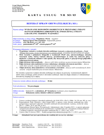 Urząd Miasta Milanówka ul. Kościuszki 45 05-822 Milanówek tel. (22) 758-30-61/62 fax.(22) 755-81-20 KARTA USŁUG N R SO / 03 REFERAT SPRAW OBYWATELSKICH ( SO ) Nazwa usługi: WYDAWANIE DOWODÓW OSOBISTYCH W PRZYPADKU ZMIANY DANYCH OSOBOWO-ADRESOWYCH, ZNISZCZENIA, UTRATY LUB UPŁYWU TERMINU WAŻNOŚCI Odpowiedzialny za daną usługę: Magdalena Piwek – inspektor Nr pokoju: Referat Spraw Obywatelskich - budynek B ( parter) Nr telefonu: (22) 758-30-61 wew. 167, 219 Godz. pracy: poniedziałek 800-1800 wtorek-piątek 800-1600 Wymagane dokumenty i wnioski: 1. Wypełniony wniosek o wydanie dowodu osobistego (wniosek w załączeniu do pobrania – Punkt Obsługi Interesanta, strona internetowa www.milanowek.pl). posiadany dowód osobisty do wglądu 2. Dwie wyraźne i jednakowe fotografie o wymiarach 35x45 mm, odzwierciedlające aktualny wizerunek osoby, której wniosek dotyczy, przedstawiające tę osobę bez nakrycia głowy i okularów z ciemnymi szkłami w taki sposób, aby ukazywały głowę w pozycji lewego półprofilu i widocznym lewym uchem 3. Odpis skrócony aktu urodzenia – dotyczy osób, które urodzone są poza terenem miasta Milanówka. 4. Odpis skrócony aktu małżeństwa wraz z adnotacją o aktualnie używanym nazwisku – dotyczy osób, które zawarły związek małżeński poza terenem miasta Milanówka. 5. Odpis skrócony aktu małżeństwa z orzeczeniem o rozwodzie - dotyczy osób rozwiedzionych ,które zawarły związek małżeński poza terenem miasta Milanówka. Do wniosku o ponowne wydanie dowodu osobistego nie załącza się powyżej wymienionych odpisów aktów stanu cywilnego, jeżeli zawarte w dowodzie osobistym dane nie uległy zmianie a w dokumentacji dowodowej znajdują się te odpisy. Ustawowy termin odbioru dowodu osobistego: 30 dni Tryb odwoławczy: Nie przysługuje Odbiór dowodu: budynek B - z odcinkiem „B” formularza (wydanym przez inspektora). Uwagi: Dokumenty należy składać i odbierać osobiście Podstawa prawna: 1. 2. 3. 4. Ustawa o ewidencji ludności i dowodach osobistych z dn.10.04.1974 r. (Dz.U.z 2006r. .Nr 139, poz. 993, ze. zm.). Rozporządzenie Rady Ministrów z dnia 6 lutego 2009 r. w sprawie wzoru dowodu osobistego oraz trybu postępowania w sprawach wydawania dowodów osobistych ich unieważnieniu wymiany, zwrotu lub utraty (Dz. U. z 2009 r. Nr 47, poz.384, ze zm.). Rozporządzenie Ministra Spraw Wewnętrznych i Administracji z dnia 19 grudnia 2012 r. w sprawie zgłaszania i przyjmowania danych niezbędnych do zameldowania i wymeldowania oraz prowadzenia ewidencji ludności i ewidencji wydanych i utraconych dowodów osobistych (Dz. U. z 2012 r. poz. 1475). Ustawa z dnia 14 czerwca 1960 r. – Kodeks postępowania administracyjnego (Dz. U. z 2013 r. poz. 267). Uwaga: Aktualność kart jest sprawdzana nie rzadziej niż raz na trzy miesiące Opracowała: Sprawdziła: Zatwierdził: Magdalena Piwek Danuta Markowska – inspektor w Ref. SO data 02.04.2013 r. – kierownik Referatu SO data 02.04.2013 r. Anna Zajączkowska – Sekretarz Miasta data 02.04.2013 r