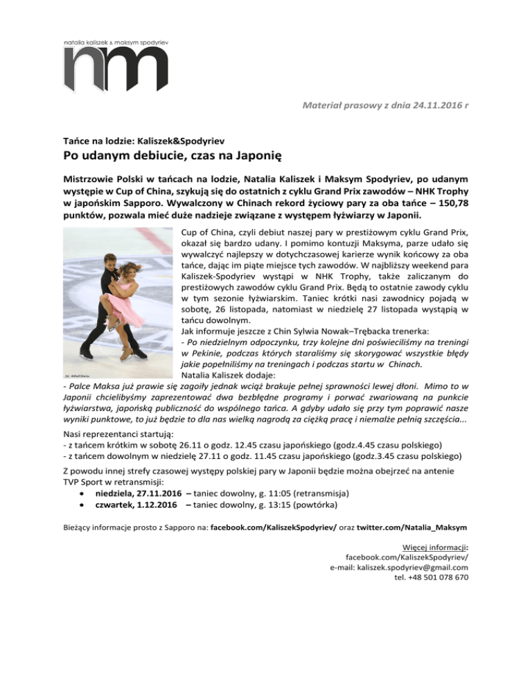 Materiał prasowy z dnia 24.11.2016 r Tańce na lodzie: Kaliszek&Spodyriev Po udanym debiucie, czas na Japonię Mistrzowie Polski w tańcach na lodzie, Natalia Kaliszek i Maksym Spodyriev, po udanym występie w Cup of China, szykują się do ostatnich z cyklu Grand Prix zawodów – NHK Trophy w japońskim Sapporo. Wywalczony w Chinach rekord życiowy pary za oba tańce – 150,78 punktów, pozwala mieć duże nadzieje związane z występem łyżwiarzy w Japonii. Cup of China, czyli debiut naszej pary w prestiżowym cyklu Grand Prix, okazał się bardzo udany. I pomimo kontuzji Maksyma, parze udało się wywalczyć najlepszy w dotychczasowej karierze wynik końcowy za oba tańce, dając im piąte miejsce tych zawodów. W najbliższy weekend para Kaliszek-Spodyriev wystąpi w NHK Trophy, także zaliczanym do prestiżowych zawodów cyklu Grand Prix. Będą to ostatnie zawody cyklu w tym sezonie łyżwiarskim. Taniec krótki nasi zawodnicy pojadą w sobotę, 26 listopada, natomiast w niedzielę 27 listopada wystąpią w tańcu dowolnym. Jak informuje jeszcze z Chin Sylwia Nowak–Trębacka trenerka: - Po niedzielnym odpoczynku, trzy kolejne dni poświeciliśmy na treningi w Pekinie, podczas których staraliśmy się skorygować wszystkie błędy jakie popełniliśmy na treningach i podczas startu w Chinach. Natalia Kaliszek dodaje: - Palce Maksa już prawie się zagoiły jednak wciąż brakuje pełnej sprawności lewej dłoni. Mimo to w Japonii chcielibyśmy zaprezentować dwa bezbłędne programy i porwać zwariowaną na punkcie łyżwiarstwa, japońską publiczność do wspólnego tańca. A gdyby udało się przy tym poprawić nasze wyniki punktowe, to już będzie to dla nas wielką nagrodą za ciężką pracę i niemalże pełnią szczęścia... Nasi reprezentanci startują: - z tańcem krótkim w sobotę 26.11 o godz. 12.45 czasu japońskiego (godz.4.45 czasu polskiego) - z tańcem dowolnym w niedzielę 27.11 o godz. 11.45 czasu japońskiego (godz.3.45 czasu polskiego) Z powodu innej strefy czasowej występy polskiej pary w Japonii będzie można obejrzeć na antenie TVP Sport w retransmisji: niedziela, 27.11.2016 – taniec dowolny, g. 11:05 (retransmisja) czwartek, 1.12.2016 – taniec dowolny, g. 13:15 (powtórka) Bieżący informacje prosto z Sapporo na: facebook.com/KaliszekSpodyriev/ oraz twitter.com/Natalia_Maksym Więcej informacji: facebook.com/KaliszekSpodyriev/ e-mail: [email protected] tel. +48 501 078 670
