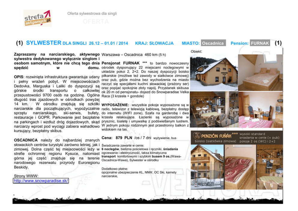 Oferta sylwestrowa dla singli OFERTA (1) SYLWESTER DLA SINGLI 26 .12 – 01.01 / 2014 KRAJ: SŁOWACJA MIASTO: Oscadnica Zapraszamy na narciarskiego, aktywnego Warszawa – Oscadnica 460 km (5 h) sylwestra dedykowanego wyłącznie singlom i osobom samotnym, które nie chcą tego dnia Pensjonat FURNAK *** to bardzo nowoczesny spędzić w domu. ośrodek dysponujący 22 miejscami noclegowymi w OPIS: rozwinięta infrastruktura gwarantuje udany i pełny wrażeń pobyt. W miejscowościach Dedovka, Marguska i Laliki do dyspozycji są górskie środki transportu o całkowitej przepustowości 9700 osób na godzinę. Ogólna długość tras zjazdowych w ośrodkach powyżej 14 km. W ośrodku znajdują się szkółki narciarskie dla początkujących, wypożyczalnie sprzętu narciarskiego, ski-serwis, bufety, restauracje i GOPR. Parkowanie jest bezpłatne na parkingach i wzdłuż dróg dojazdowych, skąd narciarzy wprost pod wyciągi zabiera wahadłowo kursujący, bezpłatny skibus. OSCADNICA należy do najbardziej znanych słowackich centrów turystyki zarówno letniej, jak i zimowej. Dolna część tej miejscowości leży w strefie ochronnej regionu Kysuce, natomiast górna jej część znajduje się na terenie narodowego rezerwatu przyrody Euroregionu Beskidy. Strony WWW: http://www.snowparadise.sk/ układzie pokoi 2, 2+2. Do naszej dyspozycji boisko piłkarskie (możliwe też zawody w siatkówce zimowej) oraz pub, gdzie można bez wychodzenia na miasto raczyć się specjałami kuchni słowackiej (prażony ser) oraz popijać spokojnie złoty napój. Przystanek skibusa ok 20 m od pensjonatu- dojazd do Snowparadise Velka Raca (3 krzesła + gondole) WYPOSAŻENIE: wszystkie pokoje wyposażone są w radio, telewizor z telewizją kablową, bezpłatny dostęp do internetu (WIFI zone), Szafa na garderobę i dwa krzesła relaksujące. Łazienki są wyposażone w prysznic, toaletę i umywalkę z podświetlanym lustrem. W jednym pokoju rodzinnym jest przestronny balkon z widokiem na las. Cena: 879 PLN /os / 7 dni wyżywienie, bus Świadczenia zawarte w cenie: 6 noclegów, bielizna pościelowa i ręczniki, śniadania ogrzewanie i elektryczność, taksa klimatyczna transport komfortowymi i szybkim busem 9 os.(WawaOscadnica-Wawa), Sylwester w ośrodku Dodatkowo płatne: opcjonalne ubezpieczenie KL, NNW, OC Ski, karnety narciarskie, Obiekt: Pension: FURNAK (1) czarne: km czerwone: km niebieskie: km Razem: km