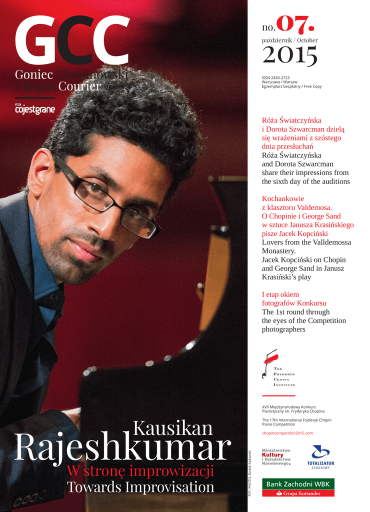 07. no. 2015 październik / October ISSN 2450-2723 Warszawa / Warsaw Egzemplarz bezpłatny / Free Copy Róża Światczyńska i Dorota Szwarcman dzielą się wrażeniami z szóstego dnia przesłuchań Róża Światczyńska and Dorota Szwarcman share their impressions from the sixth day of the auditions Kochankowie z klasztoru Valdemosa. O Chopinie i George Sand w sztuce Janusza Krasińskiego pisze Jacek Kopciński Lovers from the Valldemossa Monastery. Jacek Kopciński on Chopin and George Sand in Janusz Krasiński’s play I etap okiem fotografów Konkursu The 1st round through the eyes of the Competition photographers XVII Międzynarodowy Konkurs Pianistyczny im. Fryderyka Chopina Kausikan W stronę improwizacji Towards Improvisation chopincompetition2015.com FOT./PHOTO: Bartek Sadowski Rajeshkumar The 17th International Fryderyk Chopin Piano Competition Wydawca/Publisher: Narodowy Instytut Fryderyka Chopina Redaktor Naczelna/Editor -in-Chief: Agata Kwiecińska Redaktor Prowadząca /Commissioning Editor: Dorota Kozińska Redakcja/Editorial Staff: Magdalena Romańska, Krzysztof Komarnicki Projekt graficzny/Layout: Joanna Cymkiewicz (INFOR IT) Tłumacze/Translators: Cara Thornton, Michał Szostało Skład/DTP: Agora S.A. Korekta/Proofreading: Agora S.A. Druk/Print: Perfekt S.A. K jak Kawai Firma Kawai wytwarza niemal wyłącznie instrumenty klawiszowe (ale nie tylko, bo na przykład produkujemy też niektóre części dla Toyoty). Budujemy instrumenty akustyczne i elektroniczne. Jeśli chodzi o fortepiany koncertowe, to mieliśmy w ofercie aż sześć rozmaitych serii, teraz skupiliśmy się na czterech, od najtańszej linii oznaczonej kodem CR, przez GE i GX, aż po Shigeru Kawai EX, który przywieźliśmy do Warszawy. To nasz najlepszy fortepian: EX znaczy „excellent” – „doskonały, znakomity”. Harmonogram dnia / Schedule of the day Sesja poranna / Morning session 10.00 Hin-Yat Tsang Chiny/China Nie jest dziś łatwo sprzedawać fortepiany. Większość młodzieży woli brzmienia elektroniczne i nie jest zainteresowana grą na fortepianie. Osoby zajmujące się muzyką klasyczną poszukują przede wszystkim dobrego instrumentu. 10.25 Alexander Ullman Kilkanaście lat temu przeprowadziliśmy doświadczenia sprawdzające możliwość wykorzystania tworzyw sztucznych do budowy instrumentów. Chcieliśmy znaleźć alternatywę dla materiałów tradycyjnych – drewna czy skóry. Zastosowaliśmy ABS (kopolimer akrylonitrylo-butadieno-styrenowy), materiał bardzo dobrej jakości. Wykorzystujemy go do budowy mechaniki naszych instrumentów, od fortepianów z najwyższej półki po najtańsze pianina. ABS pozwala na precyzyjne utrzymywanie wagi i wymiarów poszczególnych elementów w warunkach zmiennej wilgotności powietrza. Ten kompozyt przypomina wyglądem drewno, ale jego właściwości i zachowanie są zupełnie odmienne. Dzięki zastosowaniu tworzywa ABS klawiatura Kawai jest bardzo wyrównana. Pianista może bez trudu odnaleźć swoje touché i zyskać poczucie pełnej władzy nad instrumentem. Chiny/China Jeśli miałbym porównać Kawai do któregoś z żywiołów, rzekłbym, że jest to ziemia. Ziemia jest wszystkim, co znamy, zawiera w sobie wszystkie pozostałe żywioły – jest skończoną całością. Wielka Brytania/UK 10.50 Chao Wang 11.15 Zhu Wang Chiny/China 12.10 Andrzej Wierciński Polska/Poland 12.35 Yuchong Wu Chiny/China 13.00 Zi Xu Chiny/China 13.25 Yike (Tony) Yang Kanada/Canada Atsushi Komiyama, technik fortepianowy, kierownik działu obsługi artystów Wysłuchał Krzysztof Komarnicki 2 GCC Goniec Chopinowski / Chopin Courier K for Kawai The Kawai company produces almost solely keyboard instruments (but not only, because we also produce, for example, certain parts for Toyota cars). We produce acoustic and electronic instruments. As far as grand pianos are concerned, we used to have six different series in our product lineup, but now we concentrate on just four – from the least expensive CR line, through the GE and GX series, to the Shigeru Kawai EX that we have brought to Warsaw. It is our best grand piano: EX means ‘excellent’. It is not easy to sell pianos today. Most young people prefer electronic sounds and are not interested in playing the piano. But people involved in classical music are looking, above all, for a good instrument. About 17 years ago, we began to analyze the possibility of using composite materials to build instruments. We wanted to find an alternative to traditional materials: wood or leather. We utilized ABS (Acrylonitrile-Butadiene-Styrene polymer), a material of very high quality. We use it to build the action of our instruments, from the highest-class concert grands to the cheapest upright instruments. ABS permits us to maintain the precise weight and dimensions of individual elements in conditions of changing humidity. This composite looks similar to wood, but its properties and behavior are completely different. Thanks to the use of ABS, the Kawai keyboard is very even. The pianist can easily find their touch and gain a feeling of full control over the instrument. If I were to compare the Kawai piano to one of the elements, it would be the Earth. The Earth is everything that we know; it contains all the remaining elements within itself – it is a complete whole. Atsushi Komiyama, Concert Piano Technician, Director, Artist Services Department, recorded by Krzysztof Komarnicki Sesja popołudniowa / Afternoon session 17.00 Yuliya Yermalayeva Białoruś/Belarus 17.25 Cheng Zhang Chiny/China 17.50 Chuhan Zhang Chiny/China 18.15 Annie Zhou Kanada/Canada 19.10 Soo Jung Ann Korea Płd/South Korea 19.35 Miyako Arishima Japonia/Japan Zdaniem recenzentów / In the Reviewers’ Opinion Chopin urodzonego w Londynie Kausikana Rajeshkumara jest trochę z innej planety – szkicowany cienkim piórkiem, jakby improwizowany, pozbawiony jednak głębszej treści. To wrażenie wzmogło się jeszcze w zderzeniu z najwyższej próby pianistyk