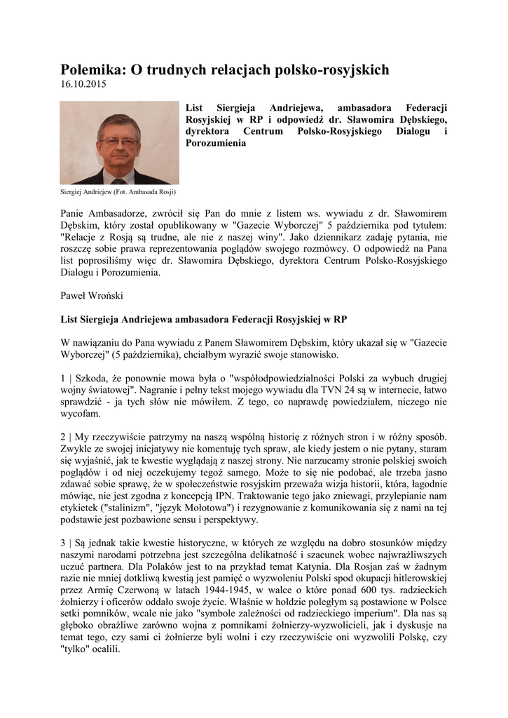 Na list rosyjskiego ambasadora odpowiada dr Sławomir Dębski, dyrektor Centrum