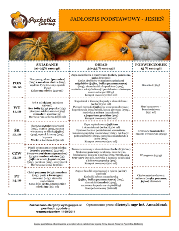 JADŁOSPIS PODSTAWOWY - JESIEŃ ŚNIADANIE 20-25% energii OBIAD 30-35 % energii PODWIECZOREK 15 % energii PON 10.10 Pieczywo graham (pszenica) (60g) z masłem ekstra (10g), wędlina (30g),zielony ogórek (30g) Kakao na mleku (250 ml) Zupa zacierkowa z warzywami (seler, pszenica, jajko) (300ml) Kotlet drobiowy w panierce z płatkami migdałów (jajko, bułka pszenna tarta) (60g), ziemniaczki z koperkiem (150g), surówka z sałaty lodowej i pomidorów z ziołowym sosem winegret (80g) Kompot owocowy (200 ml) Gruszka (150g) WT 11.10 Ryż z mlekiem i miodem (250ml) Ser żółty (30g), papryka (15g), pieczywo wieloziarniste (30g) z masłem ekstra (5g) Herbata rumiankowa (250 ml) Kapuśniak z kiszonej kapusty z ziemniakami (seler) (300 ml) Pieczeń rzymska (jajko) w sosie pomidorowo koperkowym (60g/50ml), kasza gryczana (150g), surówka z selera i marchewki z jogurtem greckim (40g) Kompot owocowy (200 ml) Mus bananowo – brzoskwiniowy (150 ml) ŚR 12.10 Pieczywo żytnie z ziarnami (60g), masło (10g), pasztet wieprzowy ze śliwką (jajko) (30g), ogórek kiszony (30g), koperek Mleko z karobem (250 ml) Zupa szpinakowa z jajkiem i ziemniakami (seler) (300 ml) Dyniowe leczo z pomidorami, czosnkiem, kolorową papryką i soczewicą (100g), ryż biały i pełnoziarnisty (150g), surówka z marchewki i pora (80g) Kompot owocowy (200 ml) Kremowy twarożek z musem owocowym (150g) CZW 13.10 Płatki pełnoziarniste na mleku (otręby pszenne) (250 ml) Pieczywo z orkiszem(pszenica) (30g) z masłem ekstra (5g), jajko w sosie jogurtowym (50g), pomidor (20g), szczypiorek Herbata owocowa (250 ml) Barszcz czerwony z ziemniakami (seler) (300ml) Makaron pszenny z cukinią, marchewką, brokułami i mięsem z indyka(180g/50ml), sos trzy sery (50 ml), surówka z kapusty pekińskiej z kolorową papryką (40g) Kompot owocowy (200 ml) Winogrona (150g) Chleb pszenny (60g) z masłem (10g), pasta z twarogu z owocami (40g), ziarenka słonecznika Kawa inka (żyto, jęczmień) z mlekiem (250 ml) Zupa z fasolki szparagowej z ryżem (seler) (300ml) Kotleciki rybne z marchewką (jajko, bułka pszenna tarta) (60g), ziemniaki (masło) (150g), czerwona kapusta na ciepło (80g) Kompot owocowy (200ml) PT 14.10 Zaznaczono alergeny występujące w posiłkach zgodnie z rozporządzeniem 1169/2011 Ciasto marchewkowe z imbirem (mąka pszenna, jajko) 1 kawałek Opracowano przez: dietetyk mgr inż. Anna Motak Zakaz powielania i kopiowania w części lub w całości bez zgody firmy Jacek Książyk Pychotka Catering JADŁOSPIS PODSTAWOWY - JESIEŃ ŚNIADANIE 20-25% energii OBIAD 30-35 % energii PODWIECZOREK 15 % energii PON 17.10 Płatki żytnie z mlekiem (250 ml) Chleb pszenny (30g) z masłem (5g), ser żółty (30g), papryka (15g) Herbata owocowa (250 ml) Zupa krem z pomidorów z makaronem (seler, pszenica) (300 ml) Fileciki indycze w płatkach owsianych (jajko) (60g), ziemniaki (150g), mizeria z zielonych ogórków z jogurtem greckim (80g) Kompot owocowy (200ml) Jabłko (150g) WT 18.10 Chleb pszenny graham (60g) z masłem (10g), pasta jajeczna (30g), zielony ogórek (30g), szczypiorek Kawa zbożowa z mlekiem (250ml) Zupa kalafiorowa z ziemniakami i natką pietruszki (seler) (300ml) Gulasz jarzynowo – wieprzowy (100g), kasza jaglana (150g), surówka z kiszonych ogórków z natką pietruszki (40g) Kompot owocowy (200ml) Bułka grahamka (pszenica) z powidłami śliwkowymi (30g/5g) ŚR 19.10 Płatki musli (pszenica, owies) z mlekiem (250 ml) Chleb orkiszowy (orkisz, pszenica) (30g) z masłem (5g), pasta serowa ze świeżą bazylią (30g), pomidor (20g) Herbata owocowa (250 ml) Zupa ogórkowa z ryżem (seler) (300ml) Kotlet wieprzowy z mięsa mielonego z brokułami (jajko, pszenica) (60g), ziemniaki (150g), surówka z buraczków (80g) Kompot owocowy (200ml) Brzoskwinia (150g) Chleb razowy (pszenica) (60g) z masłem (10g), szynka pieczona (30g), kiszony ogórek (20g), sałata Kakao na mleku (250ml) Zupa z zielonego groszku z ziemniakami (seler) (300ml) Ryż zapiekany z jabłkami i cynamonem (jajko, mleko) (180g), polewa jogurtowo - bananowo - waniliowa (50 ml), surówka z dyni hokkaido z jabłkiem i rodzynkami (40g) Kompot owocowy (200ml) Kalafior na parze z posypką gomasio (150g) Manna pszenna z bananami na mleku (250 ml) Pasta z twarożku z jajkiem (30g), pomidor (20g), pieczywo wieloziarniste (pszenica) (30g) z masłem (5g) Herbata owocowa (250 ml) Zupa jarzynowa z kaszą jaglaną i brukselką (seler) (300ml) Kotleciki rybne w sosie greckim (60g/50ml), ziemniaki puree (masło) (150g), surówka z białej kapusty z zielonym ogórkiem i koperkiem (40g) Kompot mieszany (200 ml) Ciasteczka owsiane z karobem (jajko, owies, pszenica, masło) 2 szt. CZW 20.10 PT 21.10 Zaznaczono alergeny występujące w posiłkach zgodnie z rozporządzeniem 1169/2011 Opracowano przez: dietetyk mgr inż. Anna Motak Zakaz powielania i kopiowania w części lub w całości bez zgody firmy Jacek Książyk Pychotka Catering