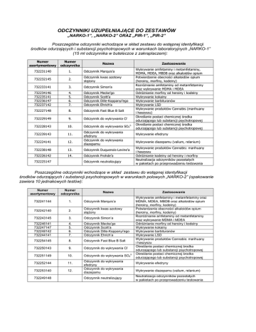 ODCZYNNIKI UZUPEŁNIAJĄCE DO ZESTAWÓW „NARKO-1”, „NARKO-2” ORAZ „PIR-1”, „PIR-2” Poszczególne odczynniki wchodzące w skład zestawu do wstępnej identyfikacji środków odurzających i substancji psychotropowych w warunkach laboratoryjnych „NARKO-1” (15 ml odczynnika w buteleczce z zakraplaczem): Numer asortymentowy Numer odczynnika Nazwa Zastosowanie 732231140 1. Odczynnik Marquis’a 732232145 2. Odczynnik kwas azotowy stężony 732233141 3. Odczynnik Simon’a 732234146 732235141 732236147 732237142 4. 5. 6. 7. Odczynnik Odczynnik Odczynnik Odczynnik 732227148 8. Odczynnik Fast Blue B Salt 732229149 9. Odczynnik do wykrywania Cl- 732228143 10. Odczynnik do wykrywania SO42- 732239143 11. 732224141 12. 732238148 13. Odczynnik Duquenois-Levine’a 732226142 14. Odczynnik Frohde’a 732225147 Mecke’go Scott’a Dille-Koppanyi’ego Ehrich’a Odczynnik do wykrywania efedryny Odczynnik do wykrywania diazepamu Wykrywanie amfetaminy i metamfetaminy, MDMA, MDEA, MBDB oraz alkaloidów opium Potwierdzenie obecności alkaloidów opium (heroiny, morfiny, kodeiny) Rozróżnianie amfetaminy od metamfetaminy oraz wykrywanie MDMA i MDEA Odróżnianie morfiny od heroiny i kodeiny Wykrywanie kokainy Wykrywanie barbituranów Wykrywanie LSD Wykrywanie produktów Cannabis (marihuany i haszyszu) Określanie postaci chemicznej środka odurzającego lub substancji psychotropowej Określanie postaci chemicznej środka odurzającego lub substancji psychotropowej Wykrywanie efedryny Wykrywanie diazepamu (valium, relanium) Wykrywanie produktów Cannabis: marihuany i haszyszu Odróżnianie kodeiny od heroiny i morfiny Neutralizacja odczynników pozostałych w pakietach po przeprowadzeniu testowania Odczynnik neutralizujący Poszczególne odczynniki wchodzące w skład zestawu do wstępnej identyfikacji środków odurzających i substancji psychotropowych w warunkach polowych „NARKO-2” (opakowanie zawiera 10 jednakowych testów): Numer asortymentowy Numer odczynnika 732241144 1. Odczynnik Marquis’a 732242140 2. Odczynnik kwas azotowy stężony Nazwa Zastosowanie 732243145 3. Odczynnik Simon’a 732246141 732247147 732248142 732244141 4. 5. 6. 7. Odczynnik Mecke’go Odczynnik Scott’a Odczynnik Dille-Koppanyi’ego Odczynnik Ehrich’a 732254145 8. Odczynnik Fast Blue B Salt 732250143 9. Odczynnik do wykrywania Cl 732251149 10. Odczynnik do wykrywania SO4 732252144 11. 732253140 12. 732249148 - 2- Odczynnik do wykrywania efedryny Odczynnik do wykrywania diazepamu Odczynnik neutralizujący Wykrywanie amfetaminy i metamfetaminy oraz MDMA, MDEA, MBDB oraz alkaloidów opium (heroiny, morfiny, kodeiny) Potwierdzenie obecności alkaloidów opium (heroiny, morfiny, kodeiny) Rozróżnianie amfetaminy od metamfetaminy oraz wykrywanie MDMA i MDEA Odróżnianie morfiny od heroiny i kodeiny Wykrywanie kokainy Wykrywanie barbituranów Wykrywanie LSD Wykrywanie produktów Cannabis: marihuany i haszyszu Określanie postaci chemicznej środka odurzającego lub substancji psychotropowej Określanie postaci chemicznej środka odurzającego lub substancji psychotropowej Wykrywanie efedryny Wykrywanie diazepamu (valium, relanium) Neutralizacja odczynników pozostałych w pakietach po przeprowadzeniu testowania Poszczególne odczynniki wchodzące w skład zestawu do rozpoznawania i identyfikacji materiałów wybuchowych w warunkach laboratoryjnych „PIR-1” (15 ml odczynnika w buteleczce z zakraplaczem): Numer asortymentowy Numer odczynnika 898025148 1. Odczynnik R 898021146 2. Odczynnik A 898022141 3. Odczynnik B 898023147 4. Odczynnik C (C1+ C2) Nazwa Zastosowanie Uniwersalny rozpuszczalnik materiałów wybuchowych Wywołuje charakterystyczną reakcję barwną z utleniaczami Wywołuje charakterystyczne reakcje barwne z polinitrozwiązkami Odczynnik Griessa – wywołuje charakterystyczną reakcję barwną z jonami azotynowymi Poszczególne odczynniki wchodzące w skład zestawu do rozpoznawania i identyfikacji materiałów wybuchowych w warunkach polowych „PIR-2” (odczynniki w aerozolu): Numer asortymentowy Numer odczynnika 898026143 1. Odczynnik W 898027149 2. Odczynnik S (S1 + S2) 898028144 3. Odczynnik O Nazwa Zastosowanie Wywołuje charakterystyczne reakcje barwne z polinitrozwiązkami (z wyjątkiem heksogenu i oktogenu) Wywołuje charakterystyczną reakcję barwną z jonami azotynowymi Odczynnik redukujący azotany do azotynów