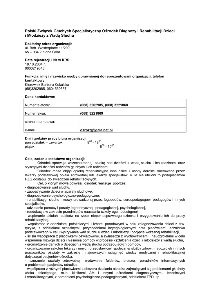 Polski Związek Głuchych Specjalistyczny Ośrodek Diagnozy i Rehabilitacji Dzieci i Młodzieży z Wadą Słuchu Dokładny adres organizacji: ul. Boh. Westerplatte 11/200 65 – 034 Zielona Góra Data rejestracji i Nr w KRS: 18.10.2004 r. 0000219648 Funkcja, imię i nazwisko osoby uprawnionej do reprezentowani organizacji, telefon kontaktowy: Kierownik Barbara Kukulska (68)3202985, 0604530367 Dane kontaktowe: Numer telefonu: (068) 3202985, (068) 3221868 Numer faksu: (068) 3221869 strona internetowa: e-mail: [email protected] Dni i godziny pracy biura organizacji: poniedziałek – czwartek 800 - 1800 piątek 800 - 1500 Cele, zadania statutowe organizacji: Ośrodek sprawuje wszechstronną opiekę nad dziećmi z wadą słuchu i ich rodzinami oraz słyszącymi dziećmi rodziców głuchych i ich rodzinami. Ośrodek może objąć opieką rehabilitacyjną inne dzieci i osoby dorosłe skierowane przez lekarzy podstawowej opieki zdrowotnej lub lekarzy specjalistów, o ile nie utrudni to podopiecznym PZG dostępu do świadczeń rehabilitacyjnych. Cel, o którym mowa powyżej, ośrodek realizuje poprzez: - diagnozowanie wad słuchu, - zaopatrywanie dzieci w aparaty słuchowe, - diagnozowanie psychologiczno-pedagogiczne, - rehabilitację słuchu i mowy prowadzoną przez logopedów, surdopedagogów, pedagogów i innych specjalistów, - udzielanie pomocy i porady logopedycznej, pedagogicznej, psychologicznej, - reedukacja w zakresie przedmiotów nauczania szkoły ogólnodostępnej, - wspieranie działań rodziców na rzecz niepełnosprawnego dziecka i przygotowanie ich do pracy rehabilitacyjnej, - współpraca z oddziałami położniczymi i izbami porodowymi w celu zdiagnozowania dzieci z tzw. ryzyka, z oddziałami szpitalnymi, przychodniami laryngologicznymi oraz placówkami lecznictwa podstawowego w celu wykrywania wad słuchu u dzieci i młodzieży i podjęcie wczesnej rehabilitacji, - ścisła współpraca z placówkami oświatowymi, a zwłaszcza z wychowawcami i nauczycielami w celu wspierania rozwoju dzieci i niesienia pomocy w procesie kształcenia dzieci i młodzieży z wadą słuchu, - gromadzenie danych o dzieciach z wadą słuchu potrzebujących pomocy, - organizowanie szkoleń lekarzy i innych przedstawicieli społecznej służby zdrowi, nauczycieli i innych pracowników oświaty w zakresie najnowszych osiągnięć wiedzy medycznej i rehabilitacyjnej dotyczącej pacjentów ośrodka, - szerzenie oświaty zdrowotnej, wydawanie folderów, broszur, poradników informacyjnych o problemach pacjentów ośrodka, - współpraca z różnymi placówkami z obszaru działania ośrodka zajmującymi się problemami głuchoty wieku dziecięcego, m.in. klinikami AM i innymi ośrodkami diagnostycznymi, leczniczymi i rehabilitacyjnymi, z poradniami psychologiczno-pedagogicznymi, oddziałami TPD, itp. Zakres działalności organizacji, informacje o realizowanych przedsięwzięciach: - diagnozy psychologiczno – pedagogiczne - rehabilitacja słuchu, głosu i mowy, prowadzoną przez logopedów, pedagogów, psychologów, logorytmika - pomoc i porady psychologiczne, logopedyczne, pedagogiczne - wspieranie działań rodziców na rzecz niepełnosprawnego dziecka, terapeutyczne oddziaływanie na rodzinę dziecka i przygotowanie jej do pracy rehabilitacyjnej - organizacja półkolonii i turnusów rehabilitacyjnych, imprez integracyjnych. Dotychczasowa współpraca z Miastem (uczestniczenie w programach, konkursach itp.) Stowarzyszenie przy współpracy z miastem realizowało: programy profilaktyki wad słuchu: 2001 – badania przesiewowe słuchu dzieci do 2 r.ż. 2002 – badania przesiewowe słuchu dzieci do 6 r.ż. badania przesiewowe słuchu dzieci szkolnych 2003 - badania przesiewowe słuchu dzieci do 6 r.ż. badania przesiewowe słuchu dzieci szkolnych - półkolonie rehabilitacyjne dla dzieci z wadą słuchu; - turnusy rehabilitacyjne; - imprezy kulturalne dla dzieci z wadą słuchu (środki PFRON-u): 2002 – Koncert PODRÓŻ DO KRAINY DŹWIĘKÓW 2003 - Koncert II PODRÓŻ DO KRAINY DŹWIĘKÓW 2004 – Koncert III PODRÓŻ DO KRAINY DŹWIĘKÓW - imprezy turystyczne dla młodzieży z wadą słuchu: 2004 – dwudniowa wycieczka krajoznawcza do Karpacza i okolic – (środki PFRON-u) Zasięg terytorialny działania organizacji: województwo lubuskie Aktualizacja 27.09.2005r.