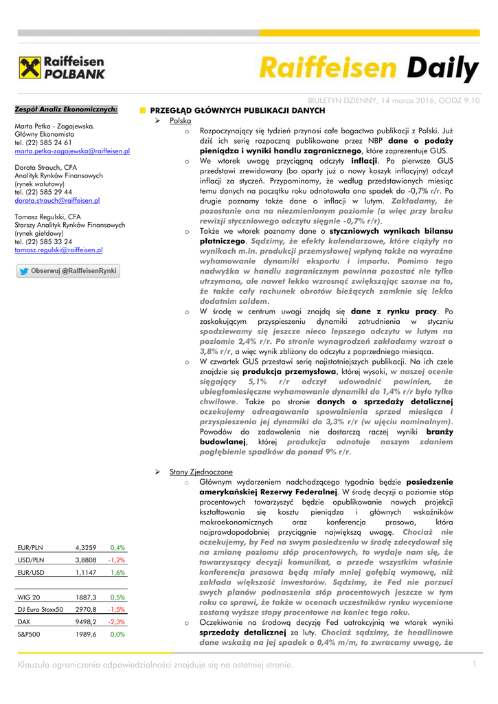 Zespół Analiz Ekonomicznych: Marta Petka - Zagajewska. Główny Ekonomista tel. (22) 585 24 61 [email protected] Dorota Strauch, CFA Analityk Rynków Finansowych (rynek walutowy) tel. (22) 585 29 44 [email protected] Tomasz Regulski, CFA Starszy Analityk Rynków Finansowych (rynek giełdowy) tel. (22) 585 33 24 [email protected] BIULETYN DZIENNY, 14 marca 2016, GODZ 9.10 PRZEGŁĄD GŁÓWNYCH PUBLIKACJI DANYCH Polska o Rozpoczynający się tydzień przynosi całe bogactwo publikacji z Polski. Już dziś ich serię rozpoczną publikowane przez NBP dane o podaży pieniądza i wyniki handlu zagranicznego, które zaprezentuje GUS. o We wtorek uwagę przyciągną odczyty inflacji. Po pierwsze GUS przedstawi zrewidowany (bo oparty już o nowy koszyk inflacyjny) odczyt inflacji za styczeń. Przypominamy, że według przedstawionych miesiąc temu danych na początku roku odnotowała ona spadek do -0,7% r/r. Po drugie poznamy także dane o inflacji w lutym. Zakładamy, że pozostanie ona na niezmienionym poziomie (a więc przy braku rewizji styczniowego odczytu sięgnie -0,7% r/r). o Także we wtorek poznamy dane o styczniowych wynikach bilansu płatniczego. Sądzimy, że efekty kalendarzowe, które ciążyły na wynikach m.in. produkcji przemysłowej wpłyną także na wyraźne wyhamowanie dynamiki eksportu i importu. Pomimo tego nadwyżka w handlu zagranicznym powinna pozostać nie tylko utrzymana, ale nawet lekko wzrosnąć zwiększąjąc szanse na to, że także cały rachunek obrotów bieżących zamknie się lekko dodatnim saldem. o W środę w centrum uwagi znajdą się dane z rynku pracy. Po zaskakującym przyspieszeniu dynamiki zatrudnienia w styczniu spodziewamy się jeszcze nieco lepszego odczytu w lutym na poziomie 2,4% r/r. Po stronie wynagrodzeń zakładamy wzrost o 3,8% r/r, a więc wynik zbliżony do odczytu z poprzedniego miesiąca. o W czwartek GUS przestawi serię najistotniejszych publikacji. Na ich czele znajdzie się produkcja przemysłowa, której wysoki, w naszej ocenie sięgający 5,1% r/r odczyt udowodnić powinien, że ubiegłomiesięczne wyhamowanie dynamiki do 1,4% r/r było tylko chwilowe. Także po stronie danych o sprzedaży detalicznej oczekujemy odreagowania spowolnienia sprzed miesiąca i przyspieszenia jej dynamiki do 3,3% r/r (w ujęciu nominalnym). Powodów do zadowolenia nie dostarczą raczej wyniki branży budowlanej, której produkcja odnotuje naszym zdaniem pogłębienie spadków do ponad 9% r/r. EUR/PLN 4,3259 0,4% USD/PLN 3,8808 -1,2% EUR/USD 1,1147 1,6% WIG 20 1887,3 0,5% DJ Euro Stoxx50 2970,8 -1,5% DAX 9498,2 -2,3% S&P500 1989,6 0,0% Stany Zjednoczone o Głównym wydarzeniem nadchodzącego tygodnia będzie posiedzenie amerykańskiej Rezerwy Federalnej. W środę decyzji o poziomie stóp procentowych towarzyszyć będzie opublikowanie nowych projekcji kształtowania się kosztu pieniądza i głównych wskaźników makroekonomicznych oraz konferencja prasowa, która najprawdopodobniej przyciągnie największą uwagę. Chociaż nie oczekujemy, by Fed na swym posiedzeniu w środę zdecydował się na zmianę poziomu stóp procentowych, to wydaje nam się, że towarzyszący decyzji komunikat, a przede wszystkim właśnie konferencja prasowa będą miały mniej gołębią wymowę, niż zakłada większość inwestorów. Sądzimy, że Fed nie porzuci swych planów podnoszenia stóp procentowych jeszcze w tym roku co sprawi, że także w ocenach uczestników rynku wycenione zostaną wyższe stopy procentowe na koniec tego roku. o Oczekiwanie na środową decyzję Fed uatrakcyjnią we wtorek wyniki sprzedaży detalicznej za luty. Chociaż sądzimy, że headlinowe dane wskażą na jej spadek o 0,4% m/m, to zwracamy uwagę, że Klauzula ograniczenia odpowiedzialności znajduje się na ostatniej stronie. 1 o o BIULETYN DZIENNY, 14 marca 2016, GODZ 9.10 przy około 1%-owym spadku cen w tym samym okresie oznaczać to będzie realny wzrost sprzedaży o 0,6% m/m, a więc sygnał solidnego popytu po stronie konsumentów. W środę poznamy lutowe wyniki produkcji przemysłowej i odczyt inflacji. Po silnym wzroście produkcji w styczniu (0,9% m/m) oczekujemy nieznacznego spadku o 0,1% m/m. Na danych o inflacji ponownie mocno ciążyć będą ceny paliw (w lutym spadły o 9,2% m/m). W efekcie oczyszczony o wahania sezonowe indeks cen powinien wskazać na ich spadek w lutym o 0,2% m/m, co oznaczać będzie wyhamowanie rocznej dynamiki do 1,0% r/r z 1,4% r/r miesiąc wcześniej. Inflacja bazowa powinna pozostać na niezmienionym poziomie sięgając 2,2% r/r. We wtorek i czwartek wraz z indeksami Empire State i Philadelphia Fed poznamy pierwsze istotne odczyty regionalnych wskaźników koniunktury w przetwórstwie przemysłowym za marzec. W odniesieniu do obydwu z nich rynkowy konsensus zakłada poprawę sentymentu. Strefa Euro: o Pustawy kalendarz publikacji danych dla strefy euro na ten tydzień daje inwestorom chwilę oddechu po ubiegłotygodniowej decyzji EBC o znaczącym dalszym złagodzeniu polityki pieniężnej. Warte wspomnienia są w naszej ocenie jedynie dwie zaplanowane na ten tydzień publikacje styczniowe wyniki produkcji przemysłowej (publikacja w poniedziałek) oraz produkcji budowlanej (czwartek). W obydwu przypadkach oczekujemy wzrostów (1,7% m/m dla produkcji przemysłowej i 0,3% m/m dla produkcji budowlanej). Szwajcaria o W czwartek swoją decyzję o stopach procentowych ogłosi szwajcarski bank centralny. Pomimo wprowadzonego przez EBC całego szeregu działań łagodzących politykę pieniężną, w tym obniżek stopy depozytowej i referencyjnej, nie sądzimy by już teraz SNB zdecydował się na analogiczne działanie. Wydaje nam się, że na razie szwajcarskie władze monetarne będą próbowały dotychczasową metodą (interwencji werbalnych i faktycznych) przeciwdziałać umocnieniu franka i dopiero gdyby to się nie udawało zdecydują się na kolejną obniżkę docelowego przedziału wahań dla 3-miesięcznego liboru z obecnego poziomu -1,25%