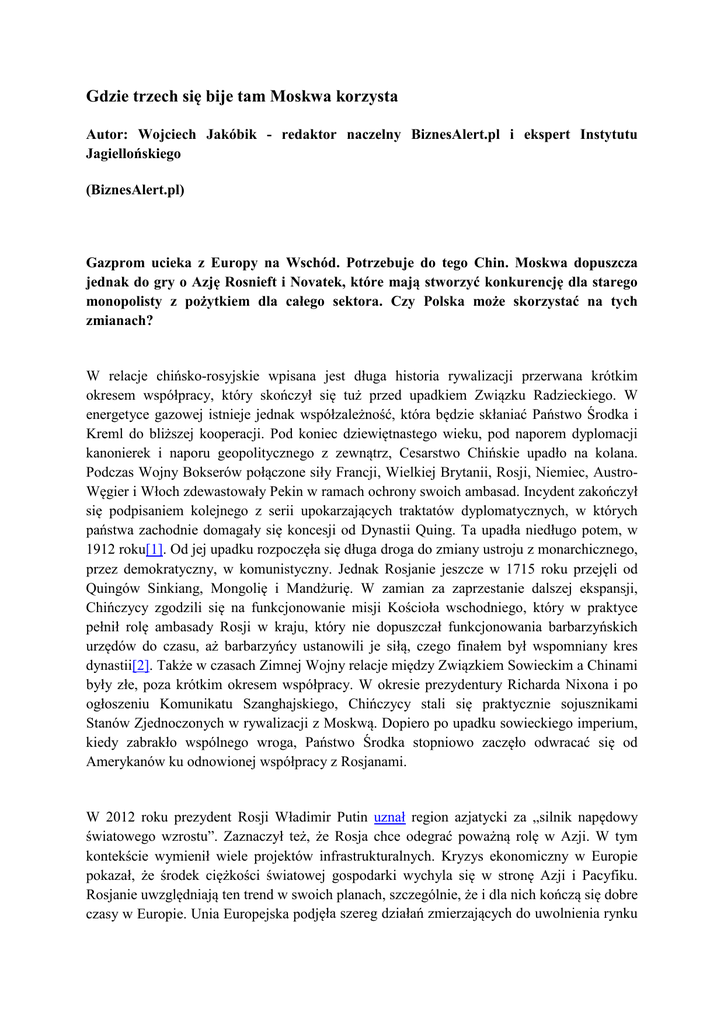 Gdzie trzech się bije tam Moskwa korzysta Autor: Wojciech Jakóbik - redaktor naczelny BiznesAlert.pl i ekspert Instytutu Jagiellońskiego (BiznesAlert.pl) Gazprom ucieka z Europy na Wschód. Potrzebuje do tego Chin. Moskwa dopuszcza jednak do gry o Azję Rosnieft i Novatek, które mają stworzyć konkurencję dla starego monopolisty z pożytkiem dla całego sektora. Czy Polska może skorzystać na tych zmianach? W relacje chińsko-rosyjskie wpisana jest długa historia rywalizacji przerwana krótkim okresem współpracy, który skończył się tuż przed upadkiem Związku Radzieckiego. W energetyce gazowej istnieje jednak współzależność, która będzie skłaniać Państwo Środka i Kreml do bliższej kooperacji. Pod koniec dziewiętnastego wieku, pod naporem dyplomacji kanonierek i naporu geopolitycznego z zewnątrz, Cesarstwo Chińskie upadło na kolana. Podczas Wojny Bokserów połączone siły Francji, Wielkiej Brytanii, Rosji, Niemiec, AustroWęgier i Włoch zdewastowały Pekin w ramach ochrony swoich ambasad. Incydent zakończył się podpisaniem kolejnego z serii upokarzających traktatów dyplomatycznych, w których państwa zachodnie domagały się koncesji od Dynastii Quing. Ta upadła niedługo potem, w 1912 roku[1]. Od jej upadku rozpoczęła się długa droga do zmiany ustroju z monarchicznego, przez demokratyczny, w komunistyczny. Jednak Rosjanie jeszcze w 1715 roku przejęli od Quingów Sinkiang, Mongolię i Mandżurię. W zamian za zaprzestanie dalszej ekspansji, Chińczycy zgodzili się na funkcjonowanie misji Kościoła wschodniego, który w praktyce pełnił rolę ambasady Rosji w kraju, który nie dopuszczał funkcjonowania barbarzyńskich urzędów do czasu, aż barbarzyńcy ustanowili je siłą, czego finałem był wspomniany kres dynastii[2]. Także w czasach Zimnej Wojny relacje między Związkiem Sowieckim a Chinami były złe, poza krótkim okresem współpracy. W okresie prezydentury Richarda Nixona i po ogłoszeniu Komunikatu Szanghajskiego, Chińczycy stali się praktycznie sojusznikami Stanów Zjednoczonych w rywalizacji z Moskwą. Dopiero po upadku sowieckiego imperium, kiedy zabrakło wspólnego wroga, Państwo Środka stopniowo zaczęło odwracać się od Amerykanów ku odnowionej współpracy z Rosjanami. W 2012 roku prezydent Rosji Władimir Putin uznał region azjatycki za „silnik napędowy światowego wzrostu”. Zaznaczył też, że Rosja chce odegrać poważną rolę w Azji. W tym kontekście wymienił wiele projektów infrastrukturalnych. Kryzys ekonomiczny w Europie pokazał, że środek ciężkości światowej gospodarki wychyla się w stronę Azji i Pacyfiku. Rosjanie uwzględniają ten trend w swoich planach, szczególnie, że i dla nich kończą się dobre czasy w Europie. Unia Europejska podjęła szereg działań zmierzających do uwolnienia rynku gazu ziemnego w Europie. Na mocy Dyrektywy 2009/73/EC z 13 lipca 2009 roku Wspólnota tworzy wspólne zasady wewnętrznego rynku gazu ziemnego. Wymuszają one na uczestnikach handlu tym surowcem dopuszczanie konkurencji do własnej infrastruktury. Zapisy Regulacji nr 715/2009 z 13 lipca 2009 roku określają warunki tego dostępu oraz rozdział właścicielski (zasada Third Party Access), zabezpieczający przed tworzeniem się monopoli gazowych[3]. Regulacje te w oczywisty sposób godzą w interesy dotychczasowego monopolisty – Gazpromu. Komisja Europejska prezentuje krytyczne stanowisko wobec działalności tej firmy w Europie. Od września 2012 roku trwa śledztwo KE przeciwko Gazpromowi, które ma wykazać, czy firma dopuściła się do nadużycia swojej pozycji rynkowej w relacjach z odbiorcami gazu na Starym Kontynencie. Komisja ma zastrzeżenia do stosowanej w umowach gazowych z Rosjanami klauzuli take or pay (bierz lub płać), która wymusza na kliencie opłaty zakontraktowanych ilości, nawet jeżeli nie wykorzysta on ich w całości. Podobnie jest formułą cenową, która Rosjanie opierają o indeks ceny ropy naftowej, przez co ostateczna cena surowca jest dużo droższa, niż na rynkach spotowych. Komisja bada także, czy Gazprom nie prowadzi działań zapobiegających dywersyfikacji dostaw gazu do Europy Środkowo-Wschodniej, używając swojej pozycji monopolisty jako karty przetargowej w rozmowach na temat polityki energetycznej poszczególnych państw. Problemy firmy są widoczne także w procesach w Sądach Arbitrażowych, które ta przegrywa. Umowa gazowa zaskarżona przez niemieckie RWE została retroaktywnie zmieniona na podstawie wyroku Sądu Arbitrażowego. Podobne sprawy wytaczają Gazpromowi kolejne firmy, jak E.on, czy ENI. Inne spółki, jak polski PGNiG wybierają drogę negocjacji, którą również otrzymują koncesje ze strony Rosjan[4]. Rosjanie rozmawiają o obniżkach z GDF Suez, EconGas, Wingas oraz WIEH. Sytuację firmy dodatkowo pogarsza łupkowa rewolucja w Stanach Zjednoczonych, przez którą rynki światowe zalewa gaz z Ameryki Północnej, która ma go w nadmiarze. Udziały Gazpromu na rynku importu gazu do Europy Zachodniej bazują głównie na wspomnianych umowach długoterminowych. W 2003 roku Gazprom odpowiadał za 22 procent importu surowca do Europy Zachodniej, w 2008 sięgnął rekordowego poziomu 28,4 procent, spadł w 2010 roku do 23 procent, by ponownie podnieść się do poziomu 27 procent w 2011 roku. Spółka podaje, ze udział w rynku całej Europy spadł o 9 procent, ze względu na „trudny klimat ekonomiczny w regionie”. Gazprom prognozuje, że z tytułu rabatów i wyższych podatków jego zyski w 2013 roku będą o około 10 procent niższe, niż w zeszłym roku. Firma szacuje, że obniżki będą ją kosztowały około 200 miliardów rubli (6 mld dolarów). Akcje Gazpromu w pierwszej połowie 2013 roku zmniejszyły wartość o jedną czwartą. Należy zaznaczyć, że na gorsze wyniki składa się także 5-procentowa podwyżka regulowanych przez państwo cen gazu sprzedawanego przez Gazprom w Rosji. Gazprom: Eksport gazu do Europy
