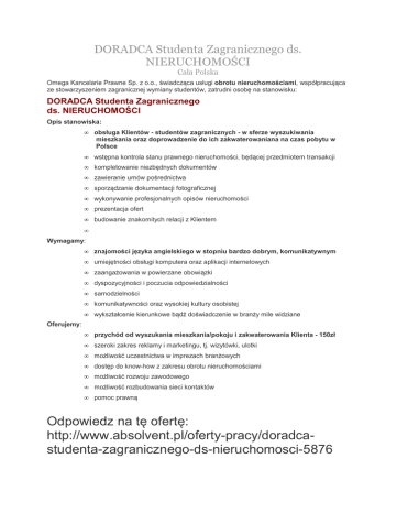 DORADCA Studenta Zagranicznego ds. NIERUCHOMOŚCI Cała Polska Omega Kancelarie Prawne Sp. z o.o., świadcząca usługi obrotu nieruchomościami, współpracująca ze stowarzyszeniem zagranicznej wymiany studentów, zatrudni osobę na stanowisku: DORADCA Studenta Zagranicznego ds. NIERUCHOMOŚCI Opis stanowiska: • obsługa Klientów - studentów zagranicznych - w sferze wyszukiwania mieszkania oraz doprowadzenie do ich zakwaterowaniana na czas pobytu w Polsce • wstępna kontrola stanu prawnego nieruchomości, będącej przedmiotem transakcji • kompletowanie niezbędnych dokumentów • zawieranie umów pośrednictwa • sporządzanie dokumentacji fotograficznej • wykonywanie profesjonalnych opisów nieruchomości • prezentacja ofert • budowanie znakomitych relacji z Klientem • Wymagamy: • znajomości języka angielskiego w stopniu bardzo dobrym, komunikatywnym • umiejętności obsługi komputera oraz aplikacji internetowych • zaangażowania w powierzane obowiązki • dyspozycyjności i poczucia odpowiedzialności • samodzielności • komunikatywności oraz wysokiej kultury osobistej • wykształcenie kierunkowe bądź doświadczenie w branży mile widziane • przychód od wyszukania mieszkania/pokoju i zakwaterowania Klienta - 150zł • szeroki zakres reklamy i marketingu, tj. wizytówki, ulotki • możliwość uczestnictwa w imprezach branżowych • dostęp do know-how z zakresu obrotu nieruchomościami • możliwość rozwoju zawodowego • możliwość rozbudowania sieci kontaktów • pomoc prawną Oferujemy: Odpowiedz na tę ofertę: http://www.absolvent.pl/oferty-pracy/doradcastudenta-zagranicznego-ds-nieruchomosci-5876