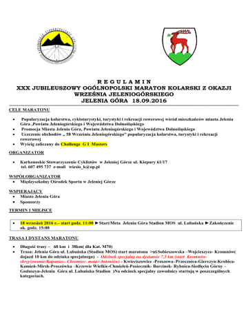 REGULAMIN XXX JUBILEUSZOWY OGÓLNOPOLSKI MARATON KOLARSKI Z OKAZJI WRZEŚNIA JELENIOGÓRSKIEGO JELENIA GÓRA 18.09.2016 ========================================================================================================================= CELE MARATONU Popularyzacja kolarstwa, cykloturystyki, turystyki i rekreacji rowerowej wśród mieszkańców miasta Jelenia Góra ,Powiatu Jeleniogórskiego i Województwa Dolnośląskiego Promocja Miasta Jelenia Góra, Powiatu Jeleniogórskiego i Województwa Dolnośląskiego Uczczenie obchodów „ 58 Września Jeleniogórskiego” popularyzacja kolarstwa, turystyki i rekreacji rowerowej Wyścig zaliczany do Challenge G I Masters ORGANIZATOR Karkonoskie Stowarzyszenie Cyklistów w Jeleniej Górze ul. Kiepury 61/17 tel. 607 495 737 e-mail [email protected] WSPÓŁORGANIZATOR Międzyszkolny Ośrodek Sportu w Jeleniej Górze WSPIERAJĄCY Miasto Jelenia Góra Sponsorzy TERMIN I MIEJSCE 18 wrzesień 2016 r.– start godz. 11:00 ►Start/Meta Jelenia Góra Stadion MOS ul. Lubańska ►Zakończenie ok. godz. 15:00 TRASA I DYSTANS MARATONU Długość trasy – 68 km i 38km( dla Kat. M70) Trasa: Jelenia Góra ul. Lubańska (Stadion MOS) start maratonu >ul.Sobieszowska –Wojcieszyce- Kromnów( dojazd 10 km do odcinka specjalnego) - Odcinek specjalny na dystansie 7,5 km (start Kromnówskrzyżowanie/Kopaniec- Chromiec- meta>Antoniów) - Kwieciszowice -Proszowa–Przecznica-Gierczyn-KrobicaKamień-Mirsk-Proszówka –Krzewie Wielkie-Chmieleń-Pasiecznik- Barcinek- Rybnica-Siedlęcin Górny – Goduszyn-Jelenia Góra ul. Lubańska Stadion )Na odcinek specjalny zawodnicy startują w poszczególnych kategoriach. -2– UCZESTNICTWO W Maratonie mogą brać udział osoby posiadające licencje kolarską na 2016 sprawny rower oraz pełny kask, aktualne badania lekarskie lub kartę zdrowia, ubezpieczenie NW i OC. W maratonie mogą brać udział osoby nie posiadąjące licencji po uprzednim wypełnieniu oświadczenia w biurze zawodów. Kategorie Maratonu : Masters K30+ 30 - lat rocznik 1986 i starsza M30 30 - 39 lat rocznik 1986-1977 M40 40 - 49 lat rocznik 1976-1967 M50 50 - 59 lat rocznik 1966-1957 M60 60 - 69 lat rocznik 1956-1947 M70 70 - i starsi rocznik 1946 i starsi Cyklosport 19 - 29 lat rocznik 1997 -1987 Niezrzeszeni Mężczyźni Open 19 - lat rocznik 1997 i starsi Niezrzeszeni Kobiety Open 19 - lat rocznik 1997 i starsze SPOSÓB PRZEPROWADZENIA Każdy uczestnik bierze udział w Maratonie na własną odpowiedzialność. Maraton odbędzie się przy otwartym ruchu drogowym, w grupach po 15 kolarzy, w odstępach pięciominutowych. Zwycięzcą maratonu zostanie zawodnik ,który osiągnie najlepszy czas na odcinku specjalnym i przejedzie trasę maratonu Uczestników obowiązują bezwzględnie przepisy ruchu drogowego !!! FINANSOWANIE Koszty organizacyjne Maratonu pokrywają organizatorzy. Koszty dojazdu, noclegów, zakwaterowania pokrywają uczestnicy lub jednostki delegujące. Dla wszystkich startujących organizatorzy zapewniają: nagrody rzeczowe, dyplomy, poczęstunek, napoje , bufet na trasie ,zabezpieczenie medyczne ,organizacyjne i sędziowskie. NAGRODY najlepsi uczestnicy Maratonu w poszczególnych kategoriach wiekowych otrzymają: w każdej kategorii za I miejsca puchar, I-III m-ce nagrody rzeczowe , I - VI m-ca dyplomy. ZGŁOSZENIA - BIURO ZAWODÓW * Biuro zawodów Stadion MOS ul. Lubańska w dniu 18 września 2016 r. w godz. 9.30 –10:45 * Odprawa techniczna godz. 10.50 POSTANOWIENIA KOŃCOWE Organizatorzy nie ponoszą odpowiedzialności za szkody wyrządzone osobom trzecim przez uczestników zawodów. Organizator nie odpowiada za rzeczy zaginione lub skradzione. W kwestiach spornych oraz nie objętych regulaminem decyduje organizator oraz Sędzia Główny. Komisję sędziowską powoła Dzkol. Wrocław w porozumieniu z organizatorem. Organizatorzy zastrzegają sobie prawo do zmian w niniejszym regulaminie !!! • ADRES SZPITALA: Wojewódzkie Centrum Szpitalne Kotliny Jeleniogórskiej Jelenia Góra ul. Ogińskiego 6 tel. 75-75-37-100 Organizator Regulamin zatwierdzono dnia: 02.09.2016 DZKol Wrocław: Z. Jaszowski